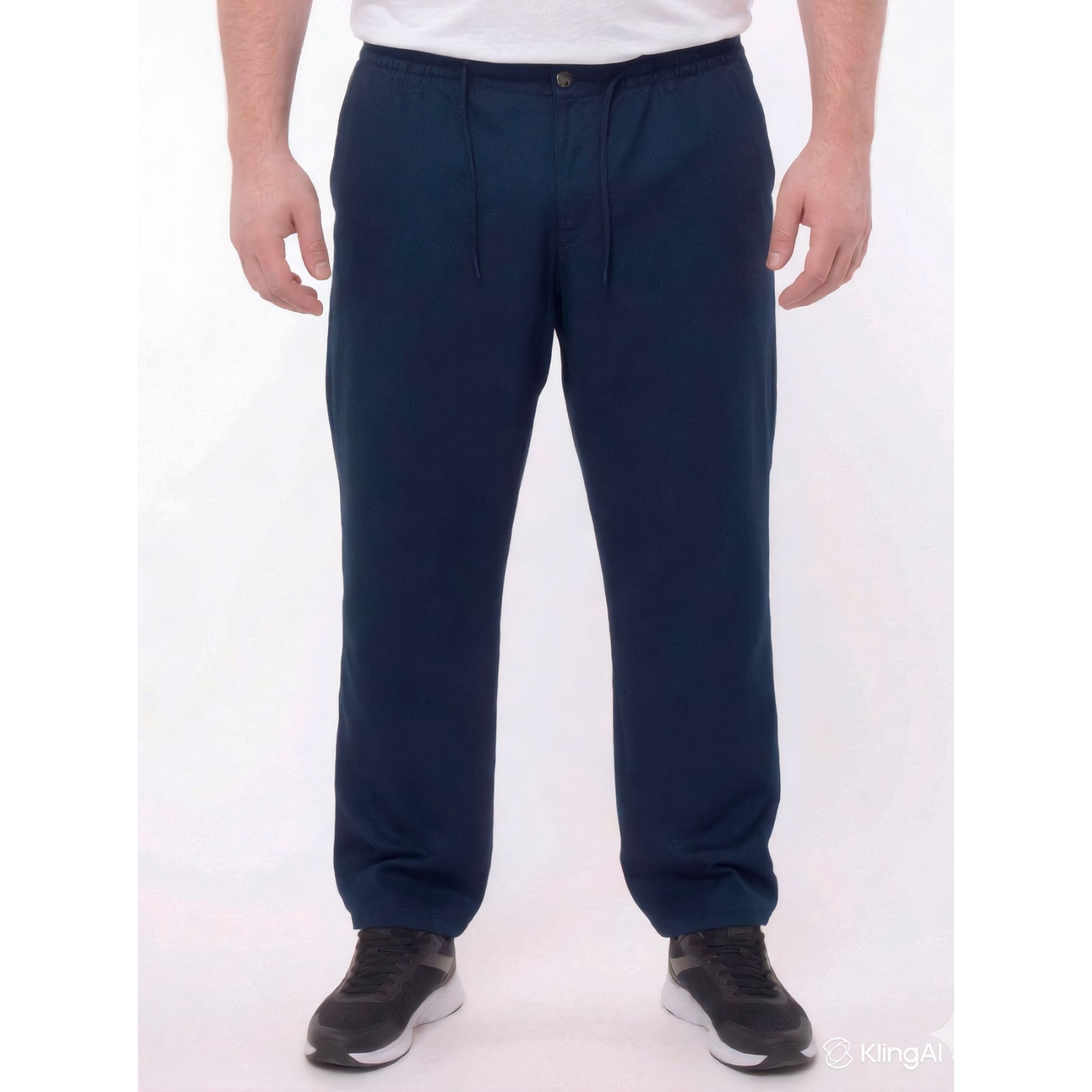 Модель прямого кроя из смесового льна, пояс на резинке, дополнен кулиской со шнурком и шлевками, застежка на молнии, карманы. Состав - 55%лен, 42%хлопок, 3%эластан