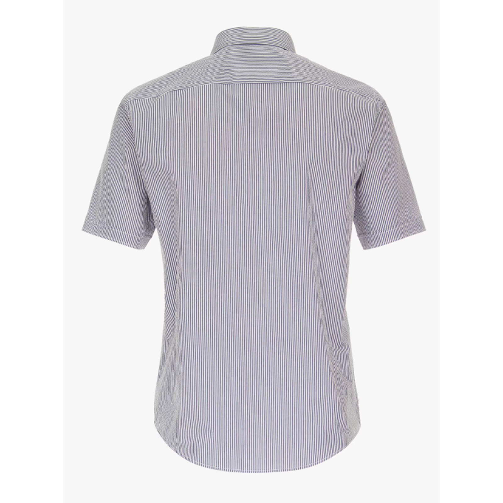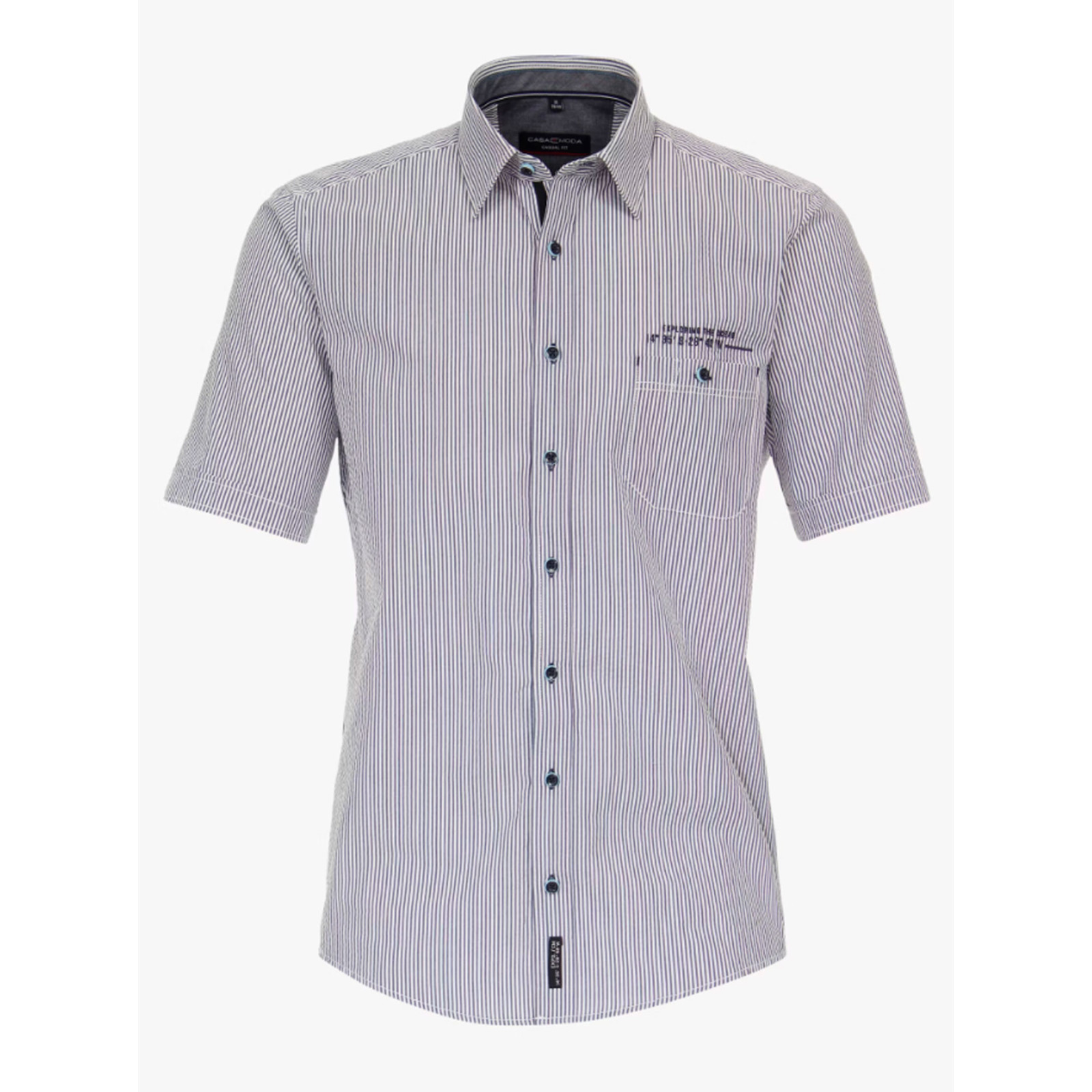 Модель из хлопка в полоску, отложной воротник, короткий рукав, застежка на пуговицах, нагрудный карман, контратные надписи. Состав - 100%хлопок