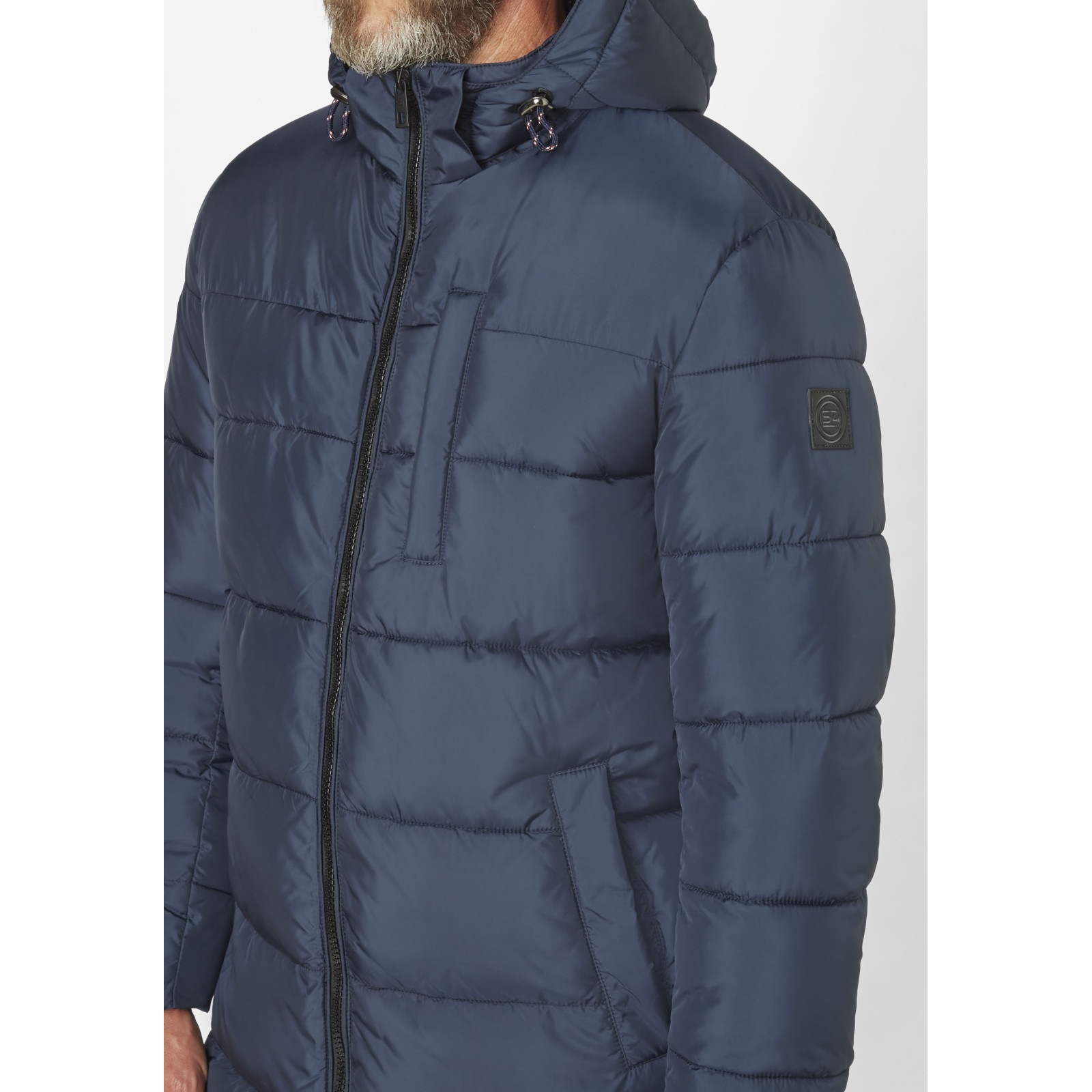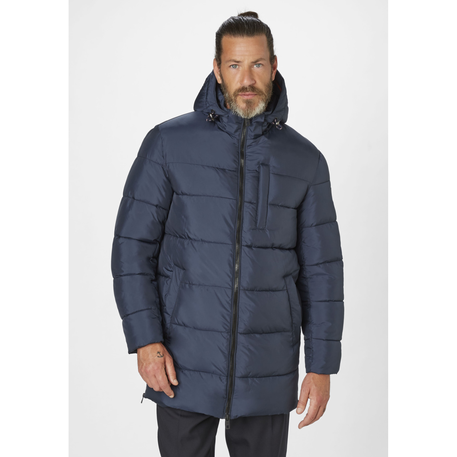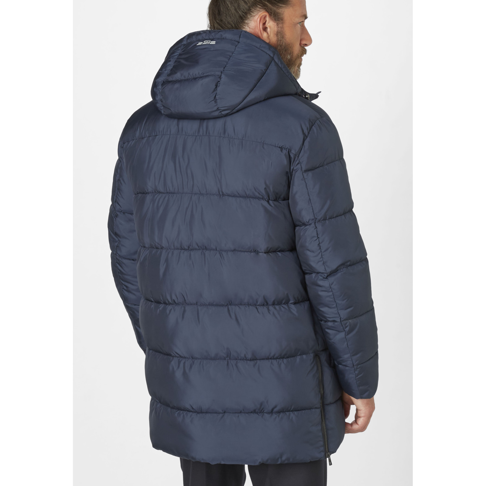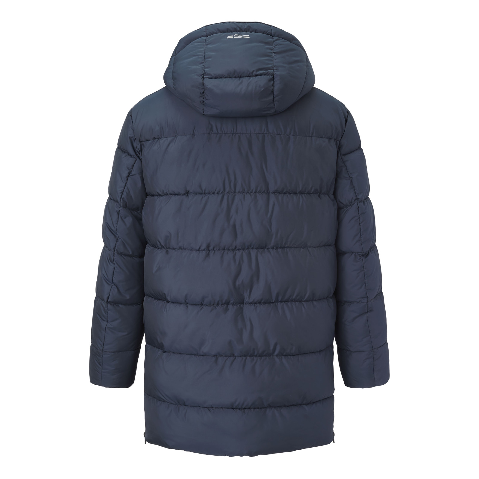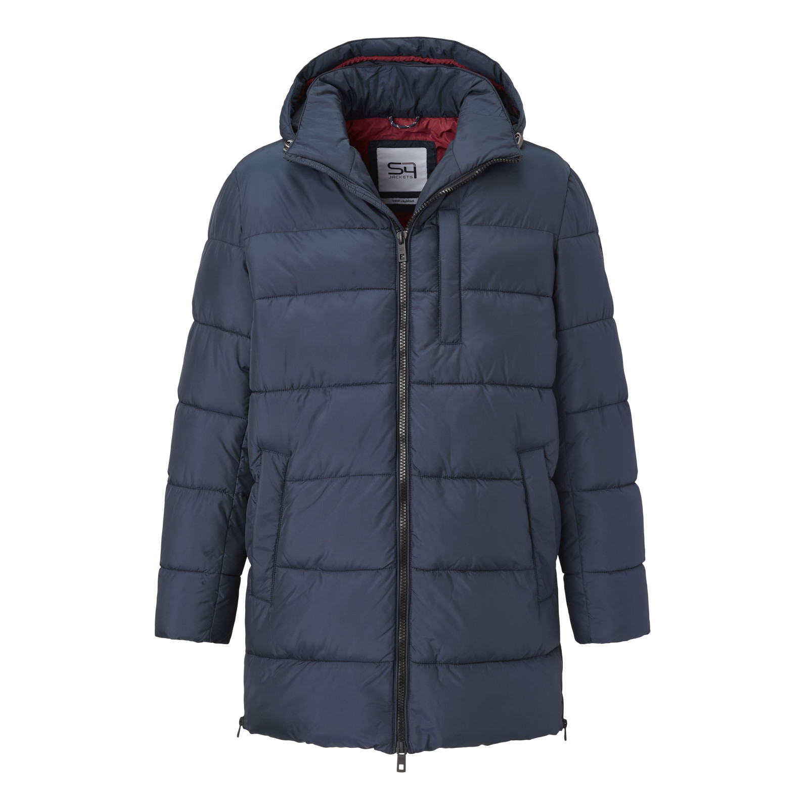 Стеганная модель с капюшоном, воротник-стойка, застежка и боковые разрезы на молнии, карманы. Состав - 100% полиэстер
