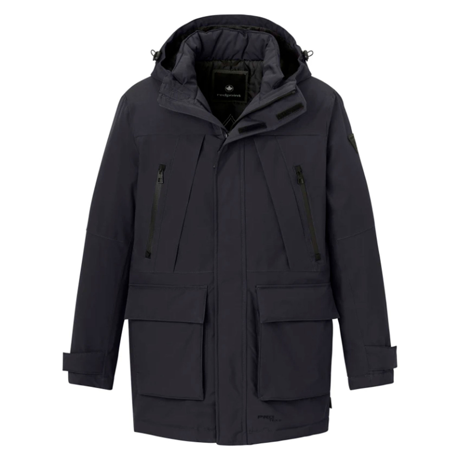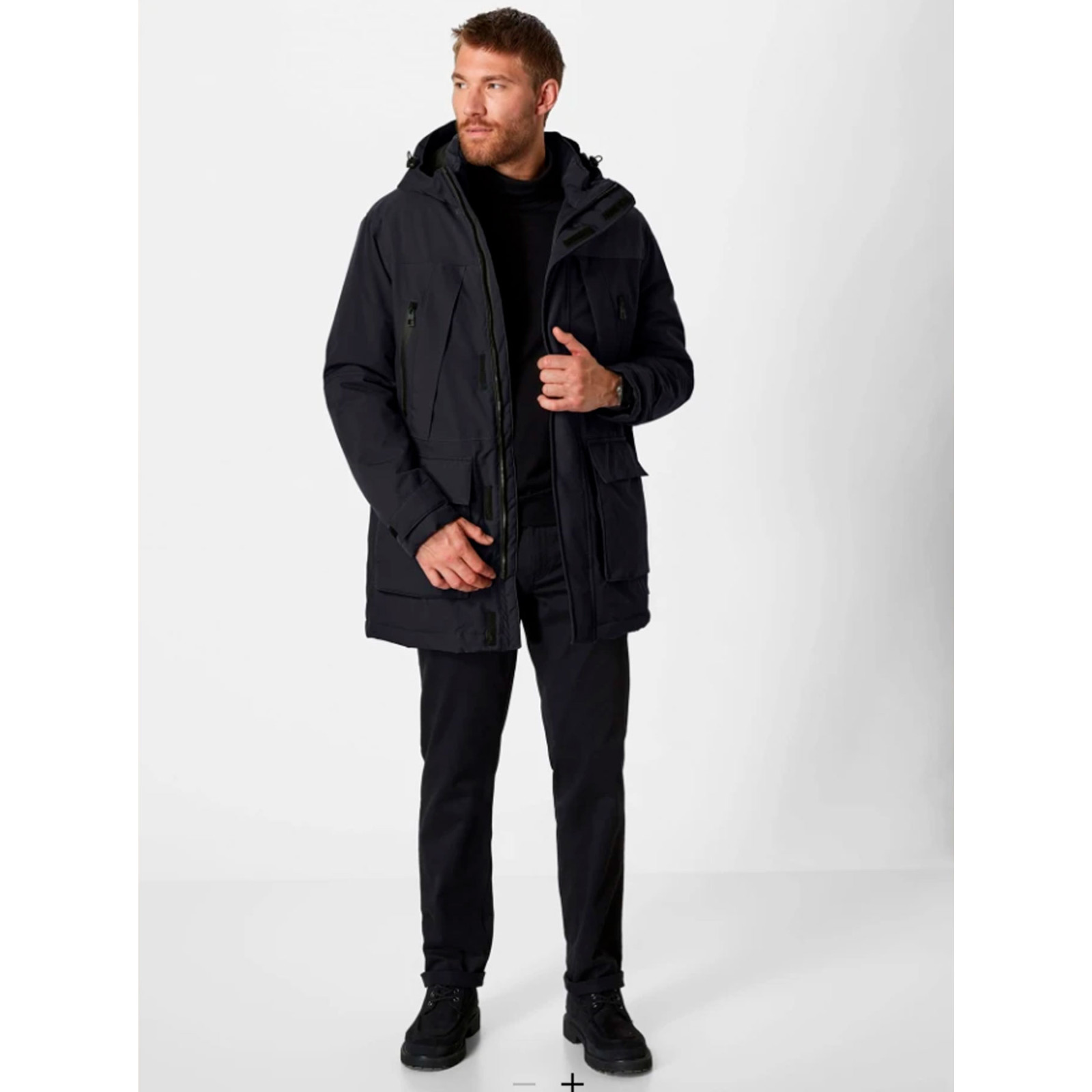 Подовжена модель з капюшоном, комір-стійка, застібка на блискавці та на планці, накладні кишені з клапанами, прорізні-на блискавках, рукави з патами на липучках. Склад - 100% поліестер