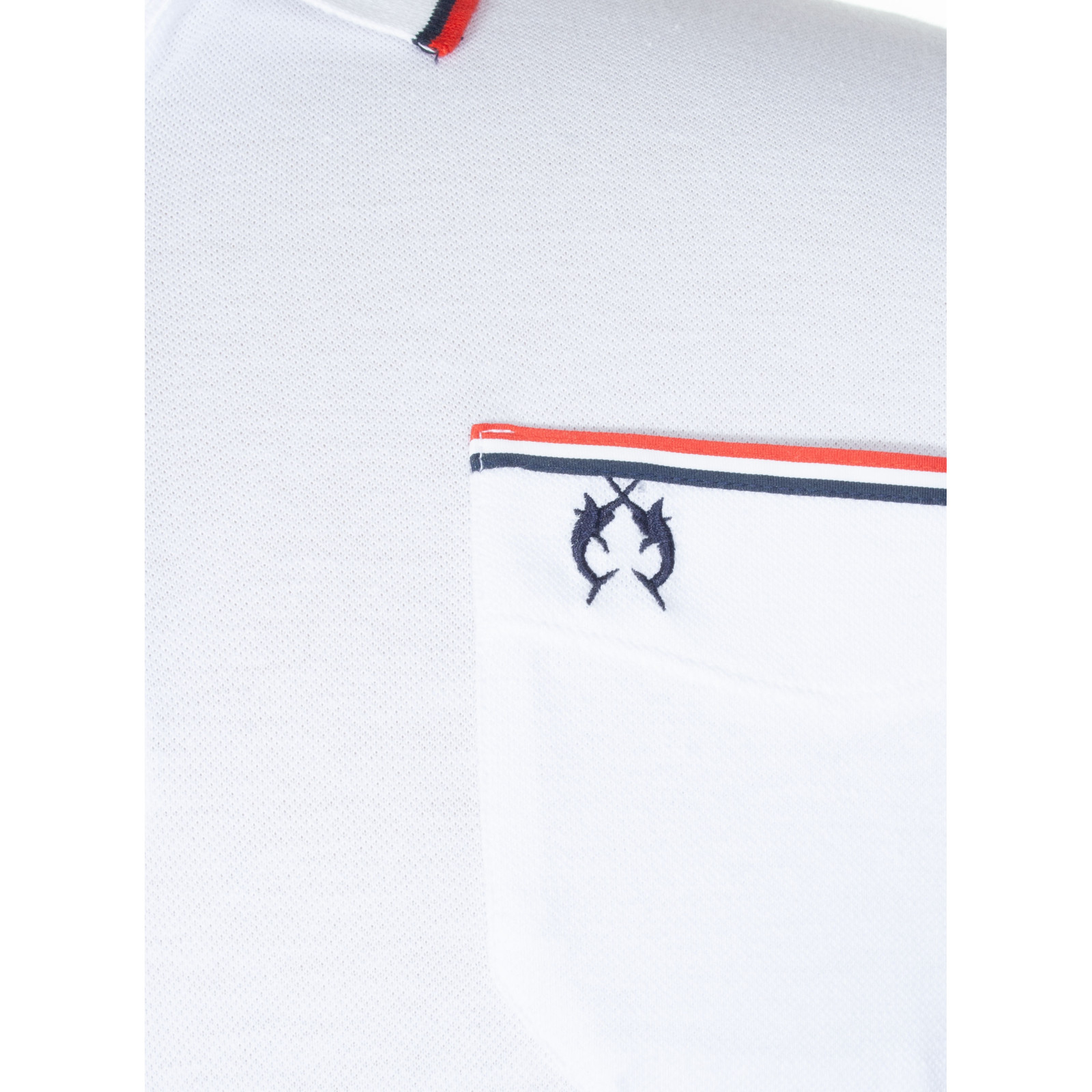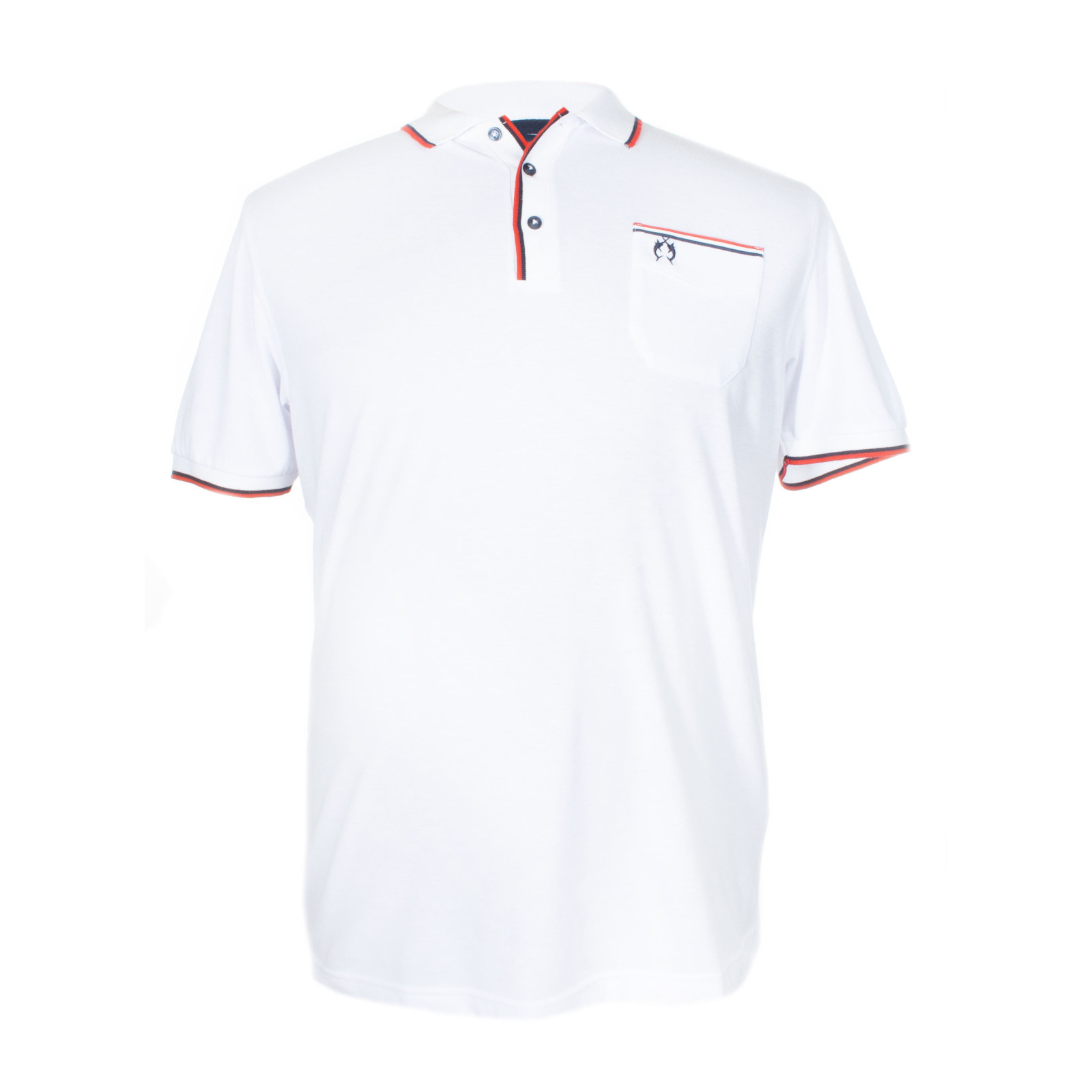 Модель у морському стилі з контрастними смужками, відкладний комір, планка на ґудзиках, нагрудна кишеня, короткий рукав на манжеті. Склад - 55% бавовна, 45% поліестер