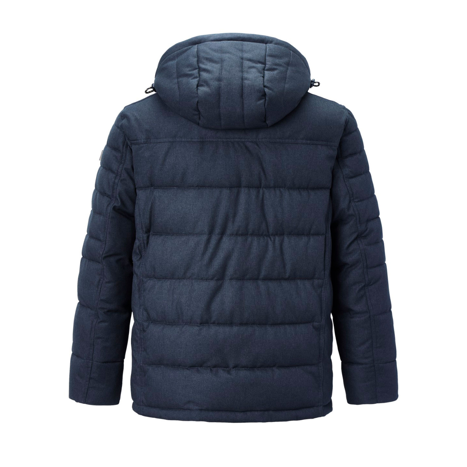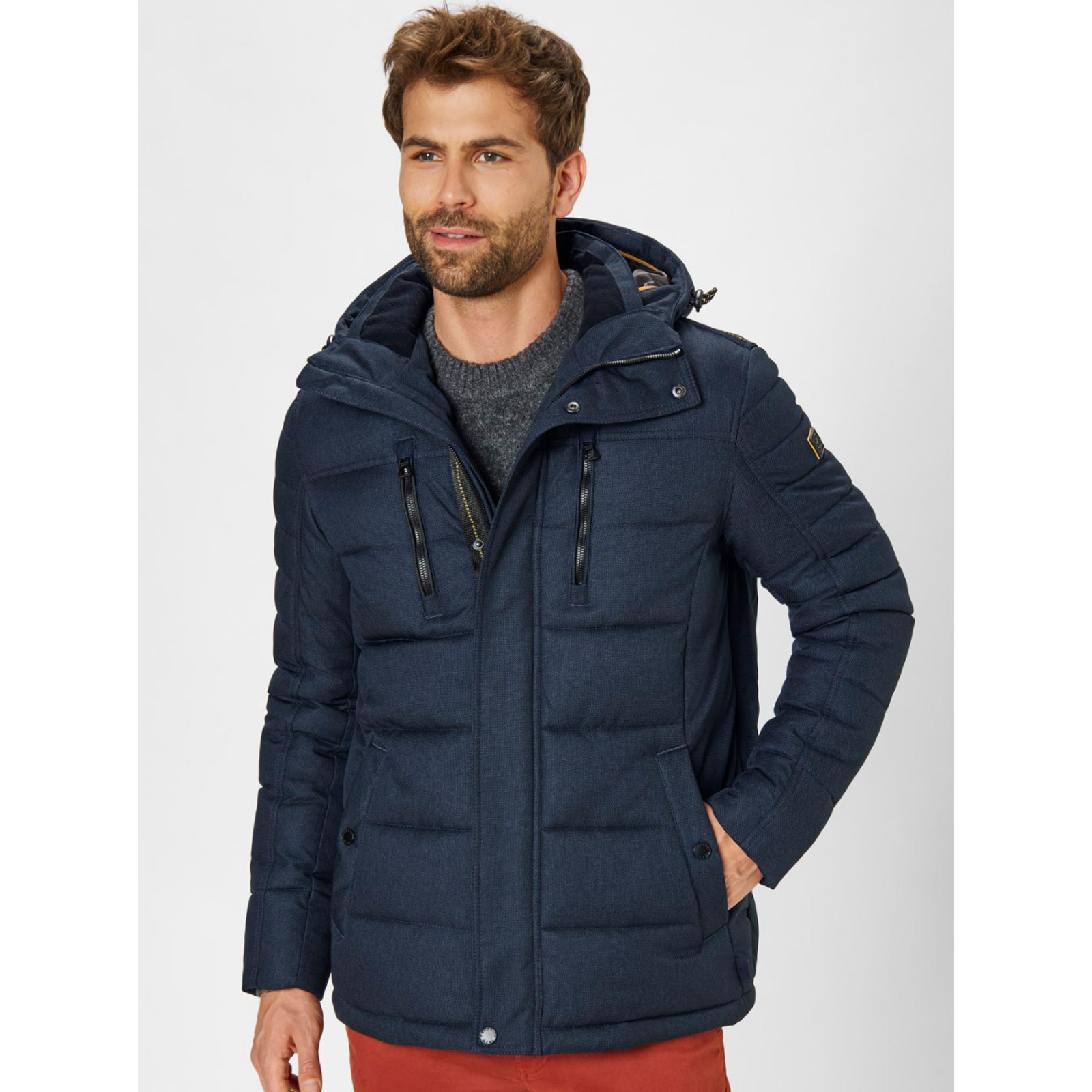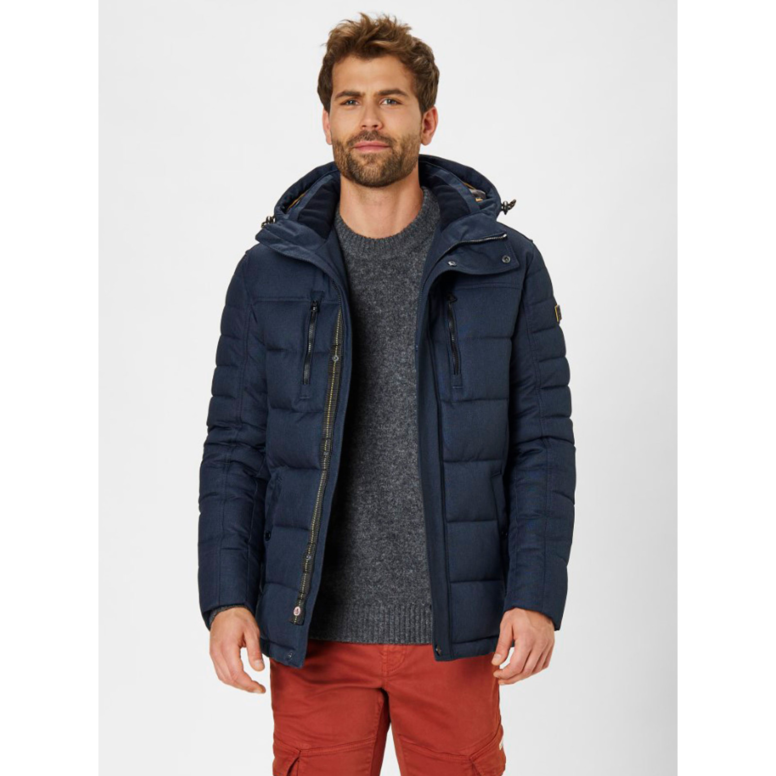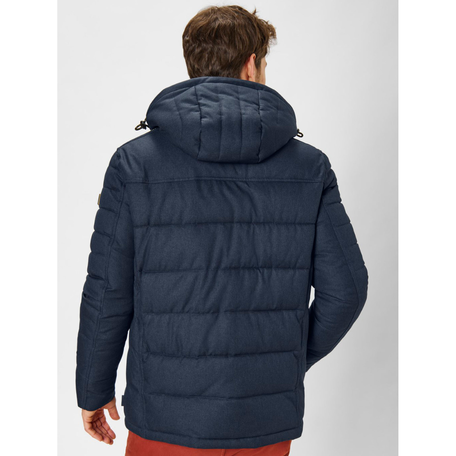 Стьобана модель з капюшоном, відкладний комір, застібка на блискавці та на планці з кнопками, асиметричний нижній край, кишені. Склад - 100% поліестер