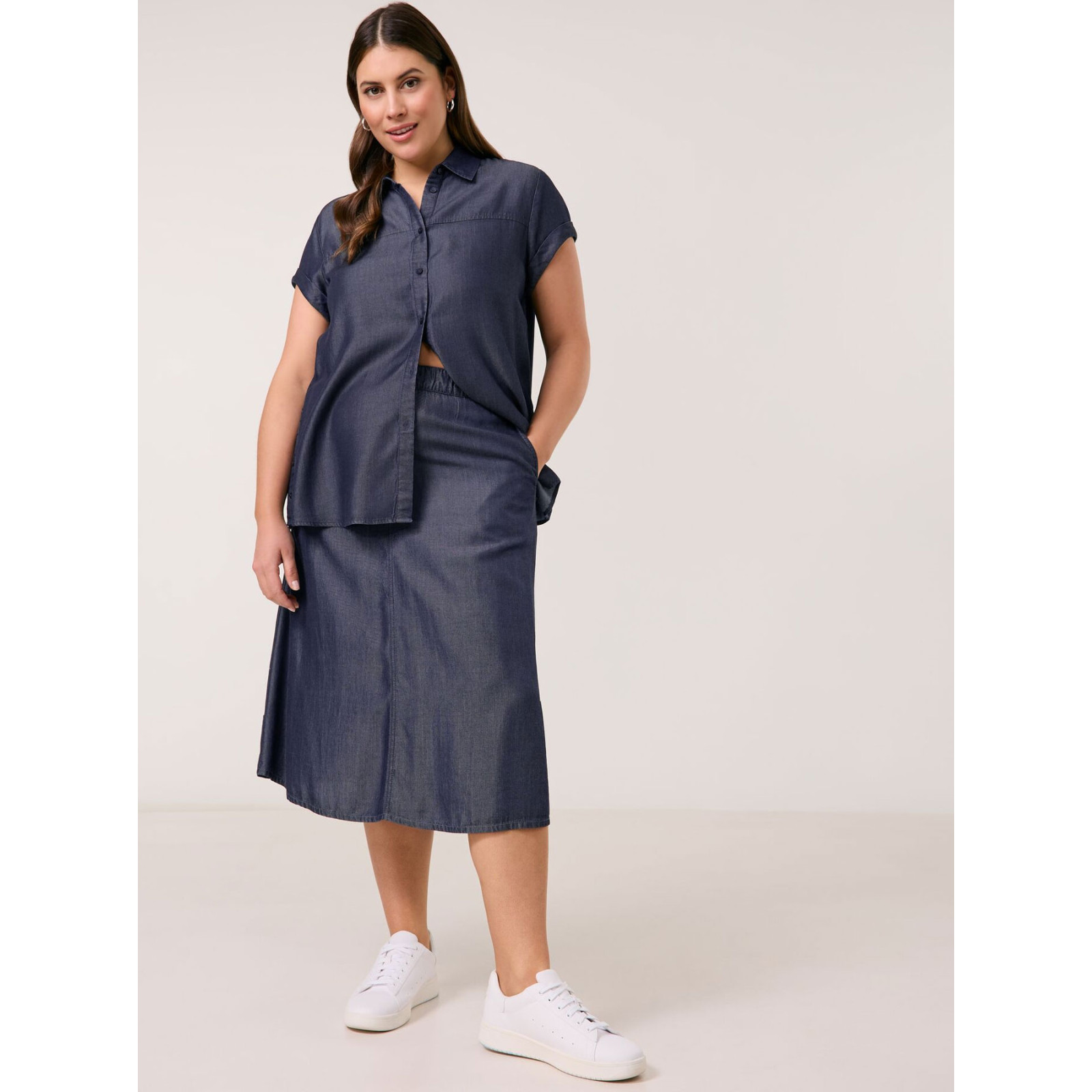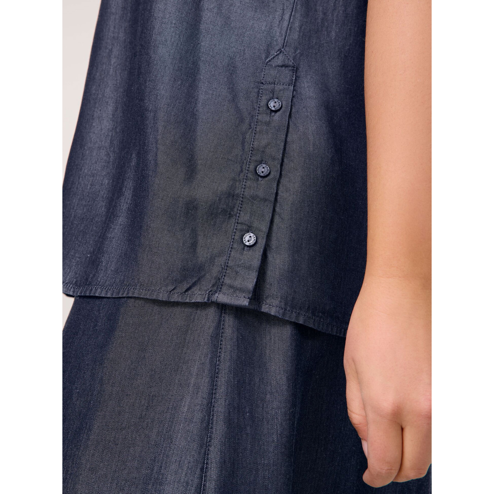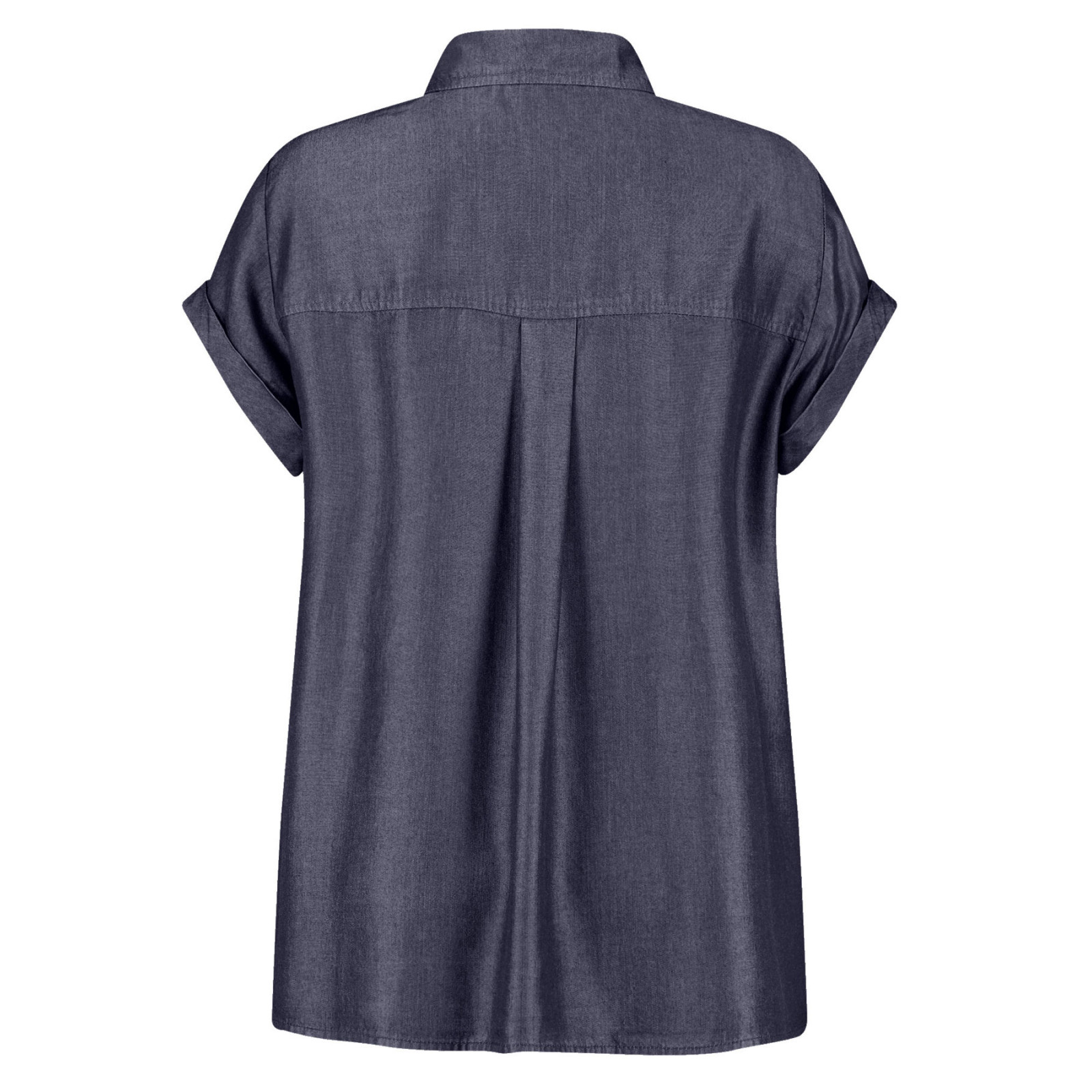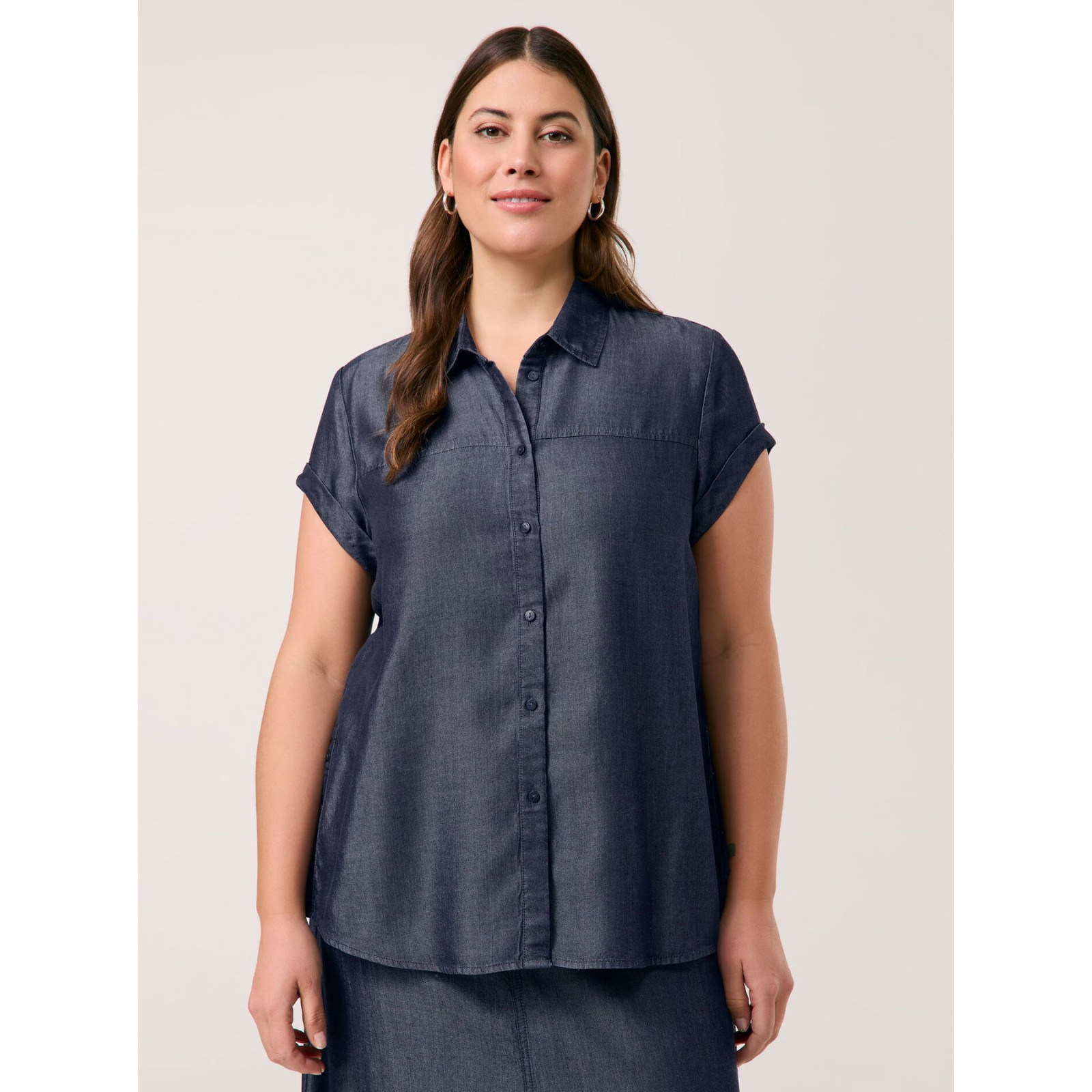 Модель з відкладним коміром, застібка та бічні розрізи на ґудзиках, короткий рукав із відворотом. Склад - 100% ліоцел