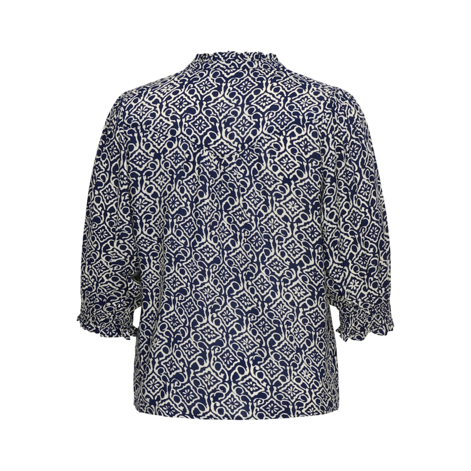 Модель з віскози з контрастним орнаметом, V-подібний виріз горловини декорований рюшем, застібка на ґудзиках, рукави 3/4 прилаштовані на резинки. Склад - 100% віскоза