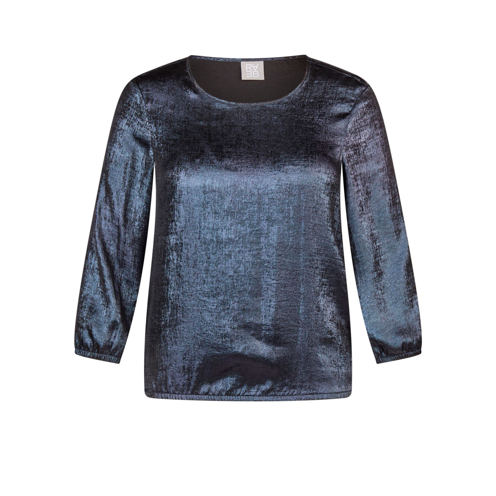 Модель із матеріалу з відливом, круглий виріз горловини, рукави та нижній край прилаштовані на резинку. Склад - 100% поліестер
