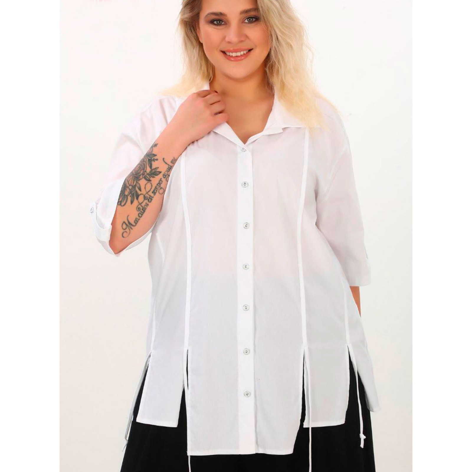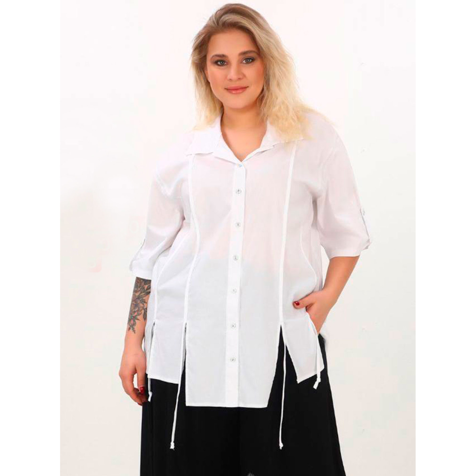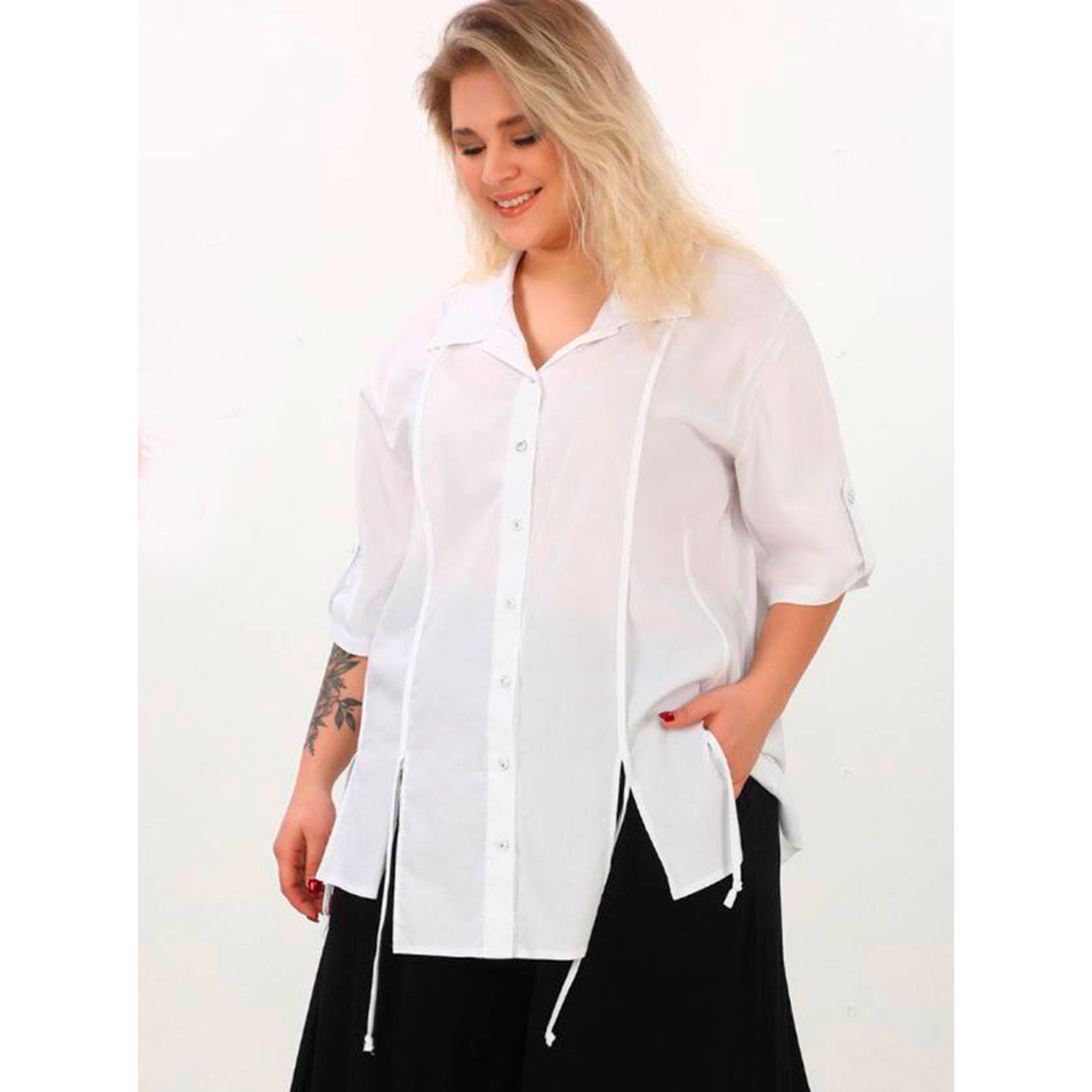 Модель сорочкового крою з асиметричним нижнім краєм, розрізами та зав'язками, відкладний комір, застібка на ґудзиках, короткий рукав регулюється патами. Склад - 74% бавовна, 23% поліамід, 3% еластан