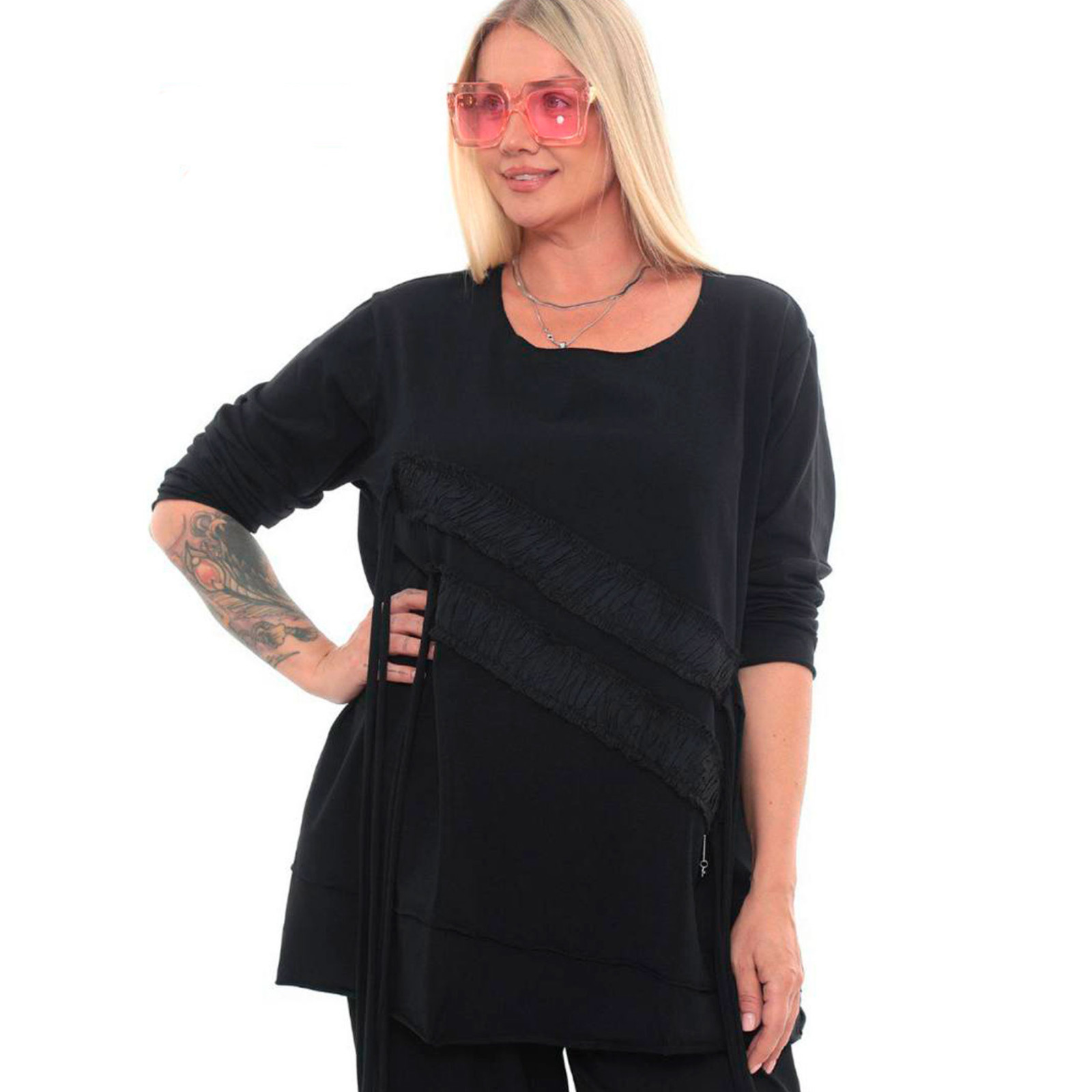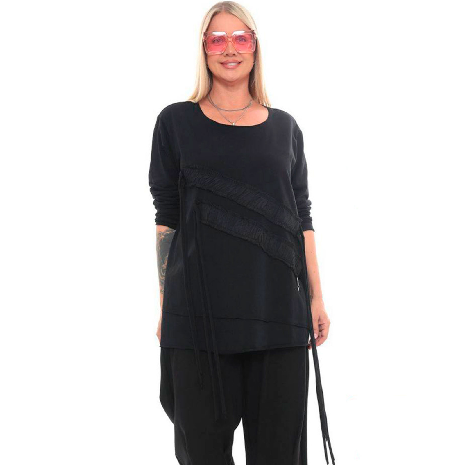 Подовжена модель із сумішевої бавовни, круглий виріз горловини, довгий рукав, перед декоровано аплікацією зі стрічок. Склад - 95% бавовна, 5% еластан