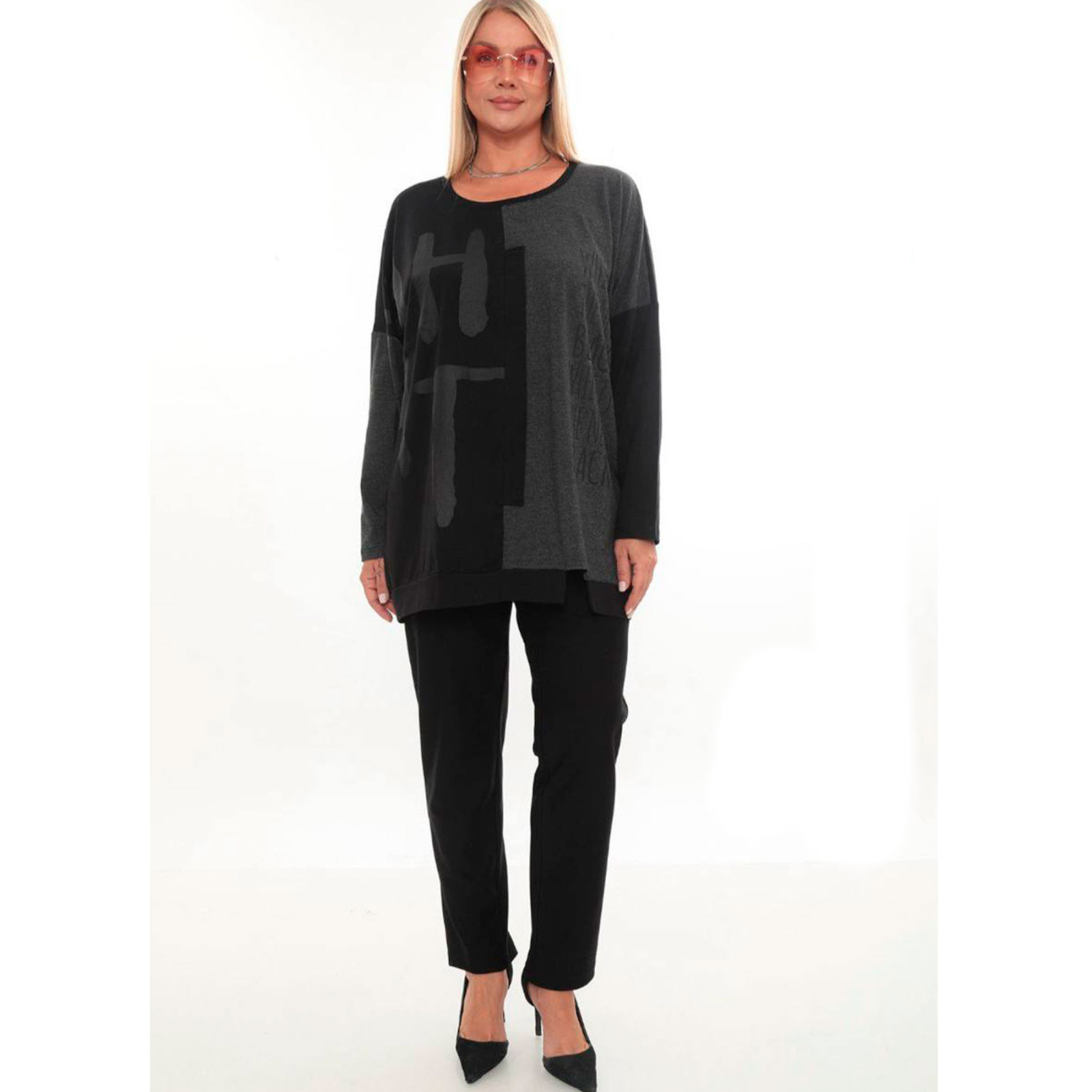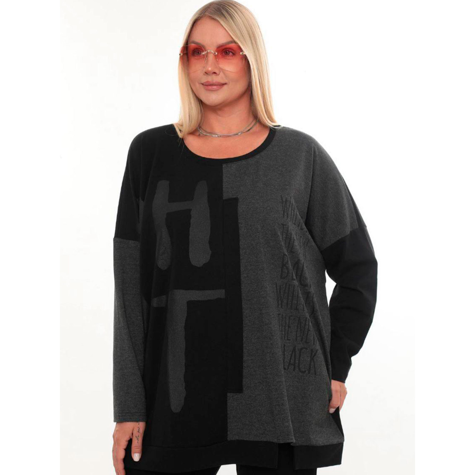 Комбінована модель з написами з бавовни, вільний крій, круглий виріз горловини, довгий рукав. Склад - 95% бавовна, 5% еластан