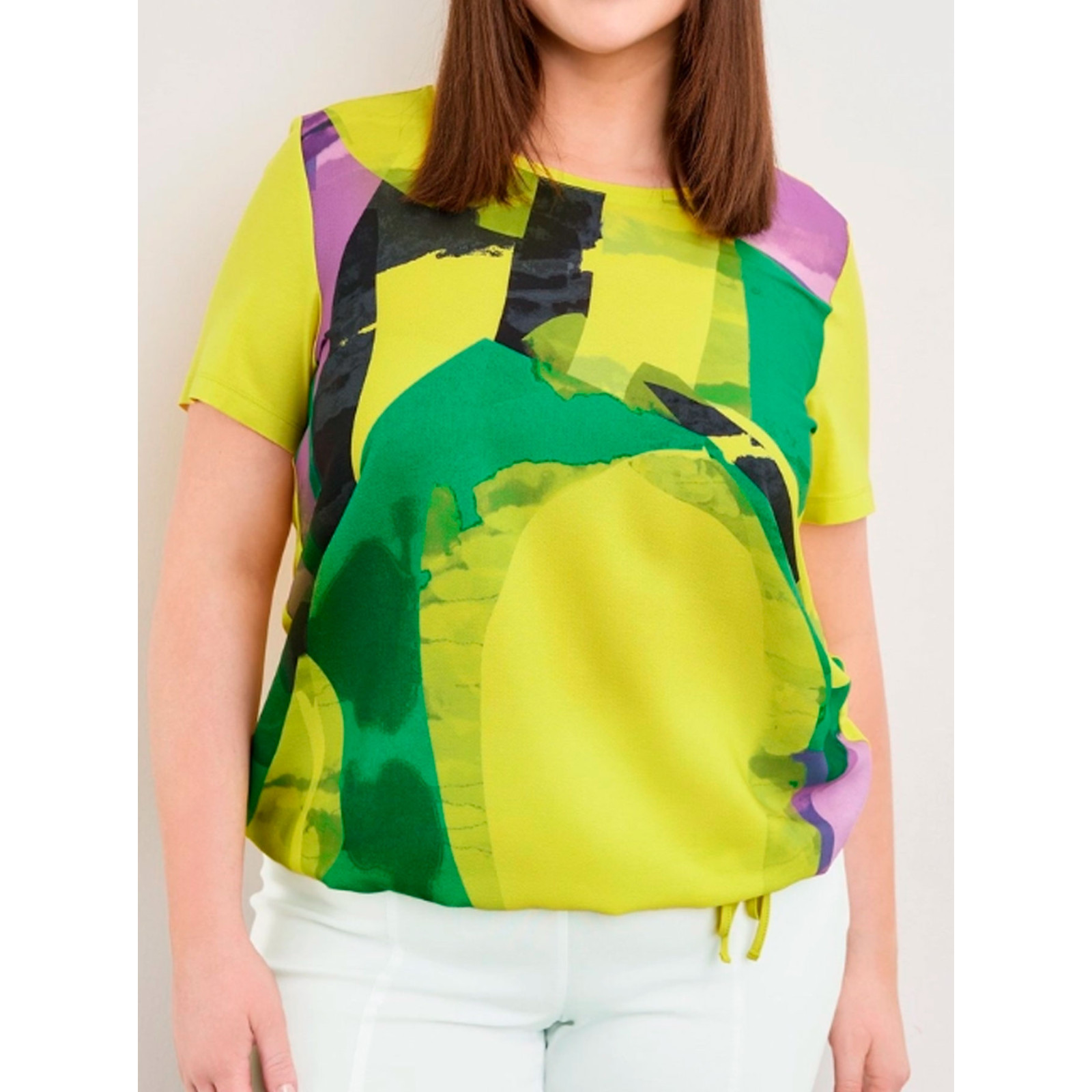 Комбінована модель із змішаної віскози з абстрактним принтом, круглий виріз горловини, короткий рукав, нижній край на кулісці із зав'язкою. Склад - 92% віскоза, 8% еластан