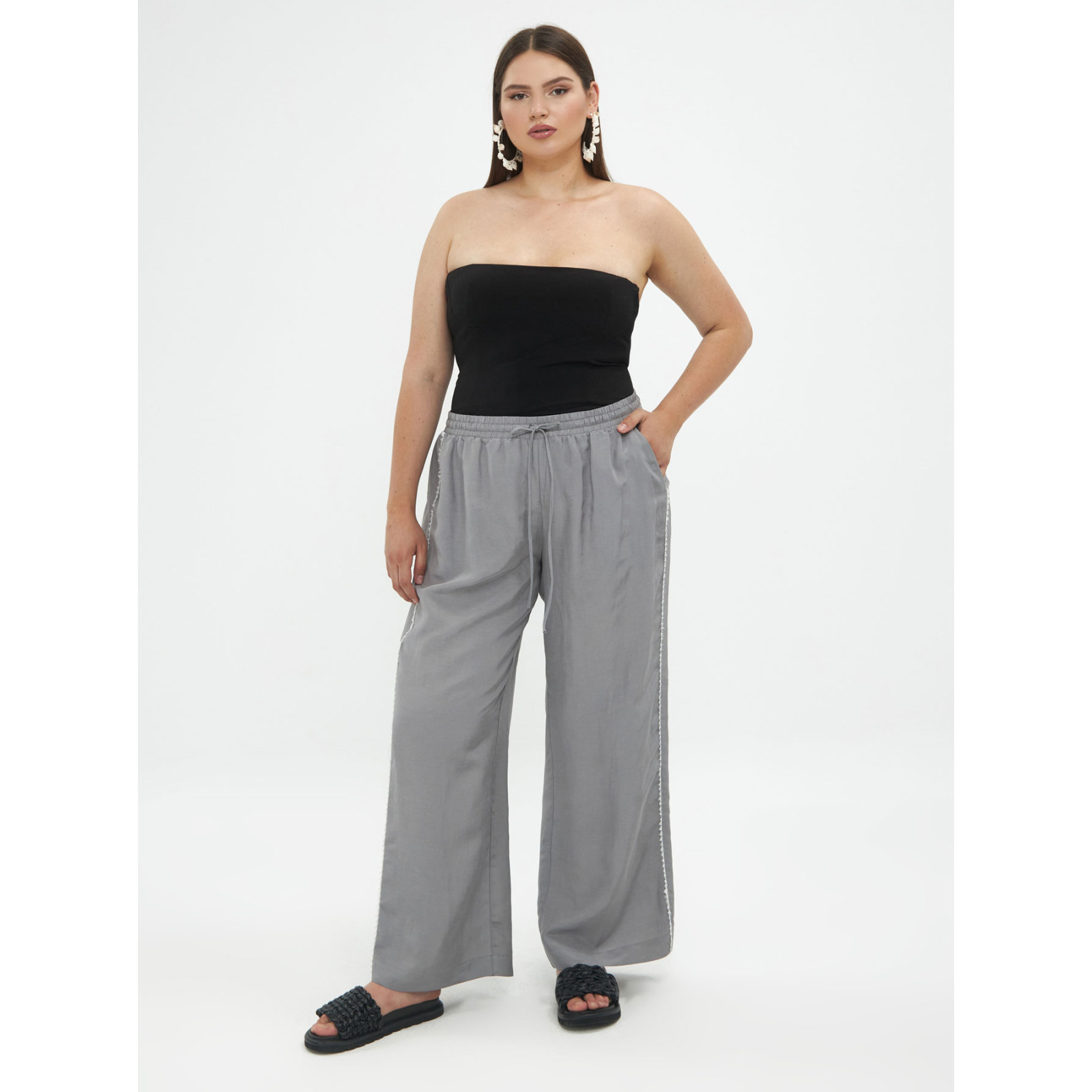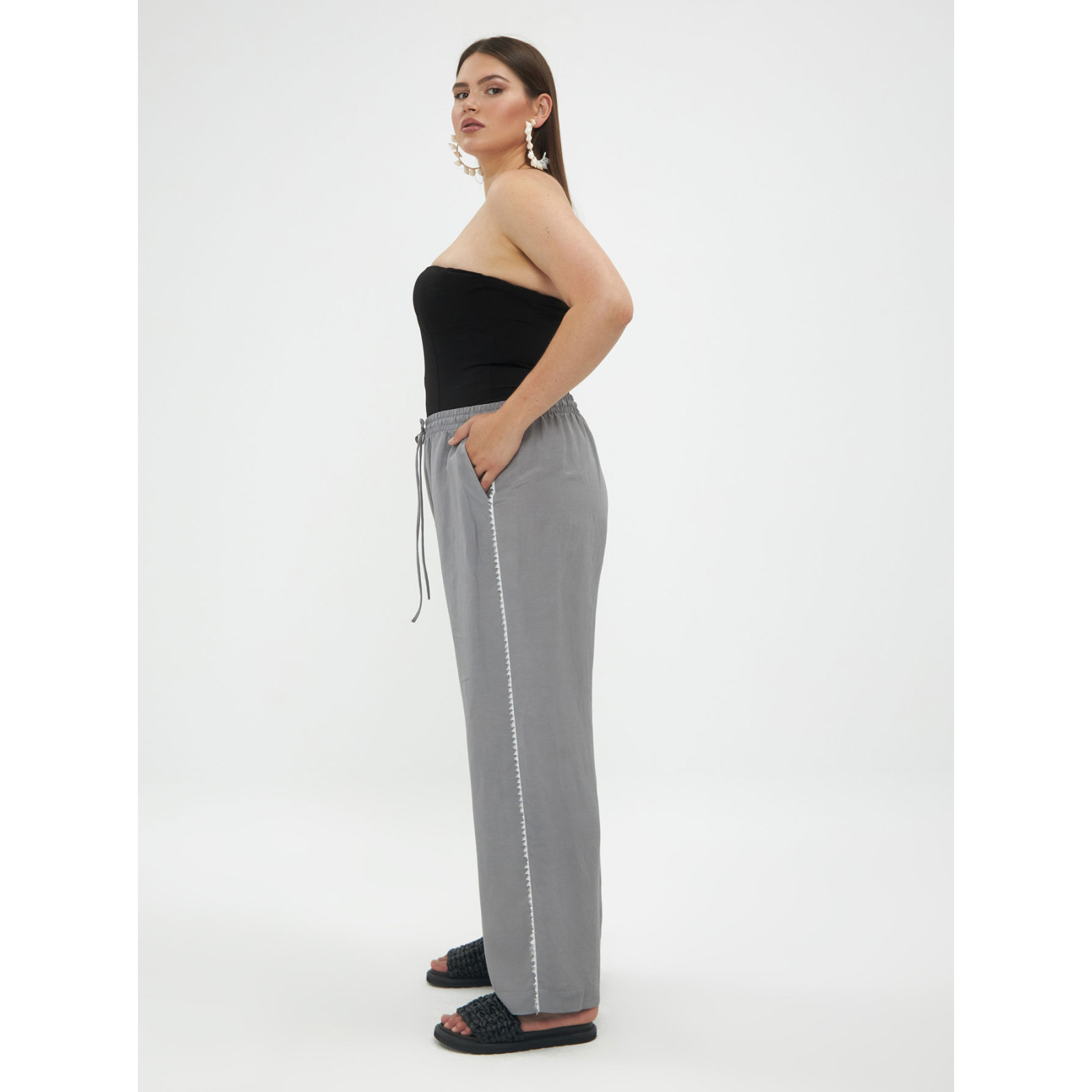 Модель широкого крою із змішаного льону, пояс на резинці зі шнурком, кишені, з боків лампаси з тасьми контрастного кольору. Склад - 59% віскоза, 41% льон
