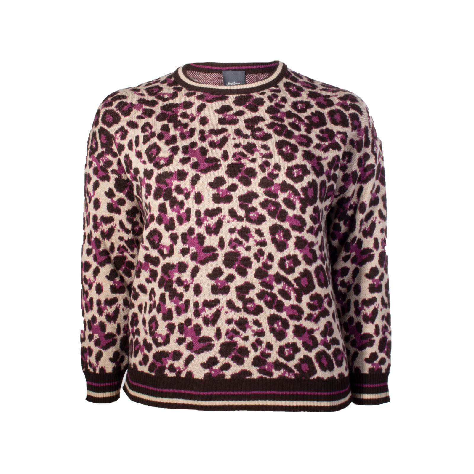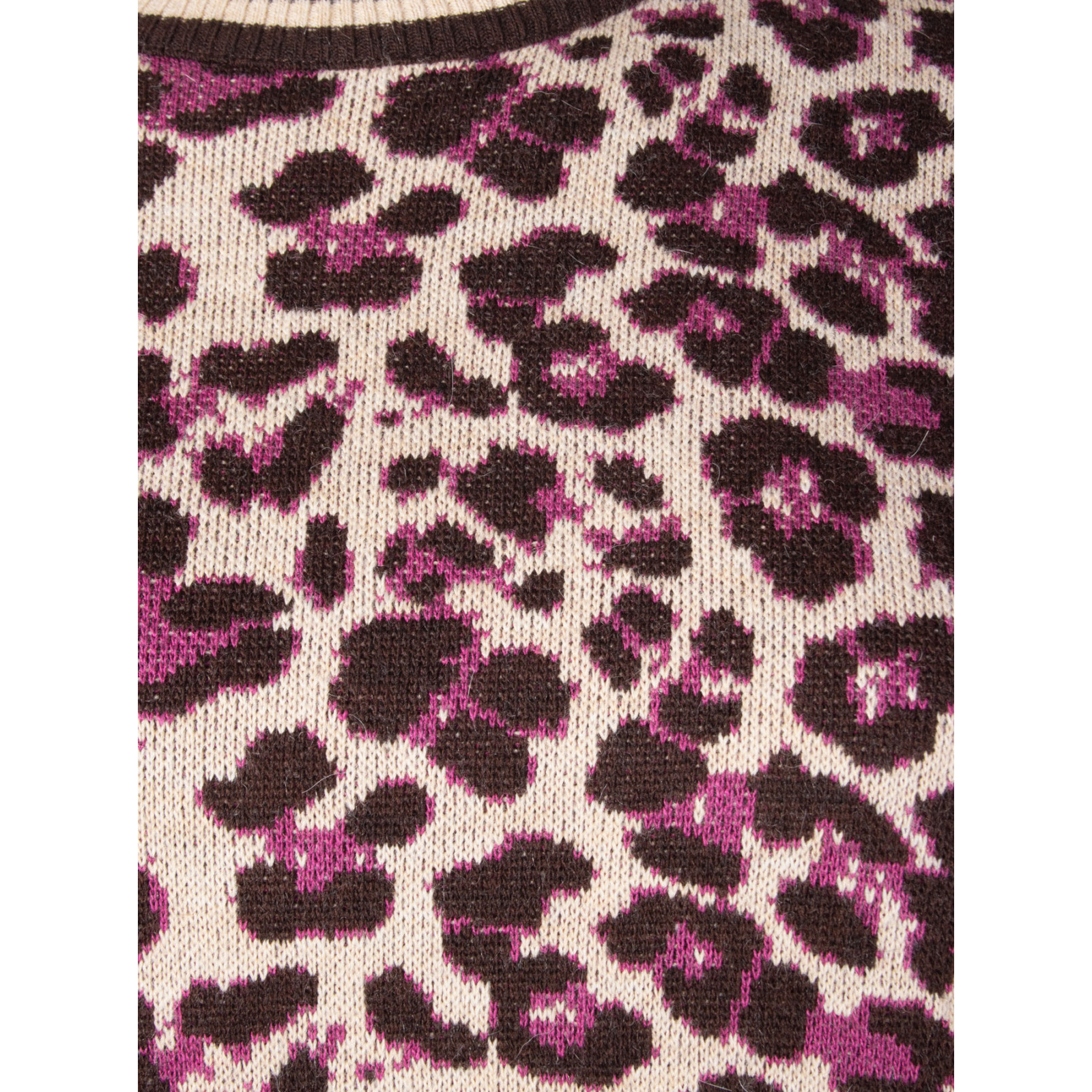 Модель із змішаної пряжі з додаванням вовни, анімалістичний принт, круглий виріз горловини, довгий рукав та нижній край на манжетах. Склад - 80% акрил, 10% вовна, 5% альпака, 5% віскоза
