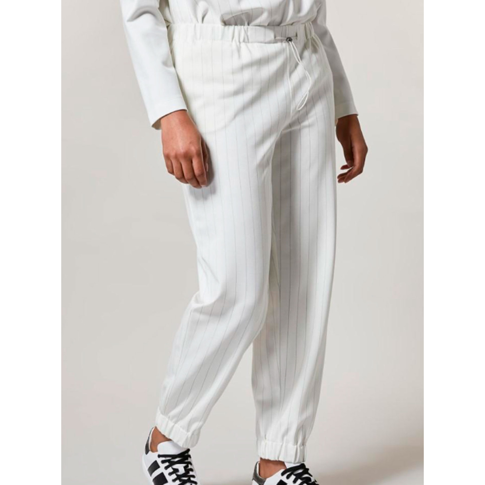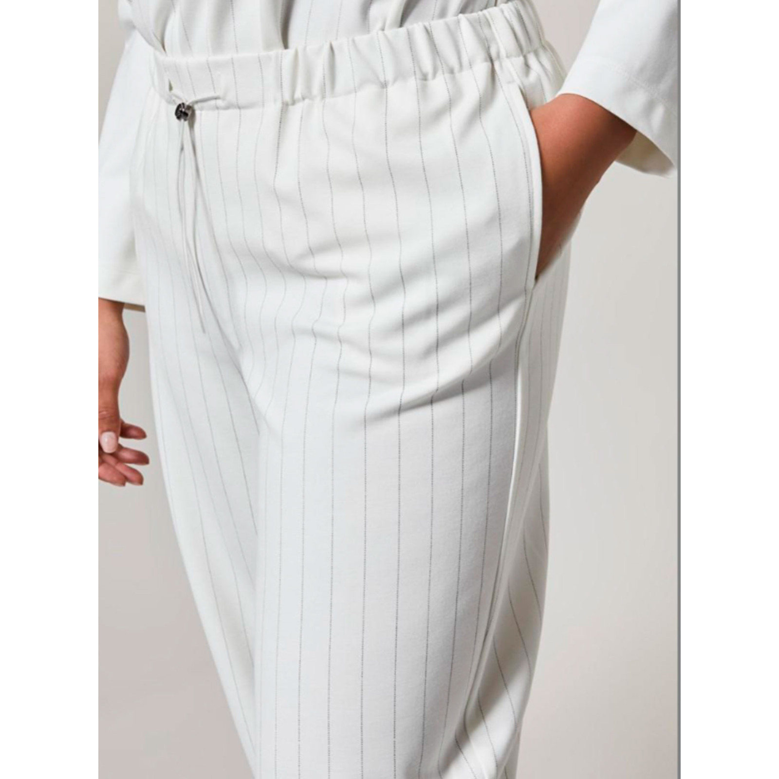 Модель з манжетами на резинці з віскози в смужку, пояс на резинці зі шнурком, бічні кишені. Склад - 65% віскоза, 30% поліамід, 5% еластан