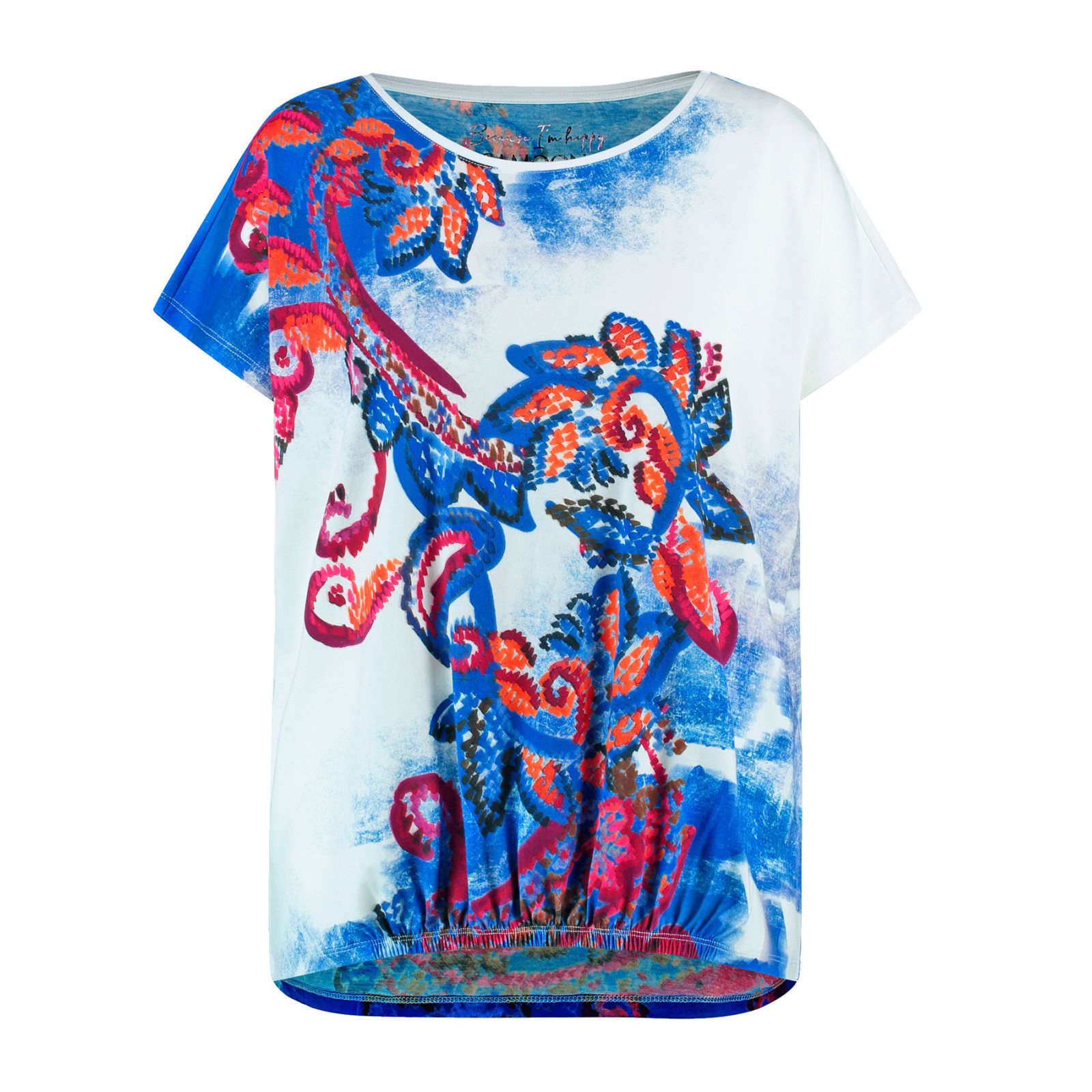 Модель із сумішевої бавовни з розмитим принтом, круглий виріз горловини, короткий рукав. Склад - 47% модал, 47% бавовна, 6% еластан