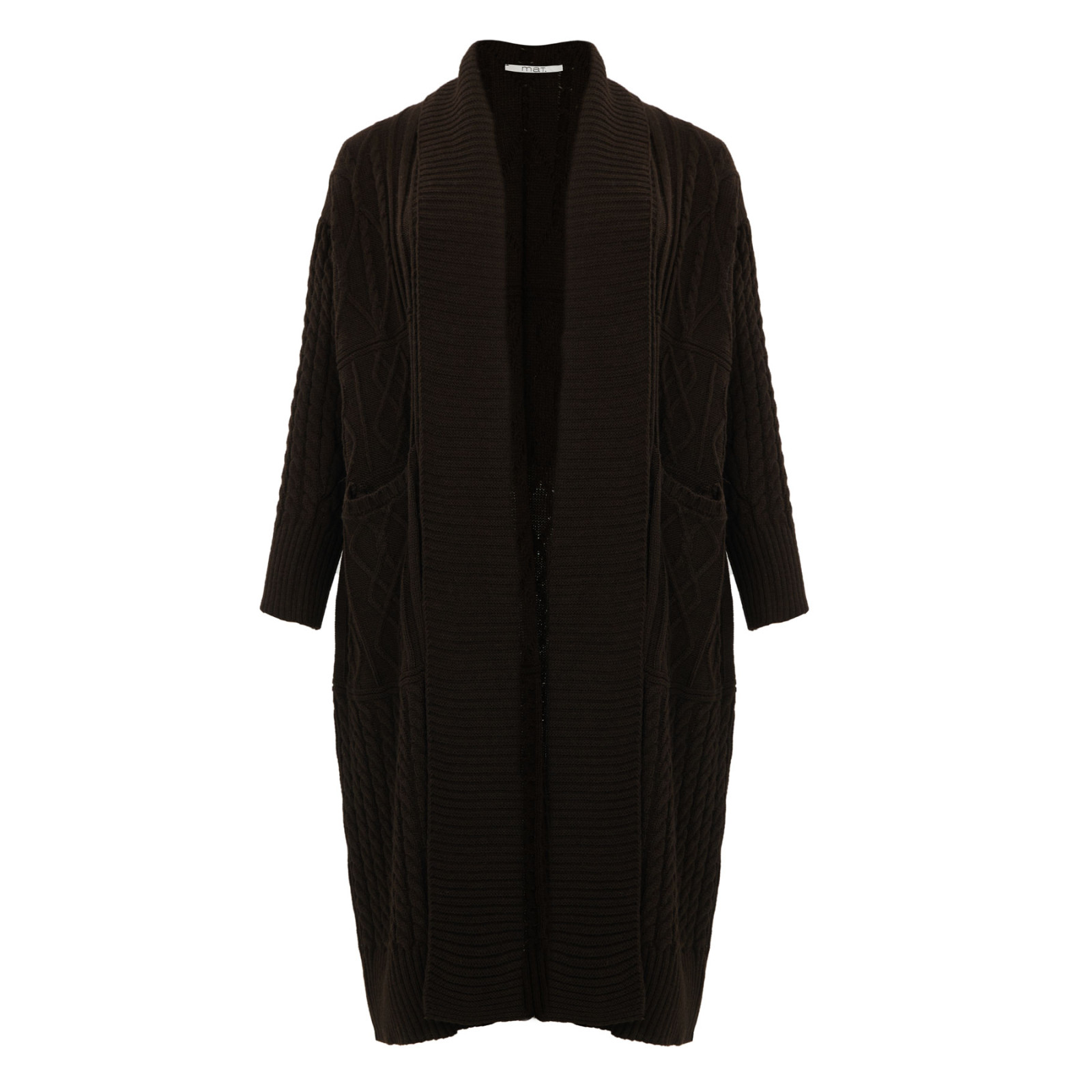 Подовжена модель із пряжі з додаванням вовни альпака, фактурна в'язка, без застібок, довгий рукав, накладні кишені. Склад - 75% акрил, 10% віскоза, 10% вовна, 5% альпака