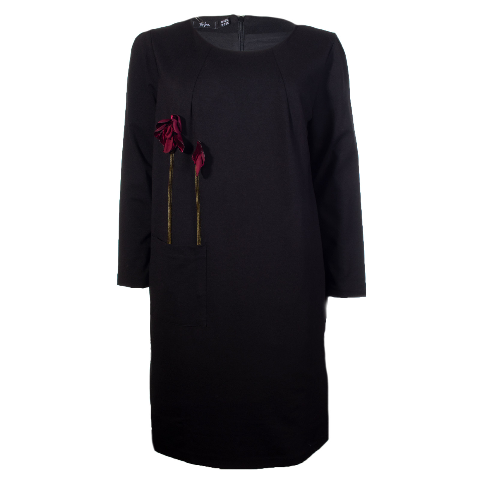 Сукня-футляр середньої довжини із сумішевого матеріалу, довгий рукав, застібка ззаду на блискавці, круглий виріз горловини, декоративна накладна кишеня та аплікація спереду. Склад - 25% поліестер, 72% віскоза, 3% еластан
