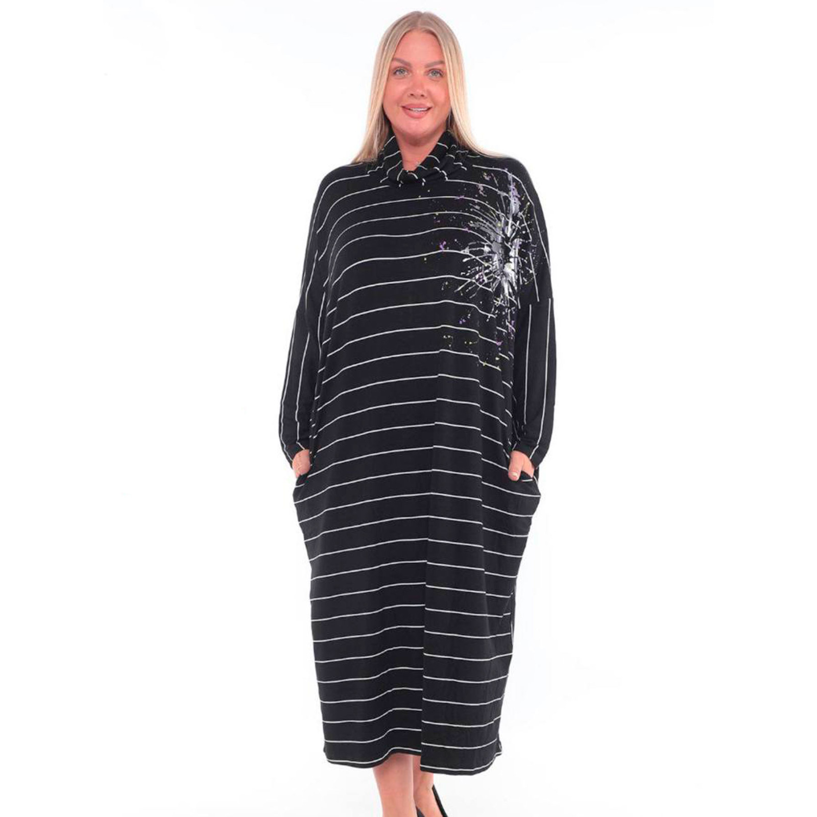 Подовжена модель із сумішової віскози в смужку з абстрактною квіткою, комір-хомут, довгий рукав, бічні кишені. Склад - 95% віскоза, 5% еластан