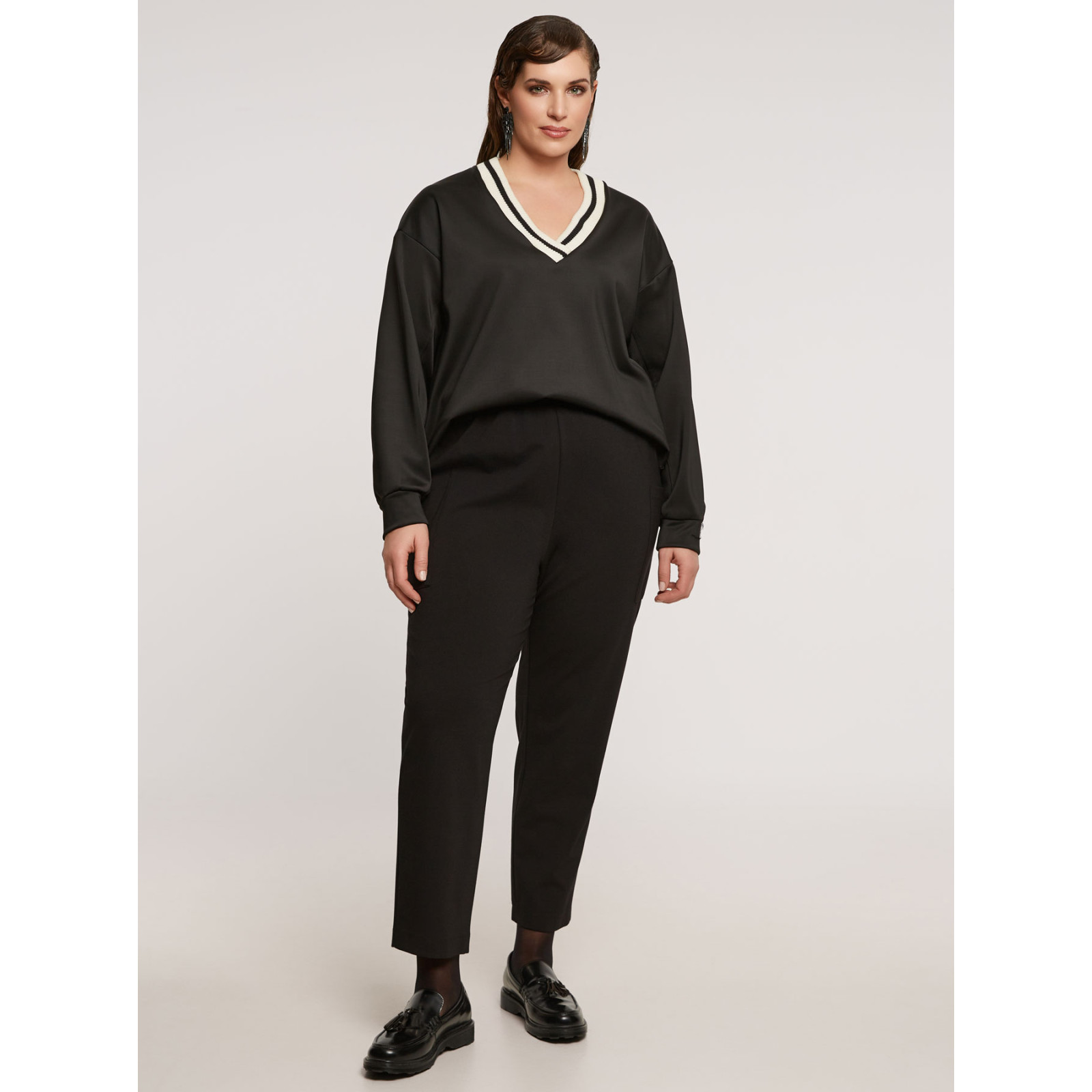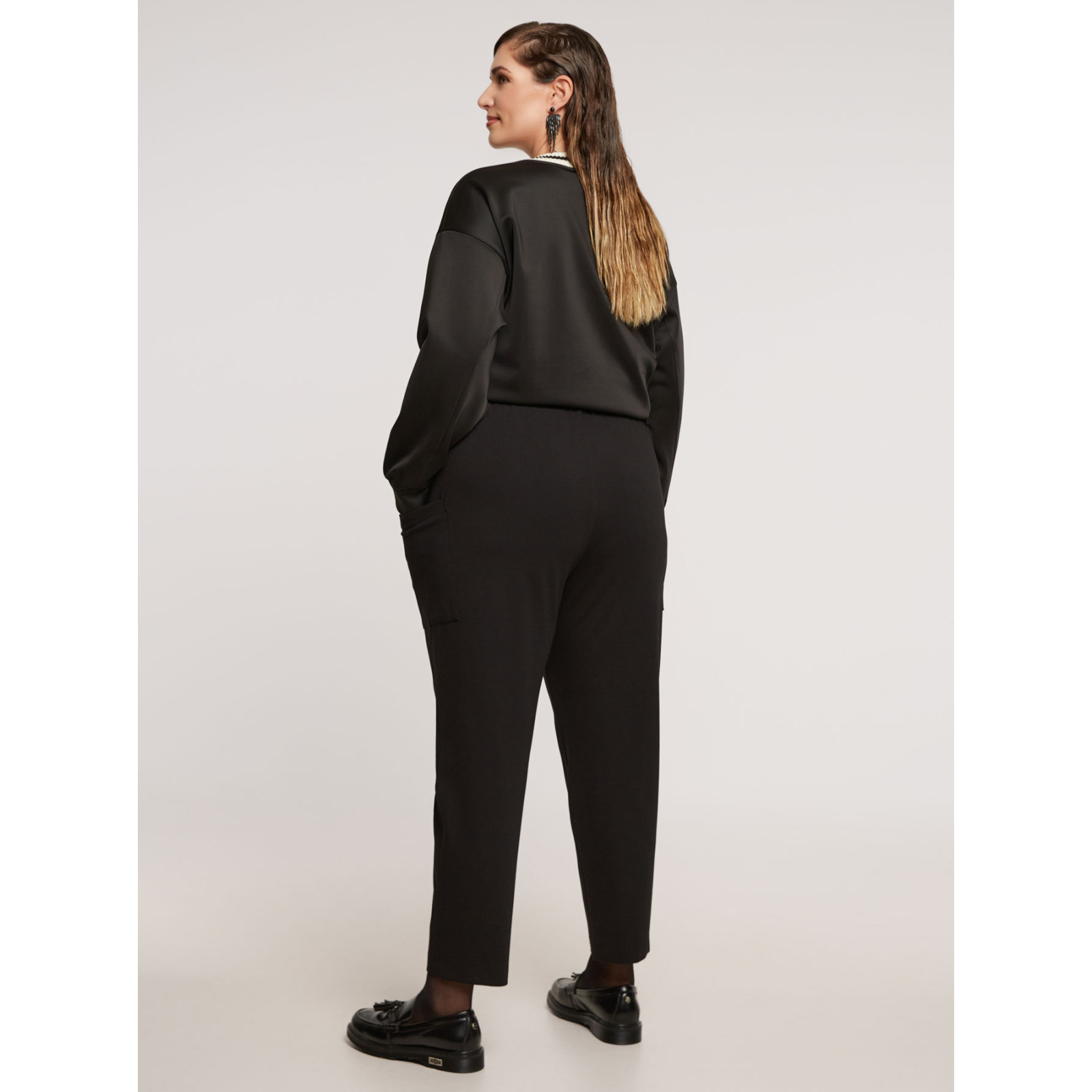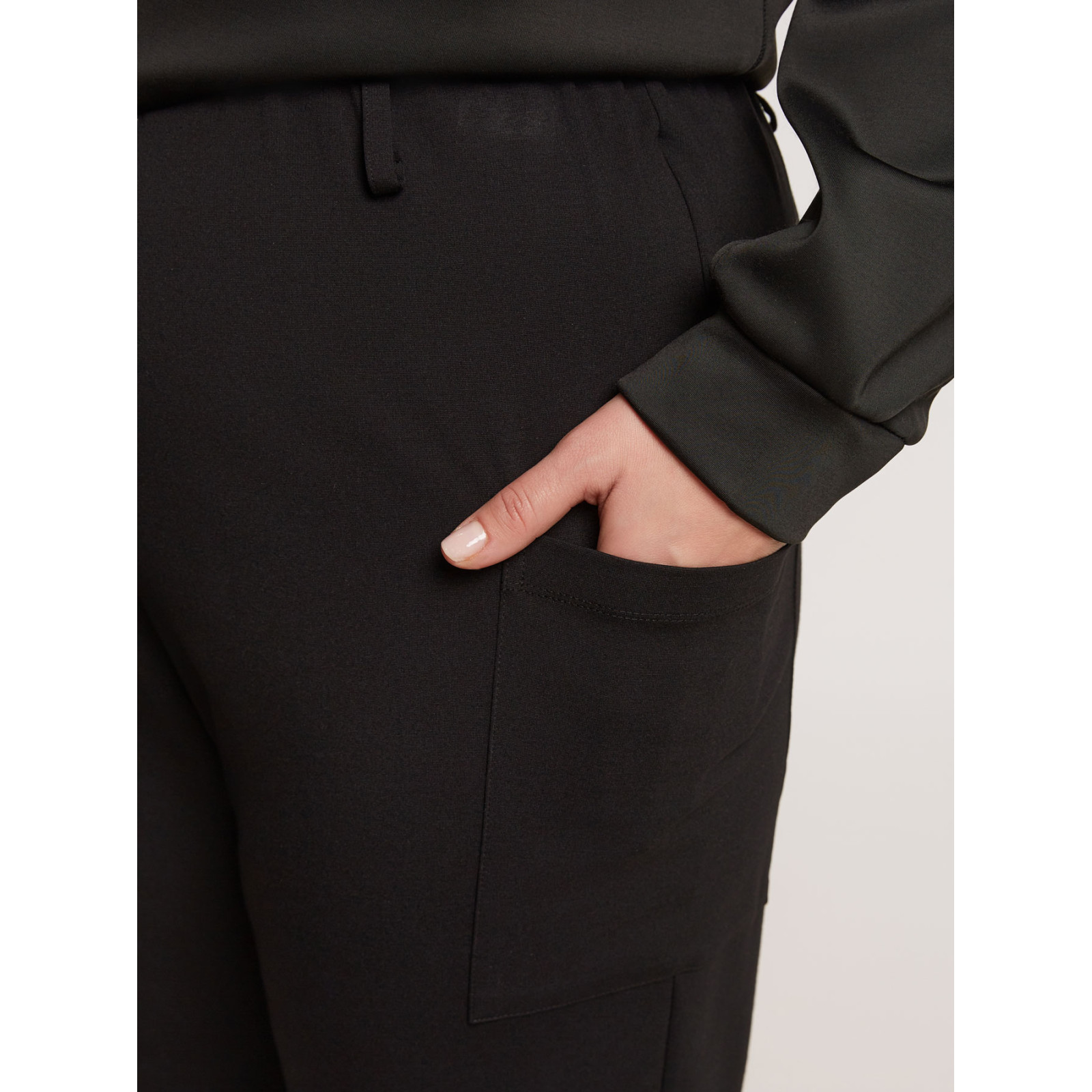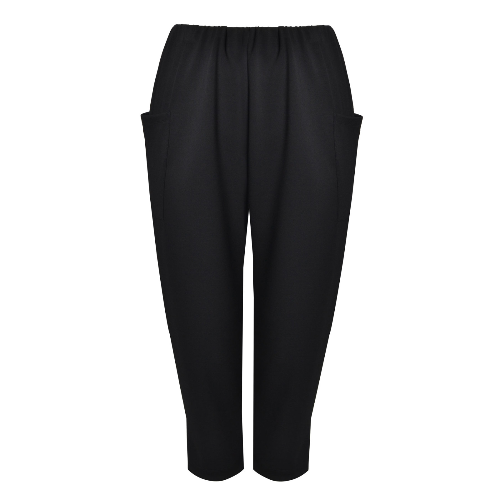 Укорочена модель звуженого крою, пояс на гумці, без застібок, накладні бічні кишені. Склад - 68% віскоза, 27% поліамід, 5% еластан