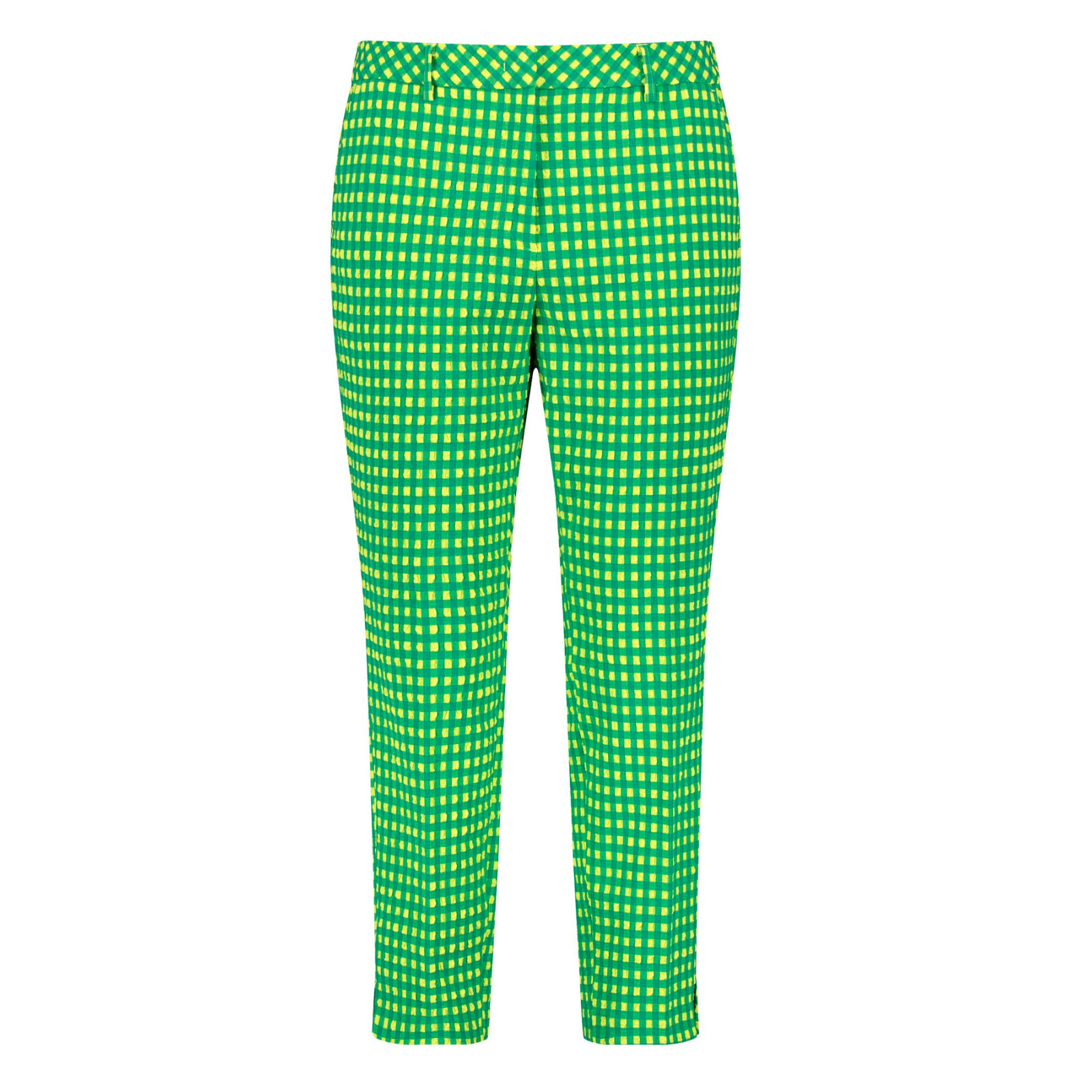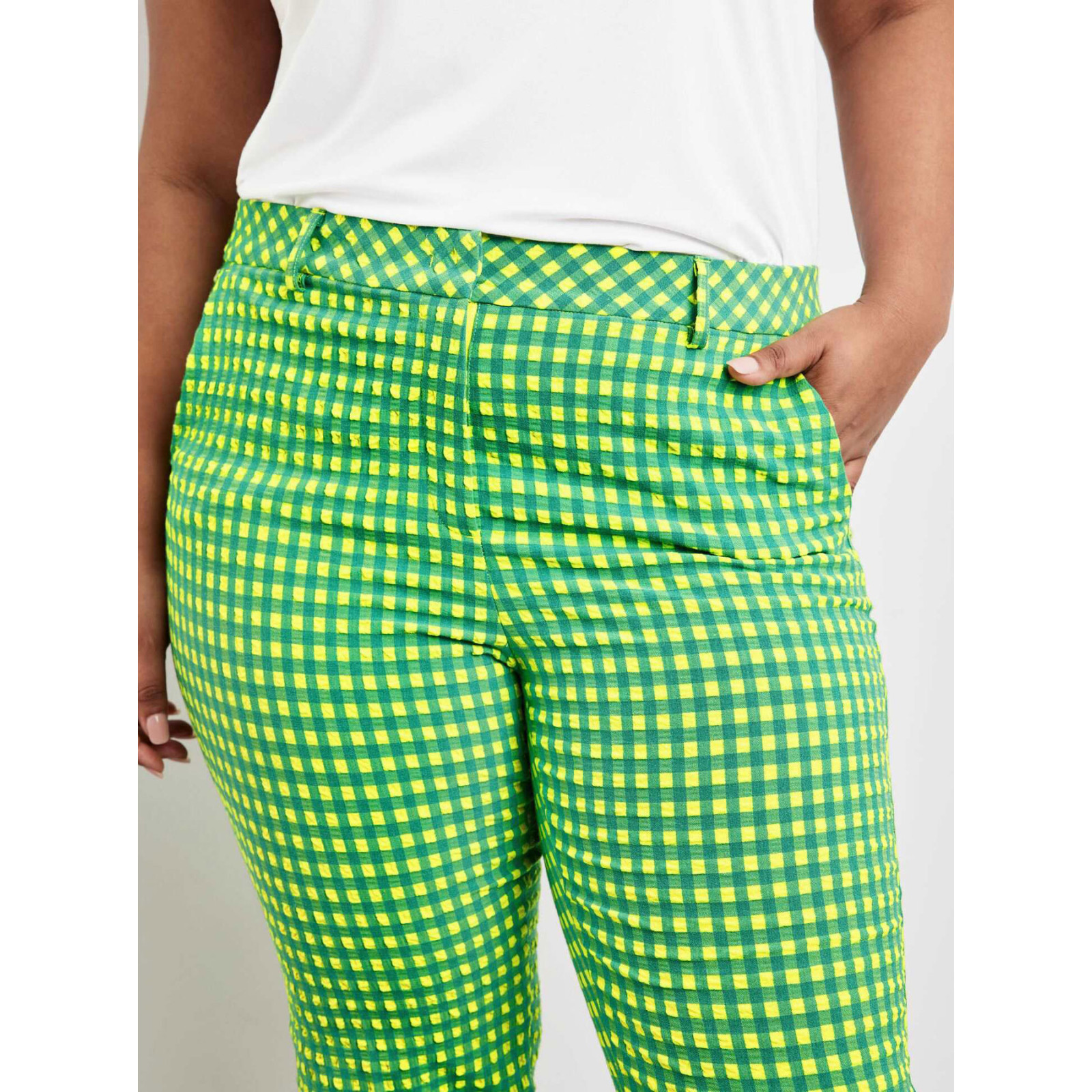 Укорочена модель звуженого крою із змішаної бавовни, пояс зі шльовками для ременя, застібка на блискавці, кишені, розрізи. Склад - 64% поліестер, 34% віскоза, 2% еластан