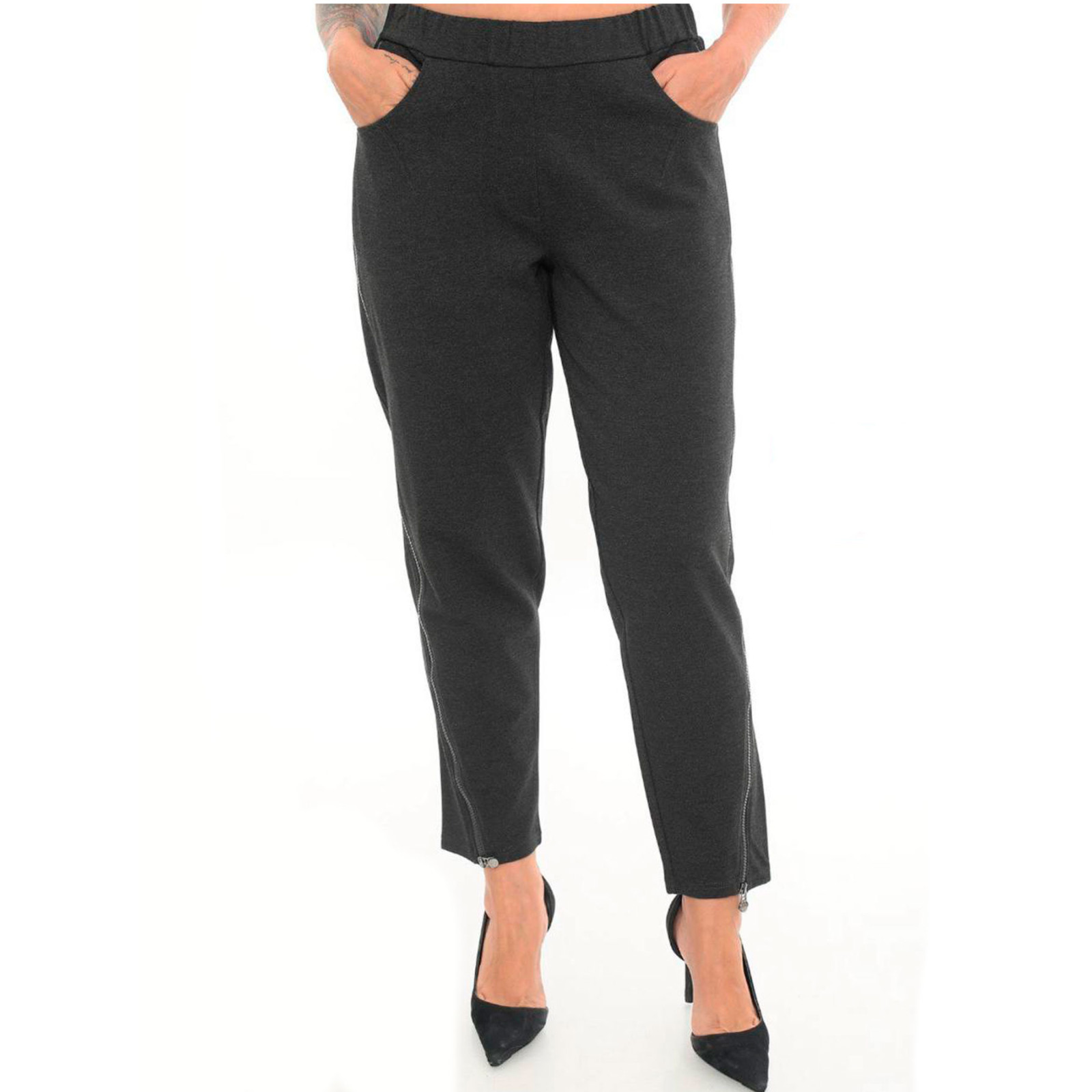 Модель звуженого крою із сумішевого матеріалу, пояс на резинці, без застібок, кишені, декоративні лампаси-блискавки. Склад - 65% віскоза, 30% поліамід, 5% еластан