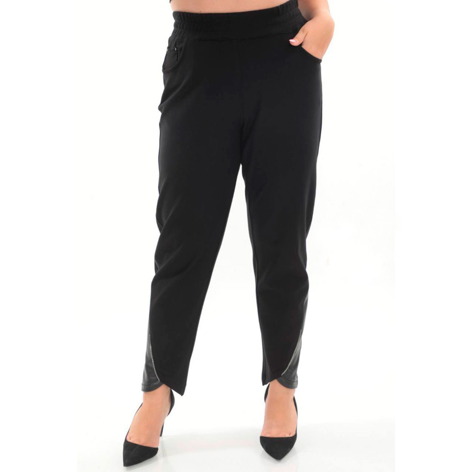 Модель звуженого крою із змішаної віскози, пояс на еластичній гумці, без застібок, п'ять джинсових кишень, нижній край із вставками з оздоблювальної тканини. Склад - 67% віскоза, 28% поліамід, 5% еластан