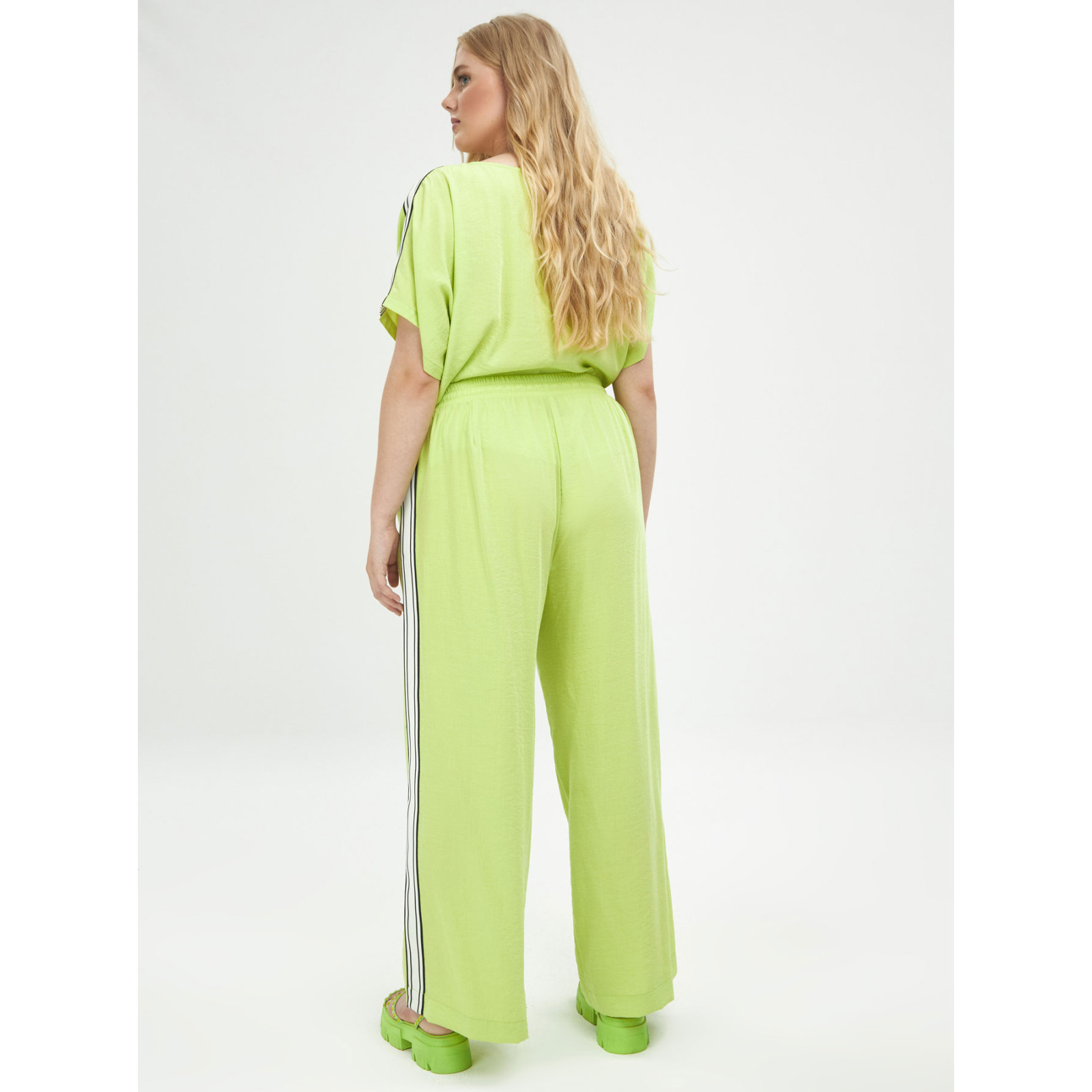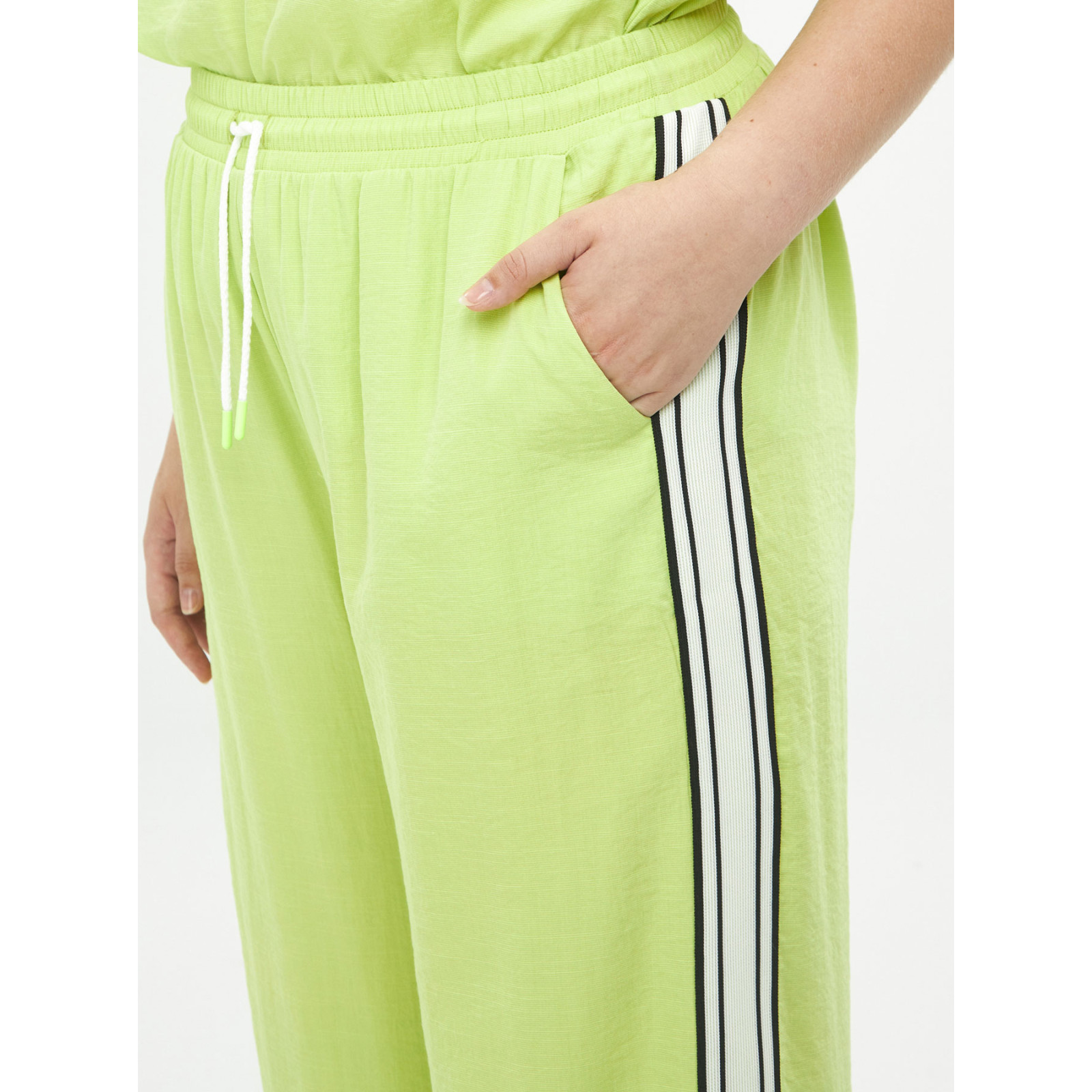 Модель широкого крою із змішаної віскози, пояс на еластичній гумці зі шнурком, кишені, контрастні лампаси з боків. Склад - 85% віскоза, 15% поліамід