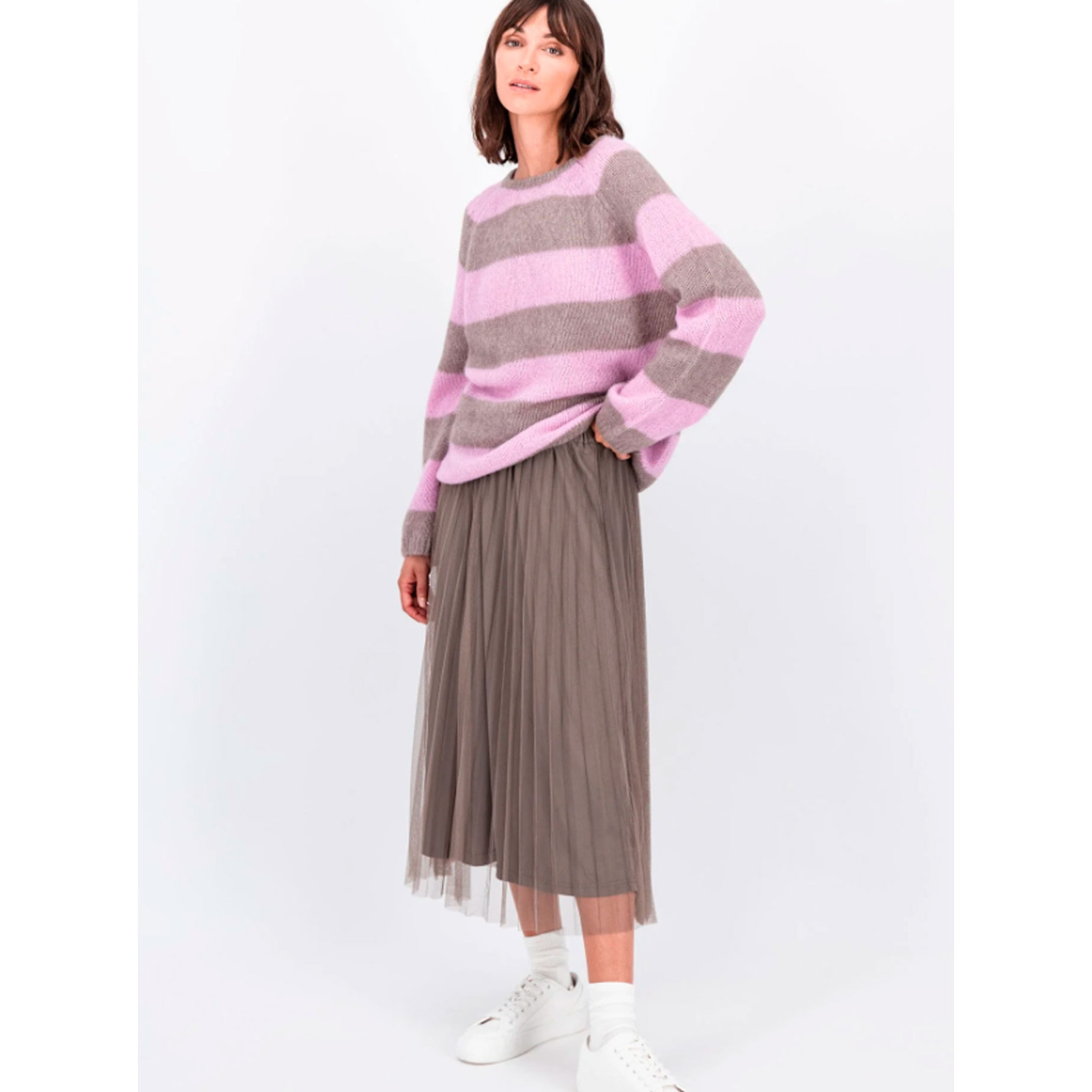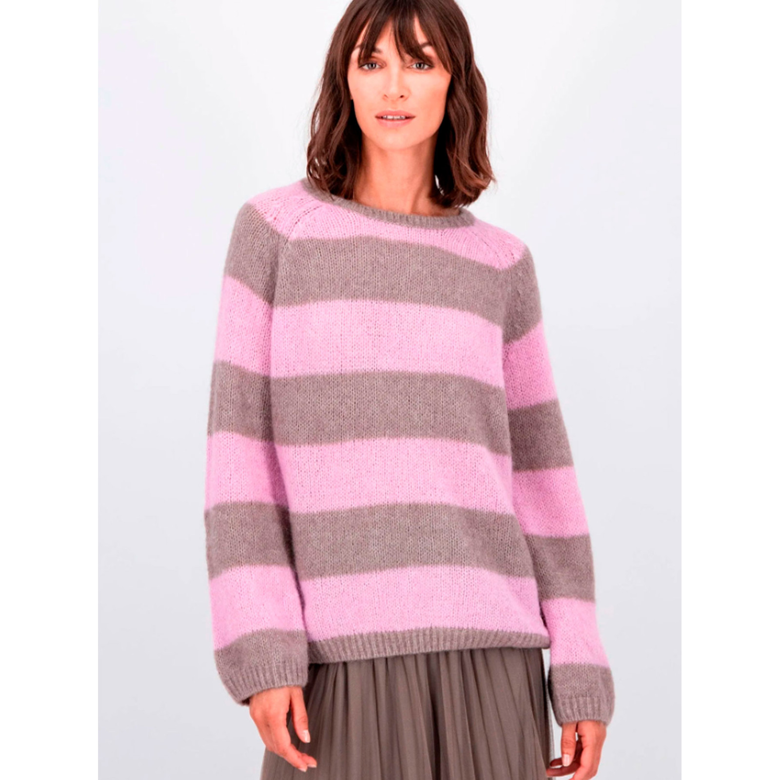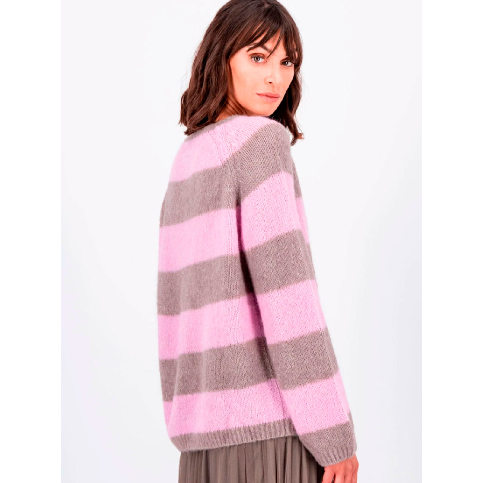 Модель у широку смужку із змішаної пряжі з додаванням вовни та альпака, круглий виріз горловини, довгий рукав та нижній край на манжетах. Склад - 32% бавовна, 32% альпака, 30% поліамід, 6% еластан