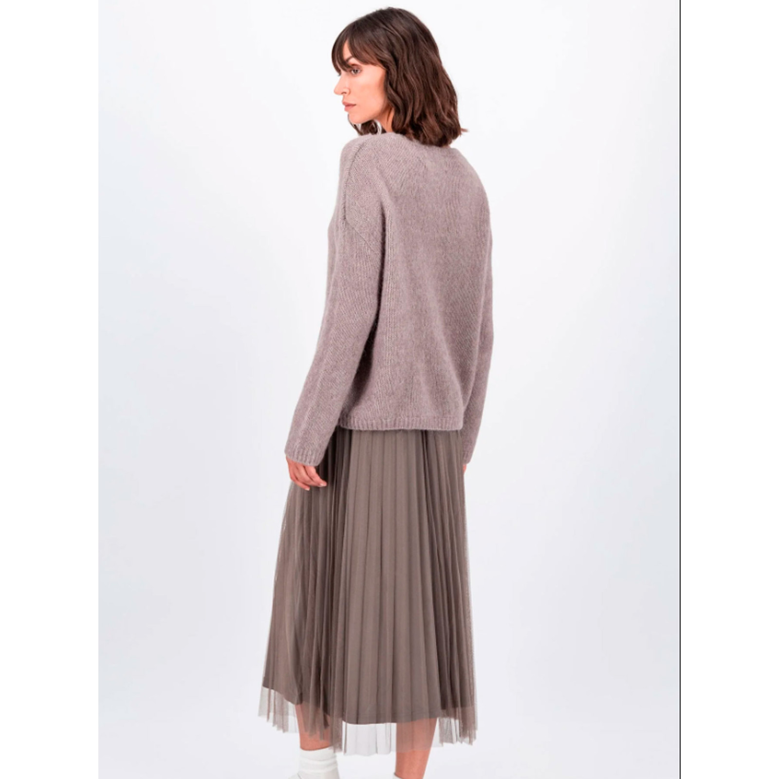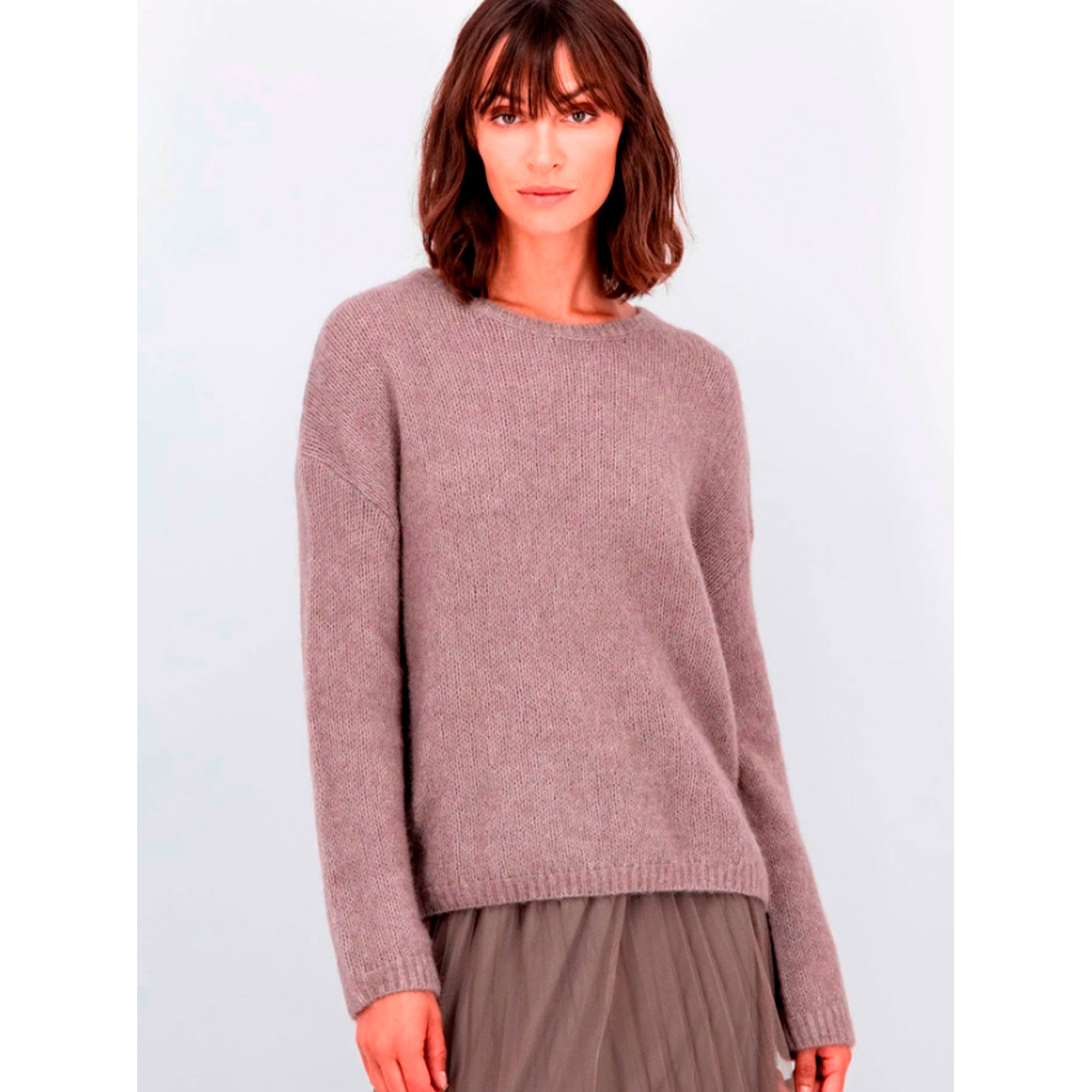Модель із сумішшової вовни з додаванням вовни альпака, круглий виріз горловини, довгий рукав та нижній край на манжетах. Склад - 32% вовна, 32% альпаку, 30% поліамід, 6% еластан