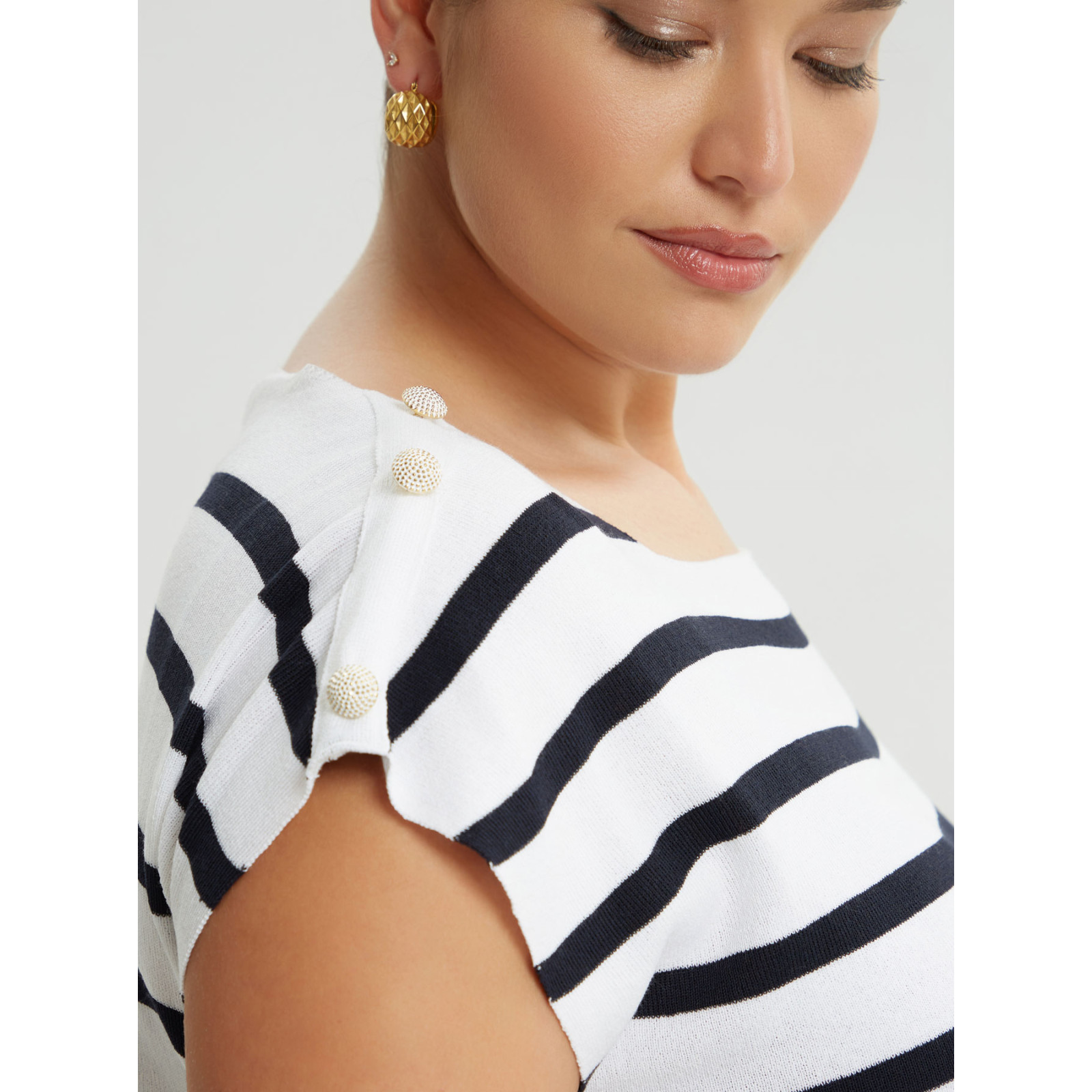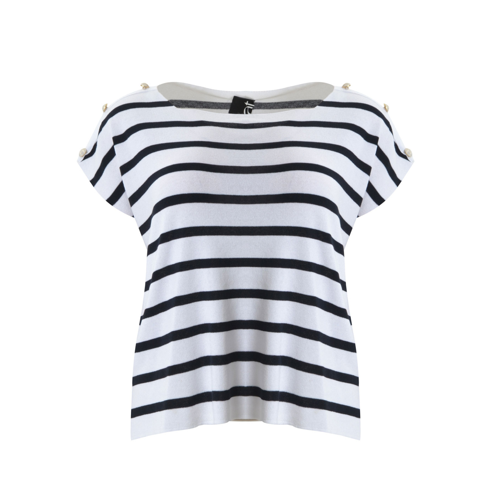 Модель із змішаної віскози, круглий виріз горловини, короткий рукав декорований ґудзиками, бічні розрізи. Склад - 88% віскоза, 12% еластан