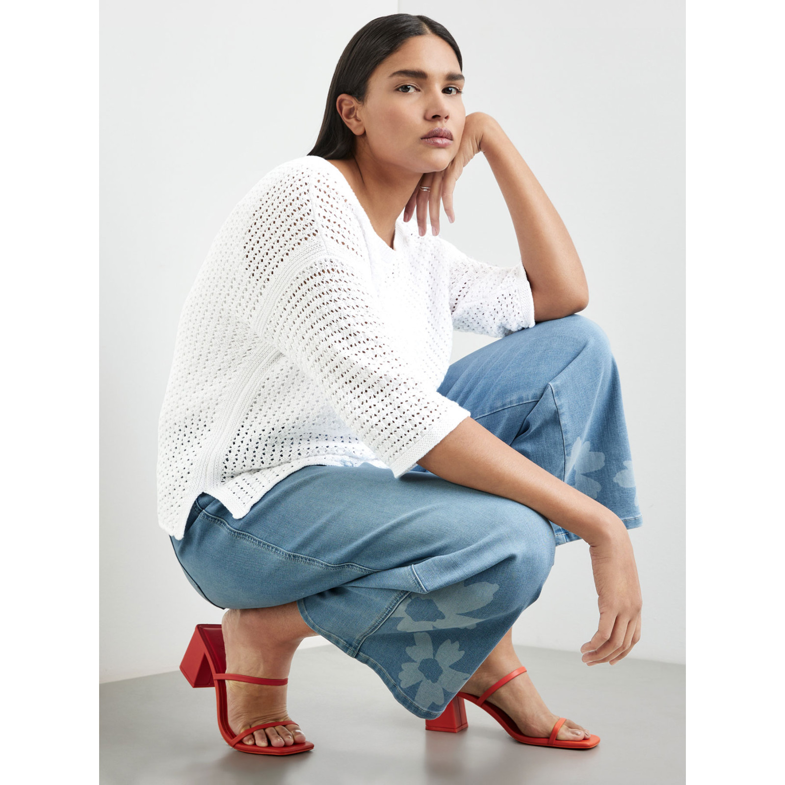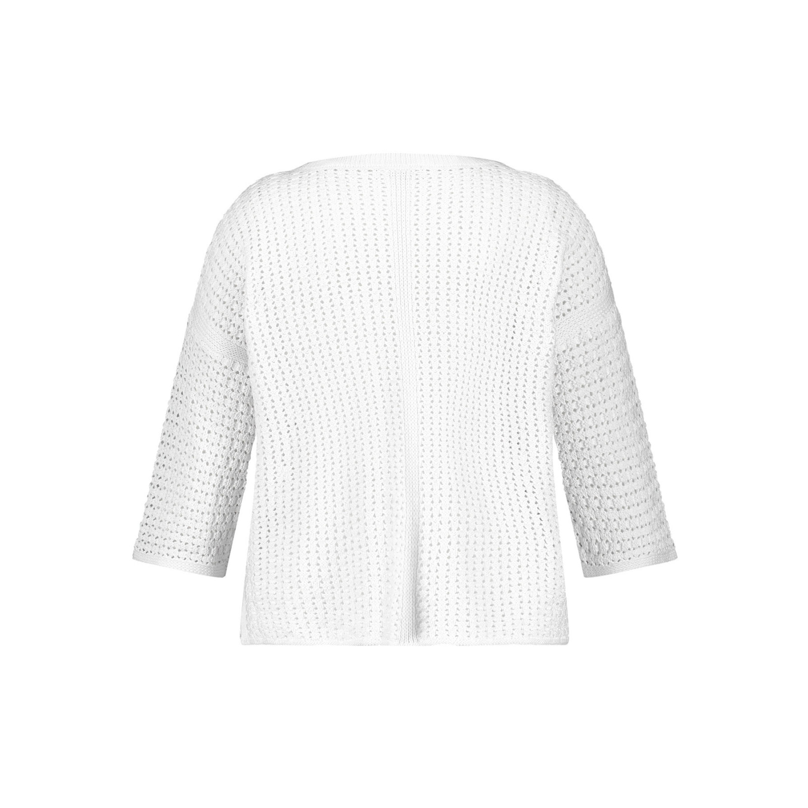 Модель ажурного в'язання з бавовни, круглий виріз горловини, рукава 3/4, бічні розрізи. Склад - 100% бавовна