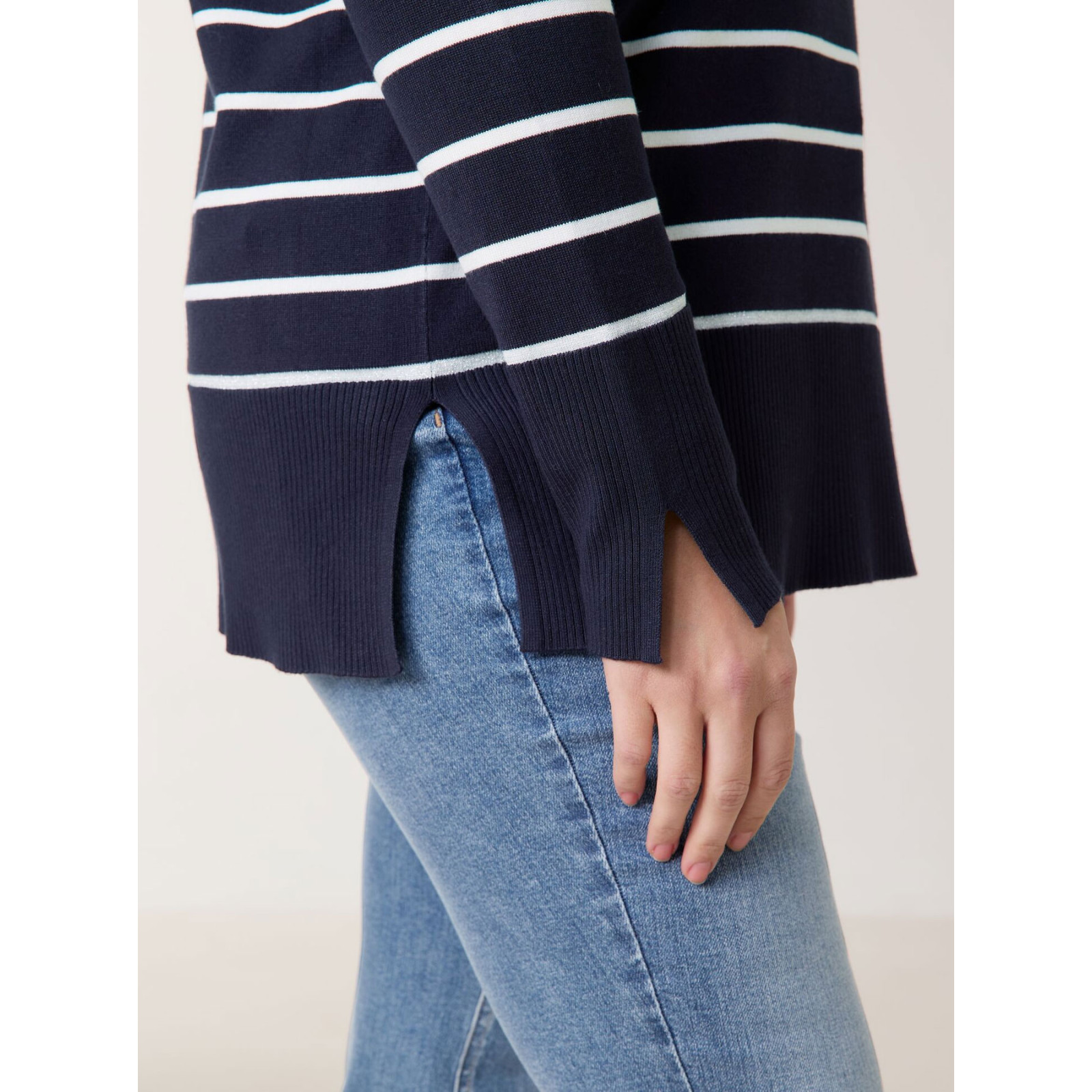 Подовжена модель із розрізами із сумішової віскози в смужку, круглий виріз горловини, довгий рукав. Склад - 70% віскоза, 30% поліамід