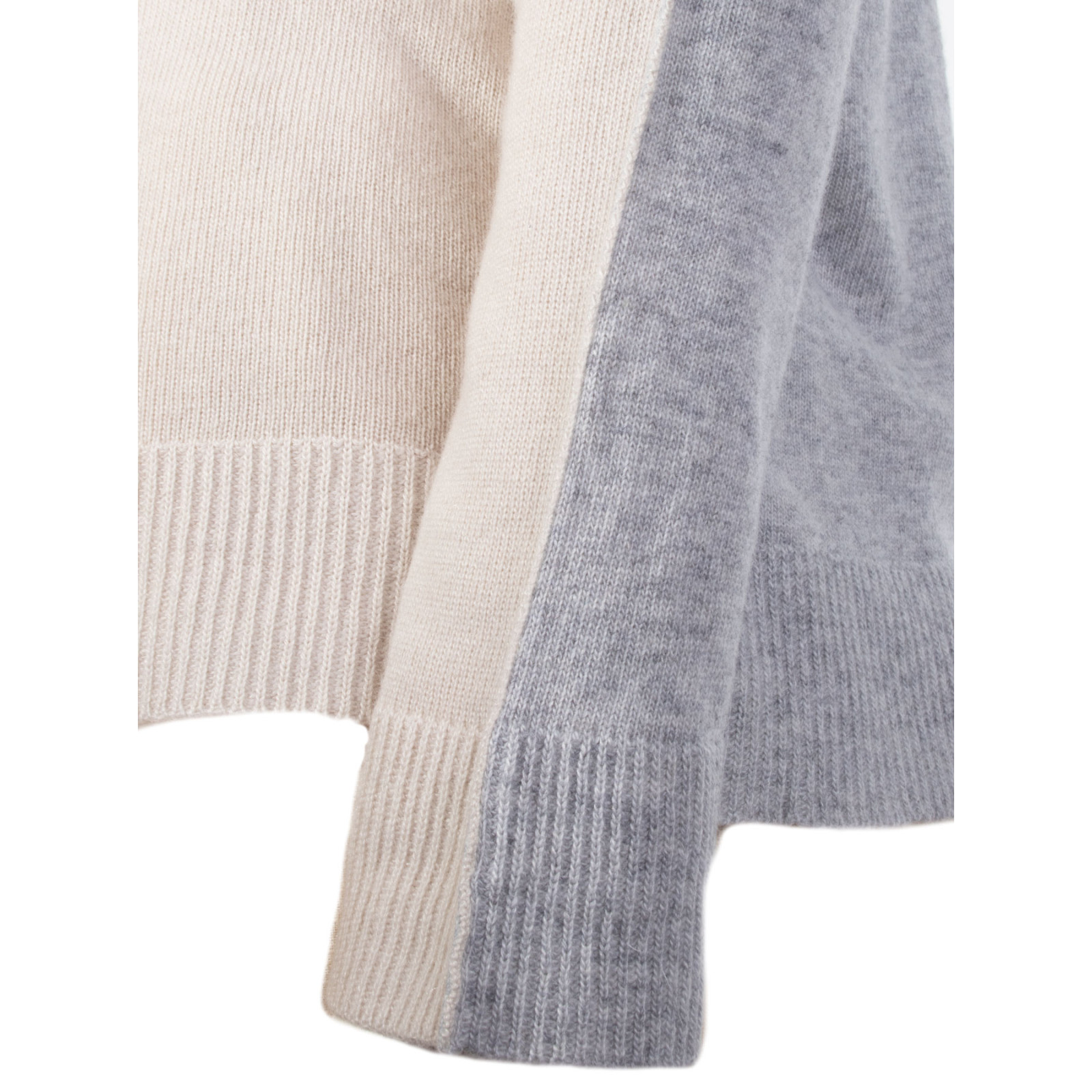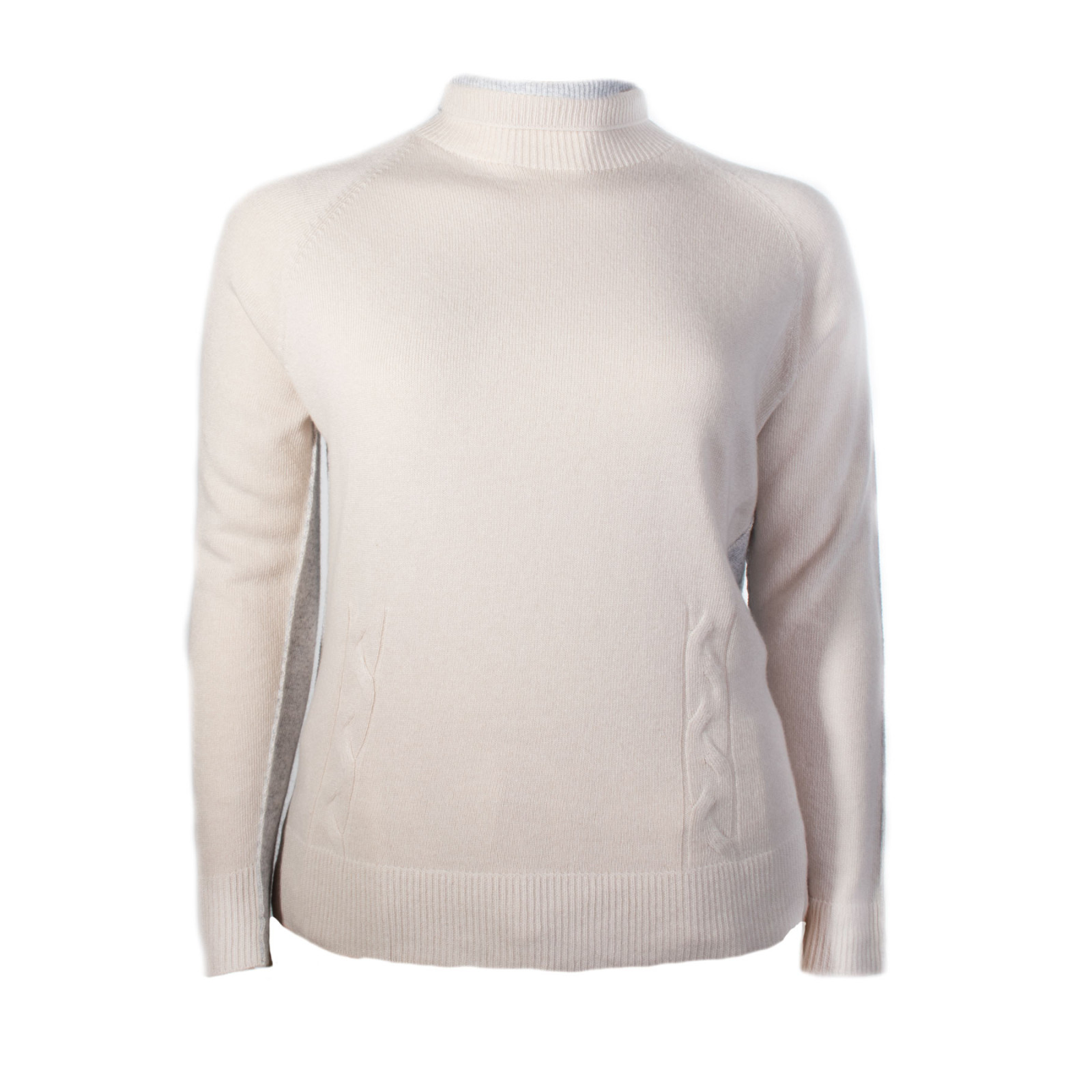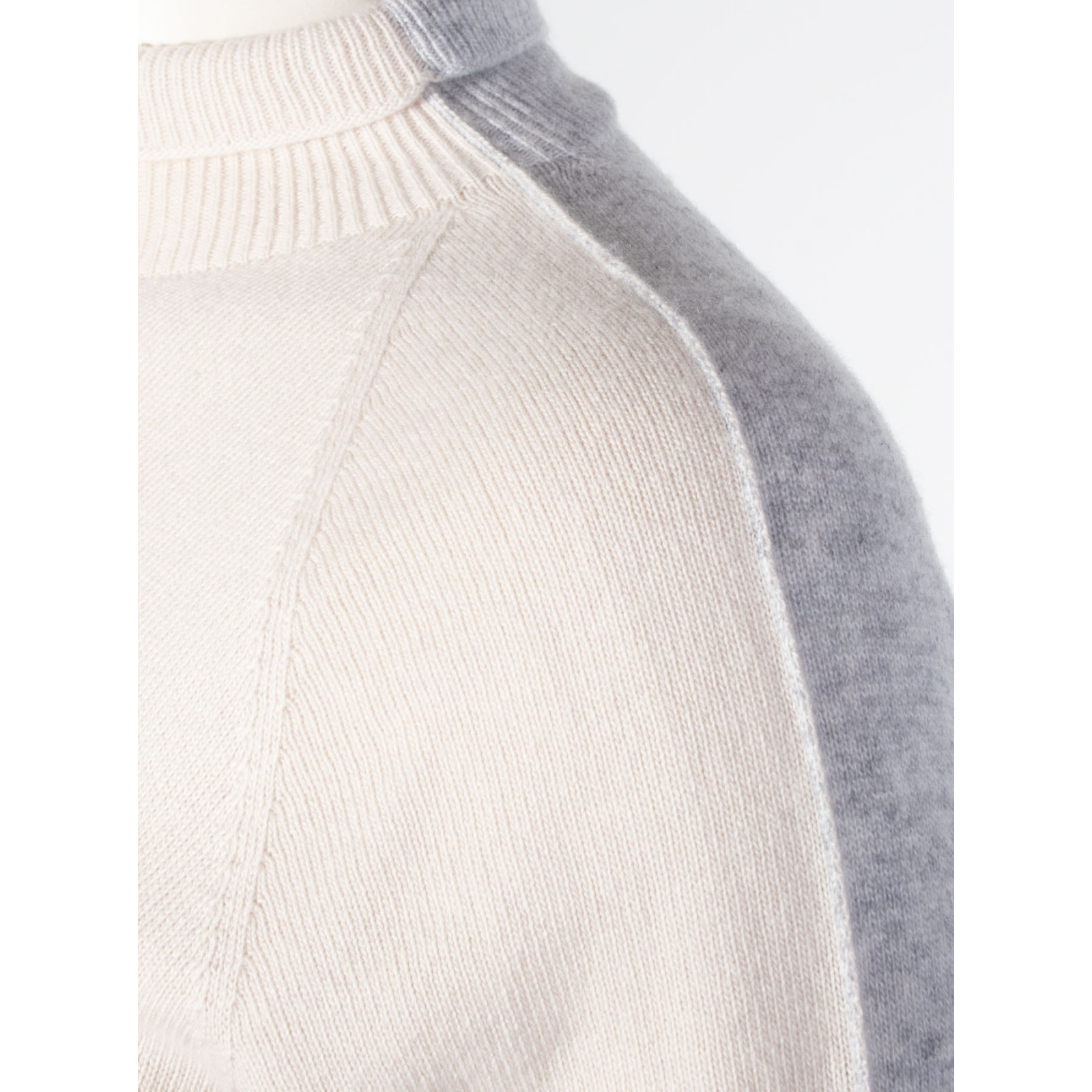 Комбінована двокольорова модель із сумішової вовни з додаванням кашеміру, висока горловина, довгий рукав. Склад - 40% віскоза, 30% поліамід, 25% вовна, 5% кашемір.