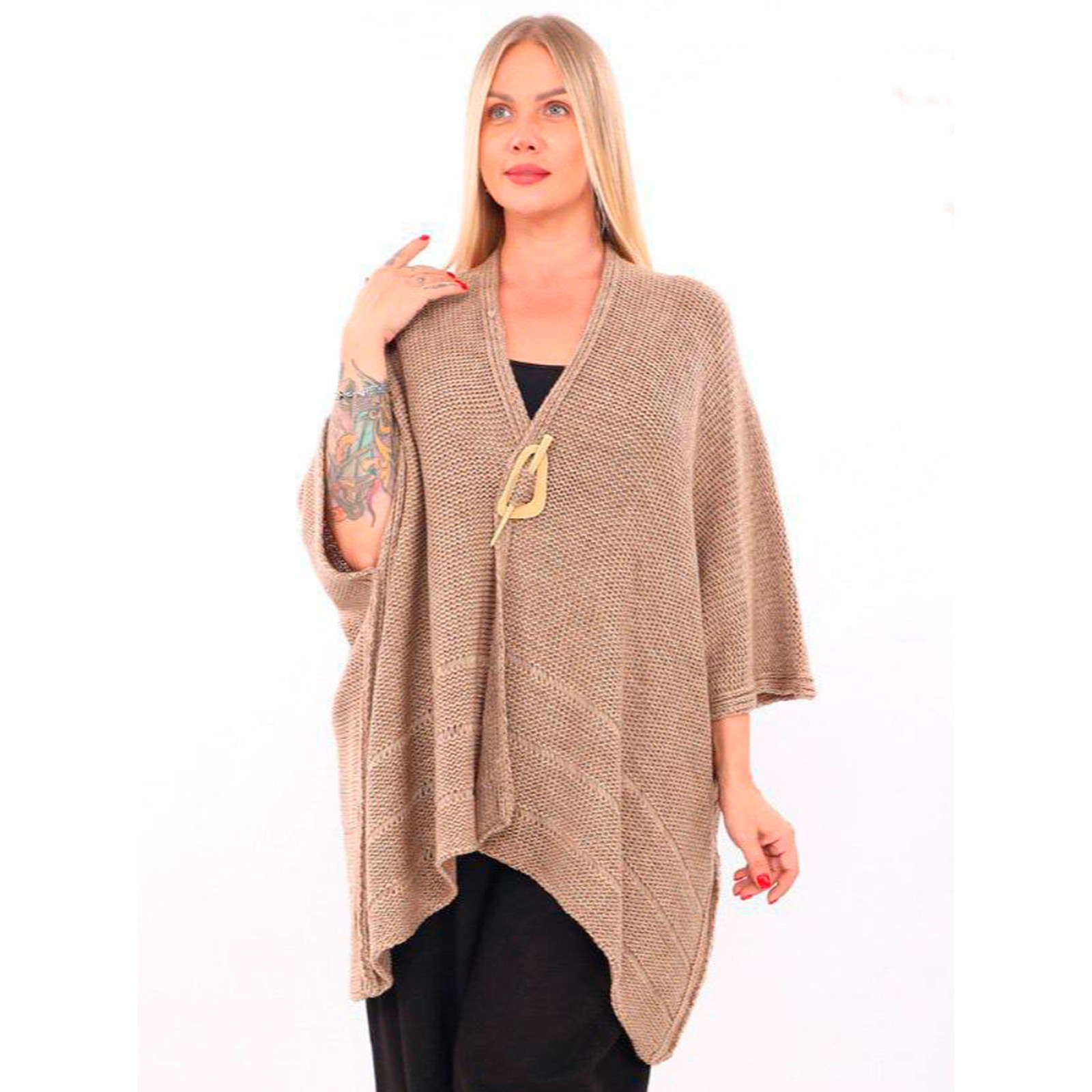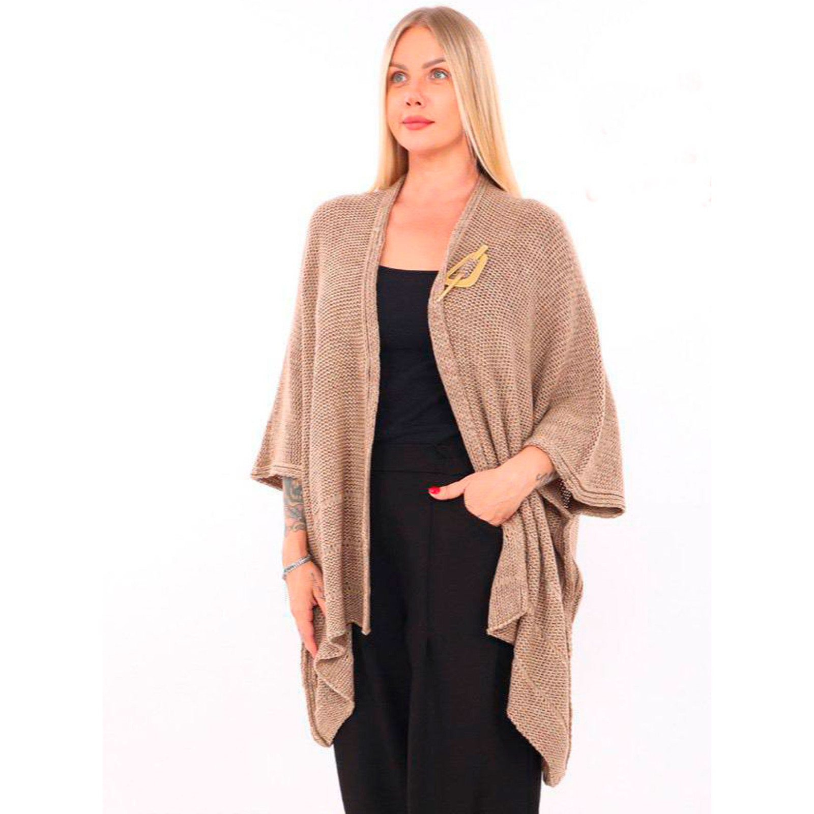 Модель із застібкою на декоративну шпильку, сумішова віскоза із додаванням вовни, широкий рукав 3/4, асиметричний нижній край. Склад - 60% віскоза, 35% поліестер, 5% вовна