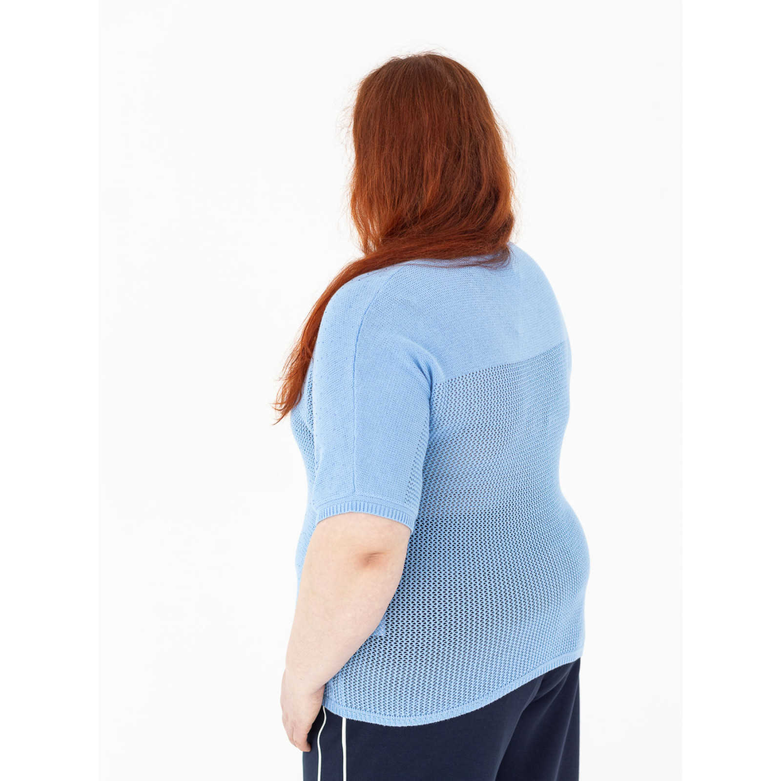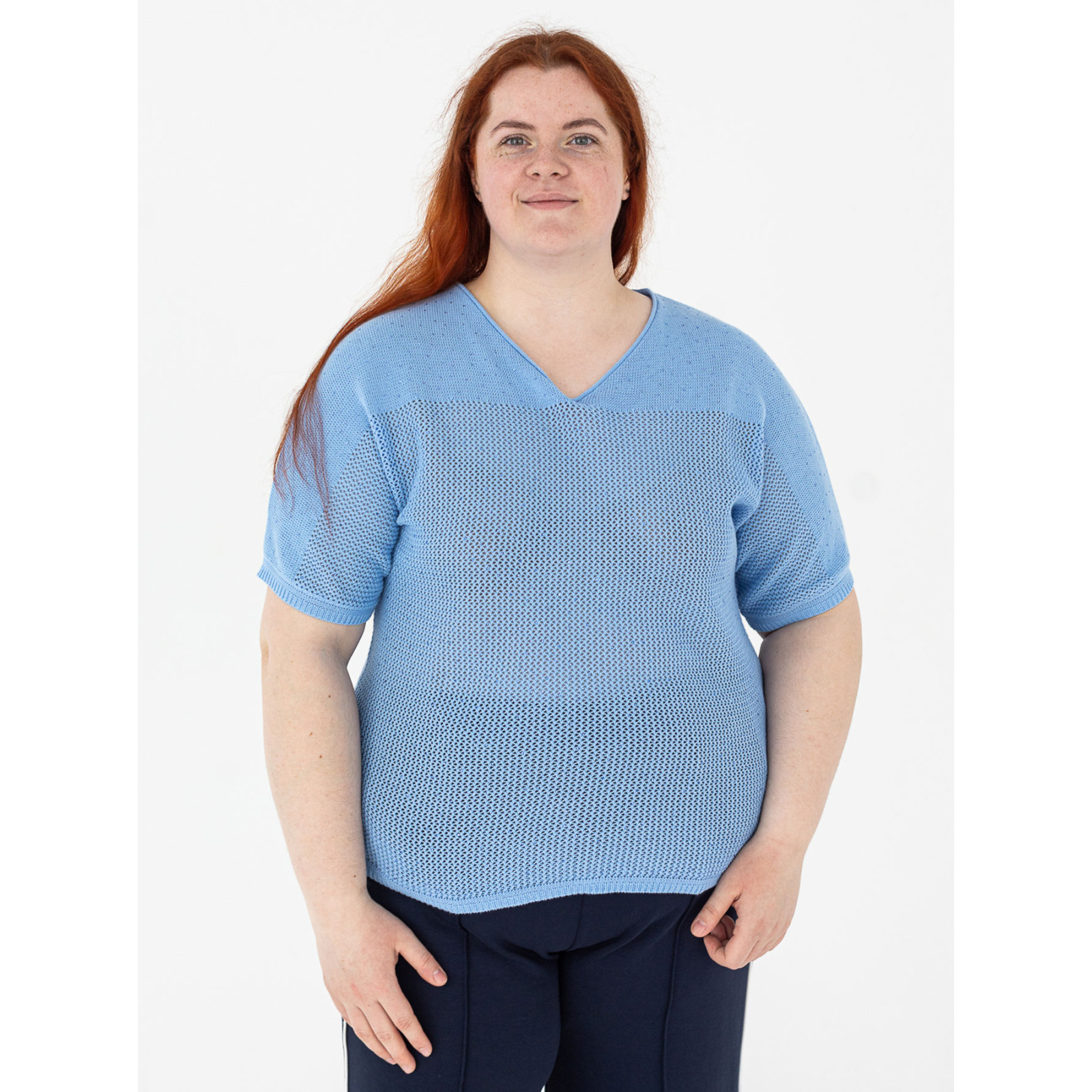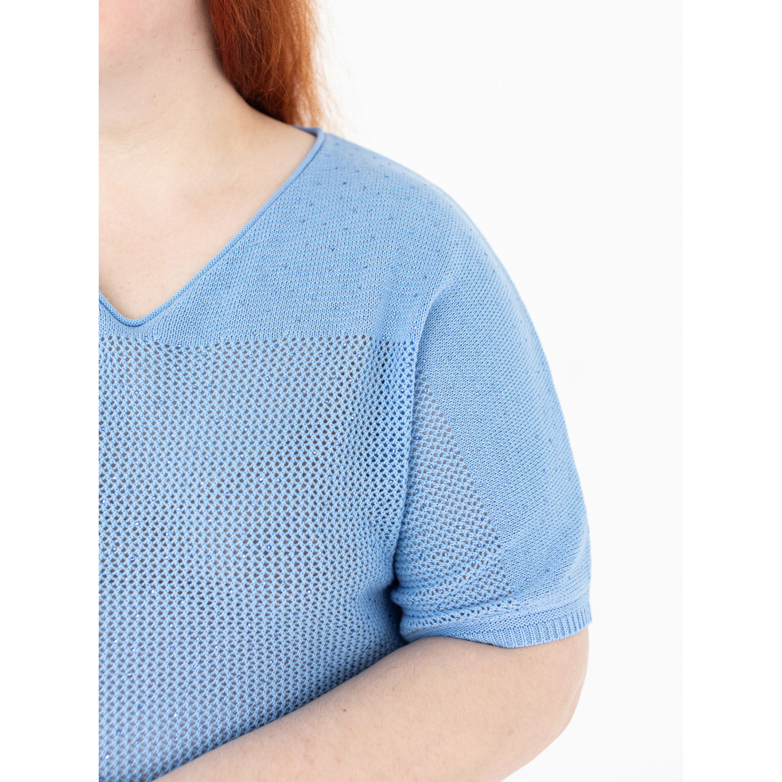 Модель з бавовни із вставкою з ажурної в'язки та декоративними стразами, V-подібний виріз горловини, короткий рукав. Склад - 100% бавовна