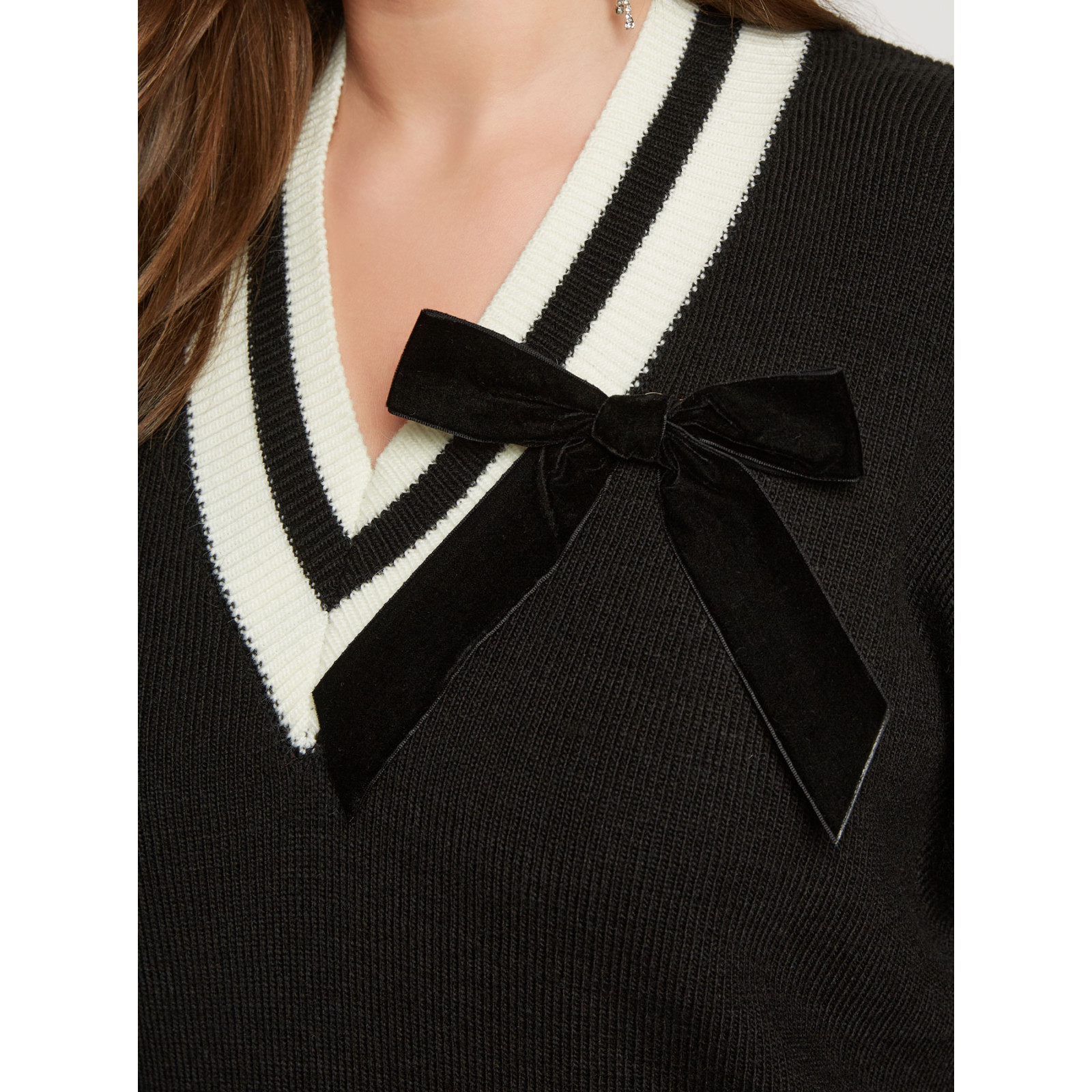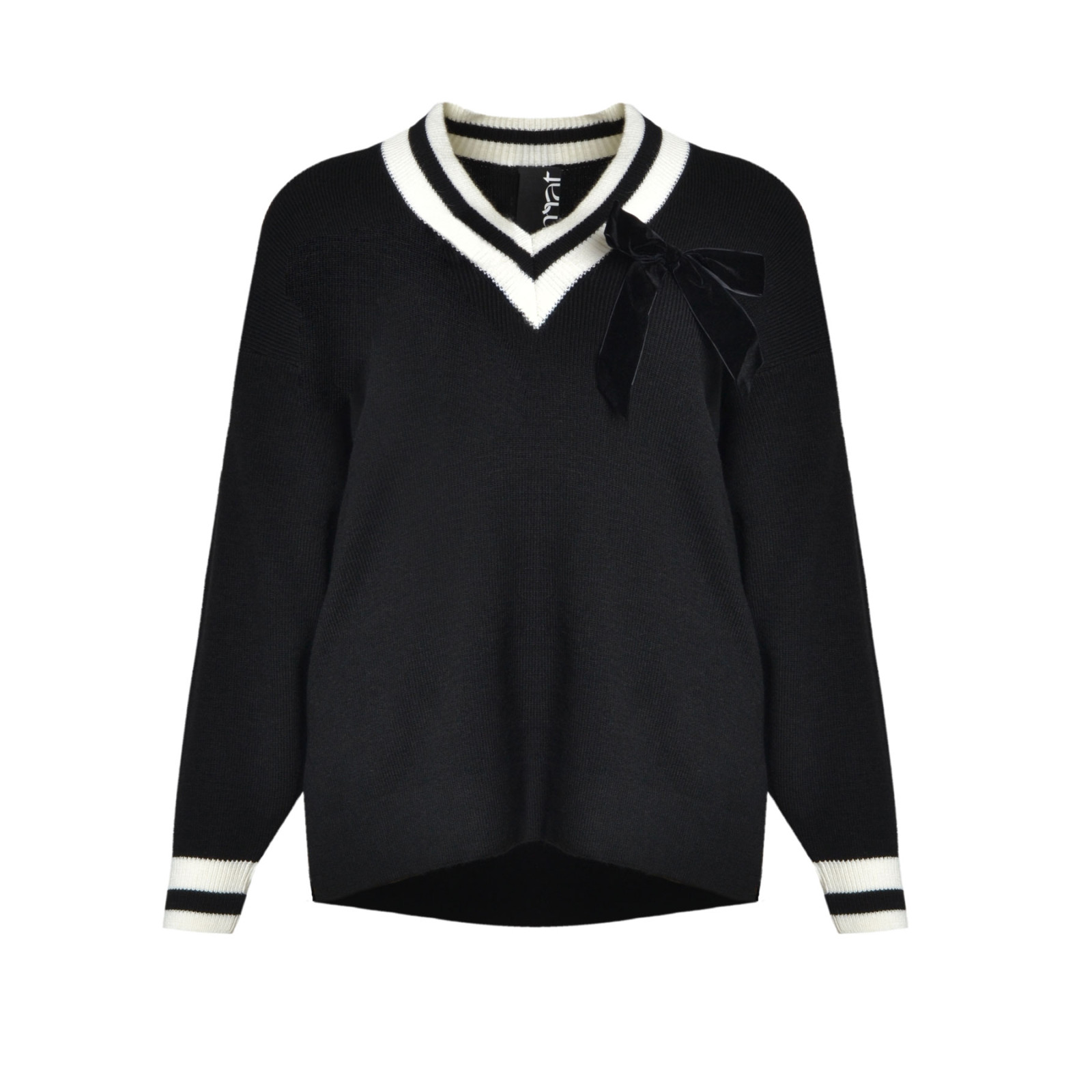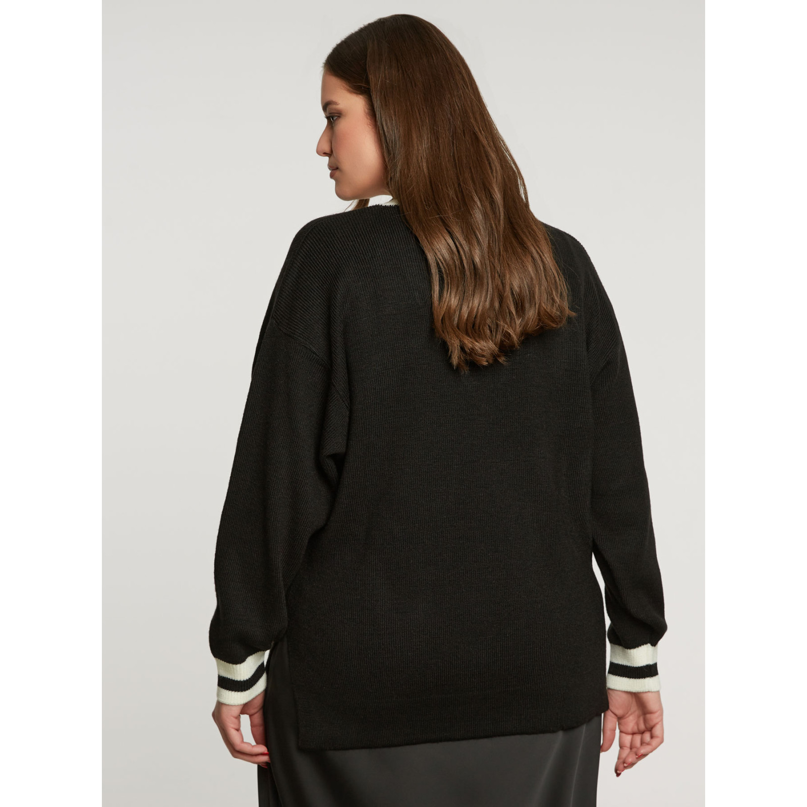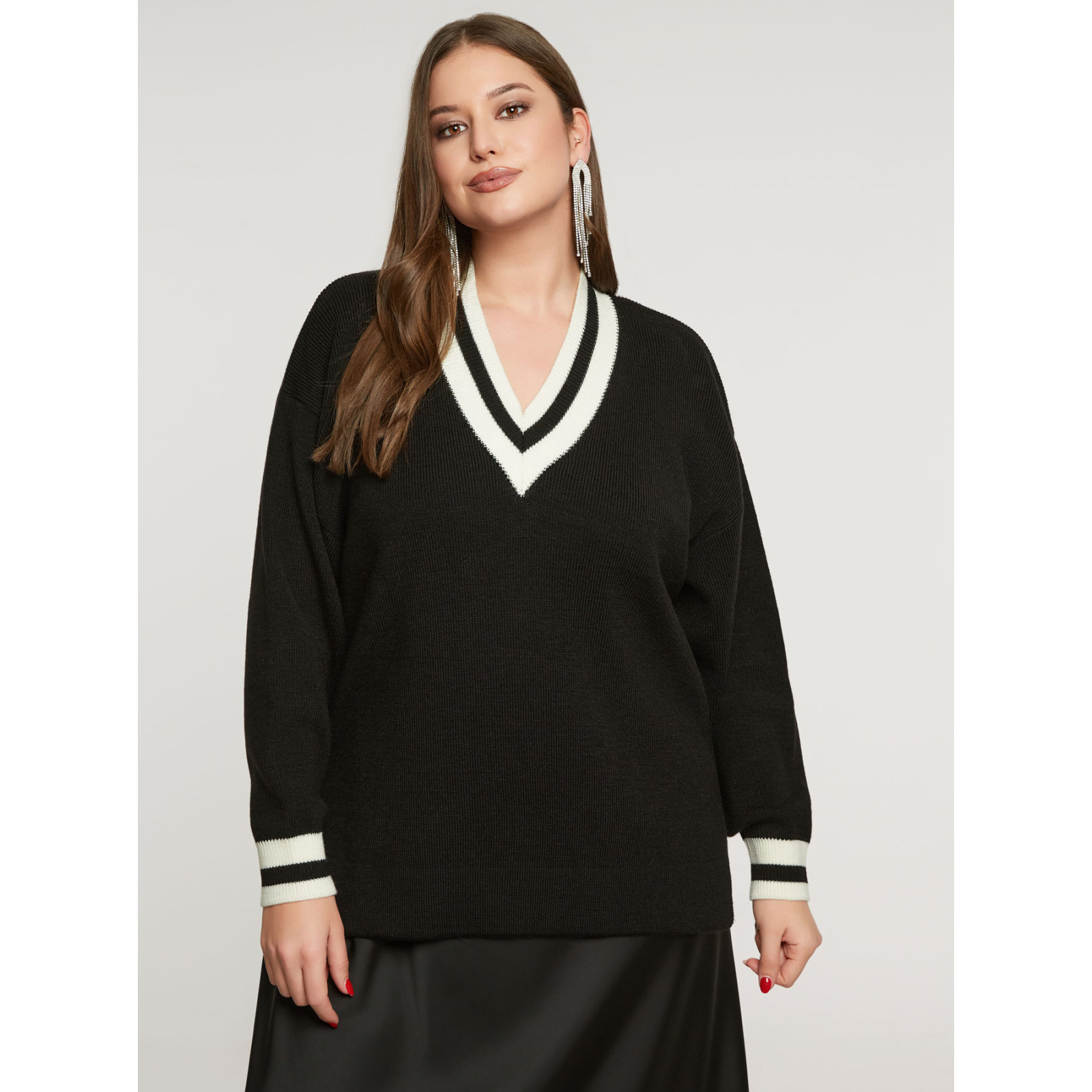 Модель з контрастними смужками із змішаної пряжі з додаванням вовни, V-подібний виріз горловини, довгий рукав та нижній край на манжетах, розрізи з боків, декоративна брошка у вигляді оксамитового банта. Склад - 84% акрил, 10% вовна, 6% поліестер
