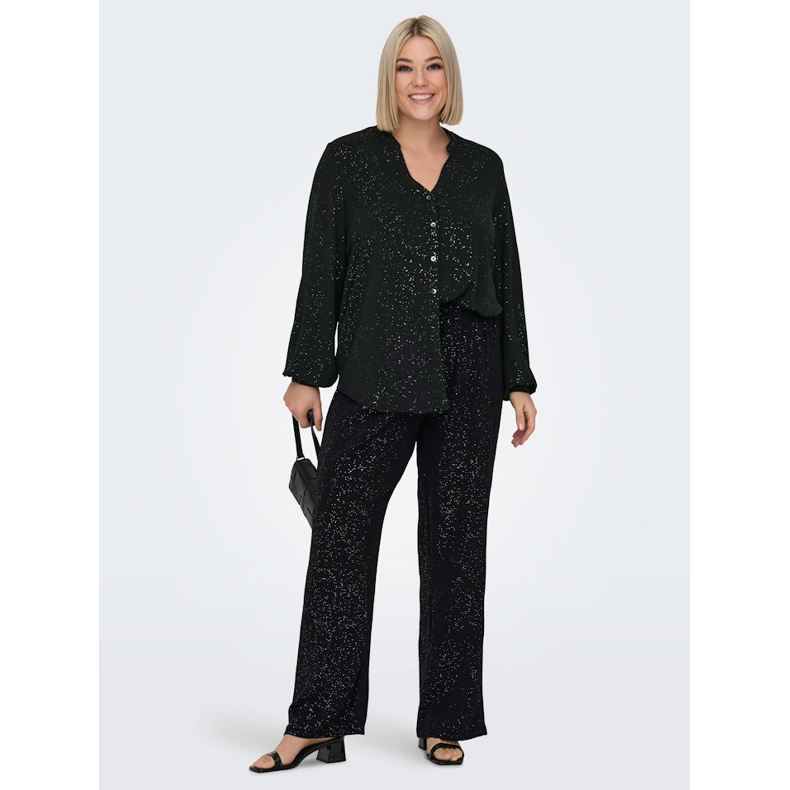 Модель з люрексом та V-подібним вирізом горловини, довгий рукав на манжеті, застібка на ґудзиках, фігурні бічні розрізи. Склад - 100% поліестер