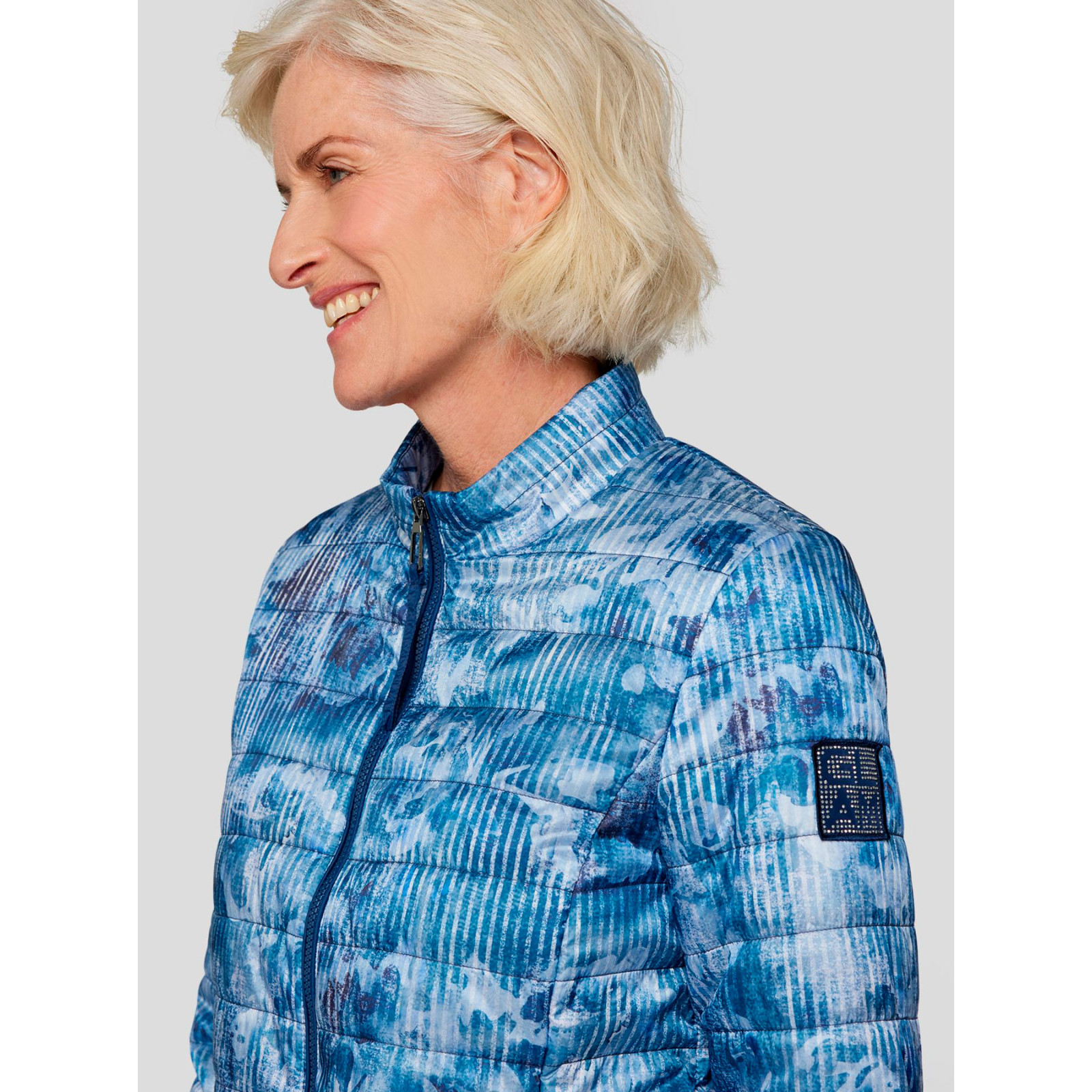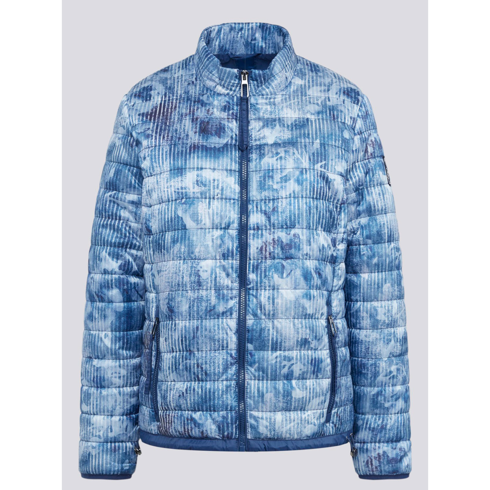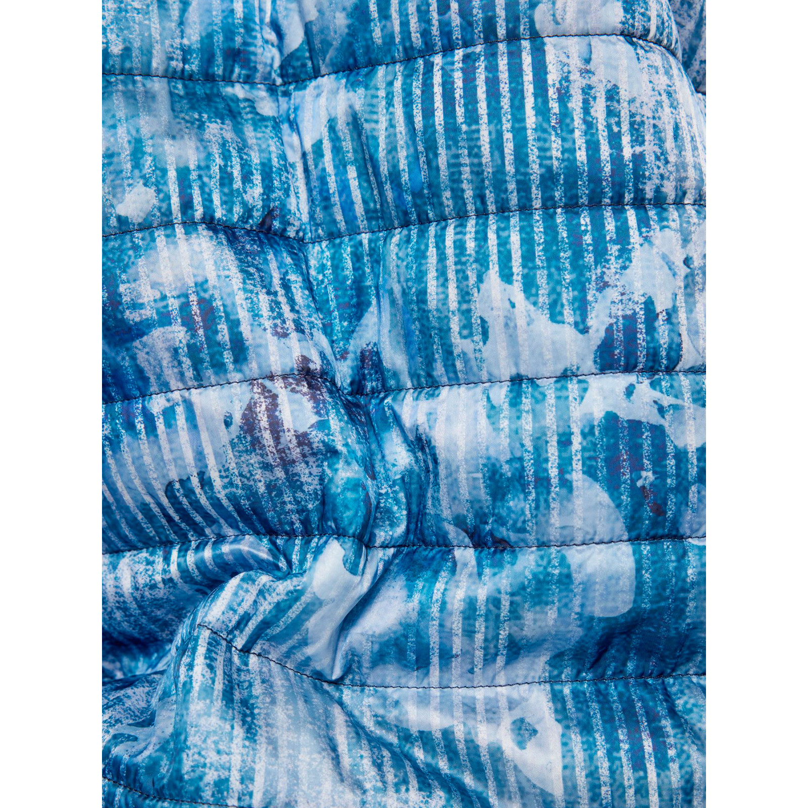 Стьобана модель із сумішевого матеріалу з розмитим принтом, комір-стійка, застібка та кишені на блискавці. Склад - 60% поліестер, 40% поліамід
