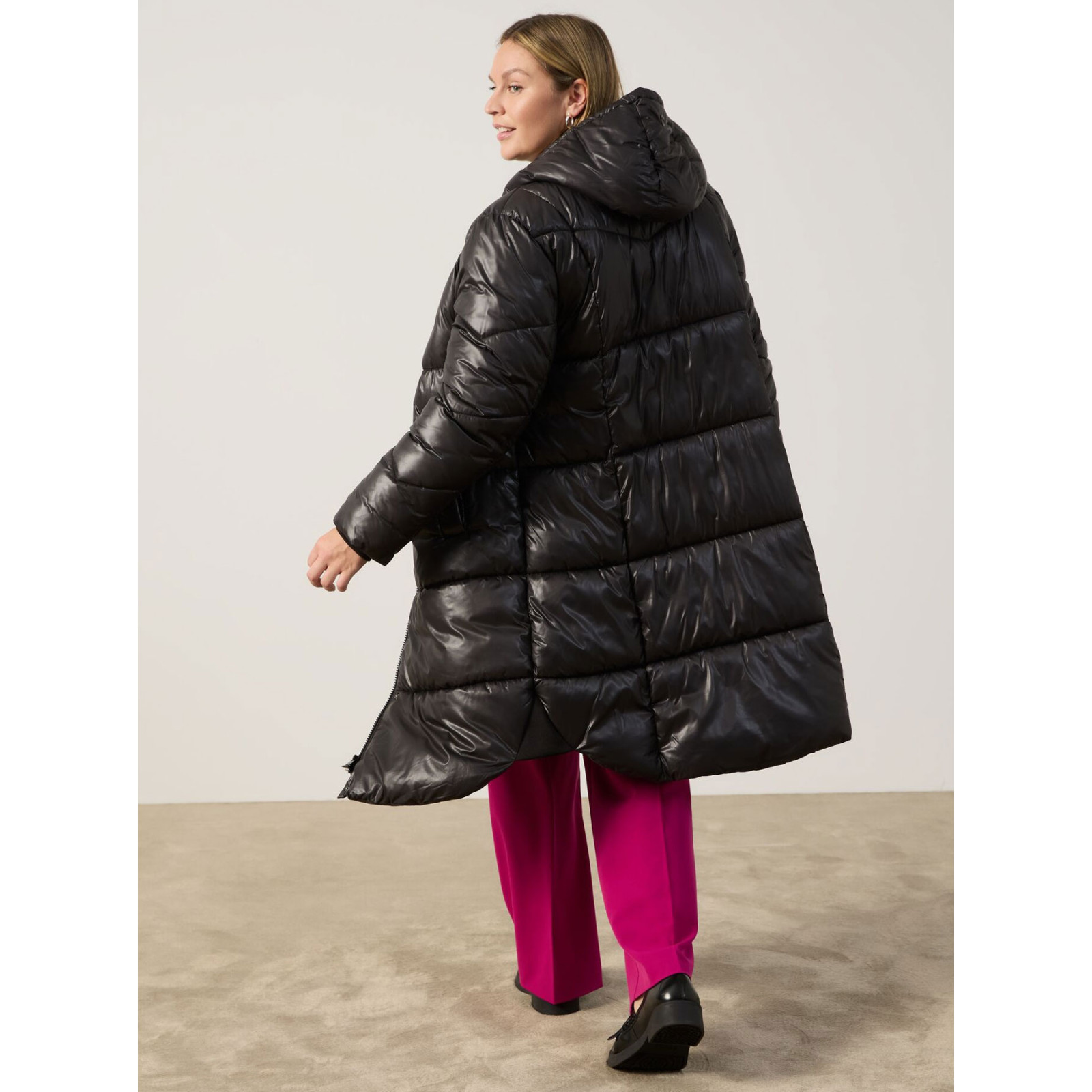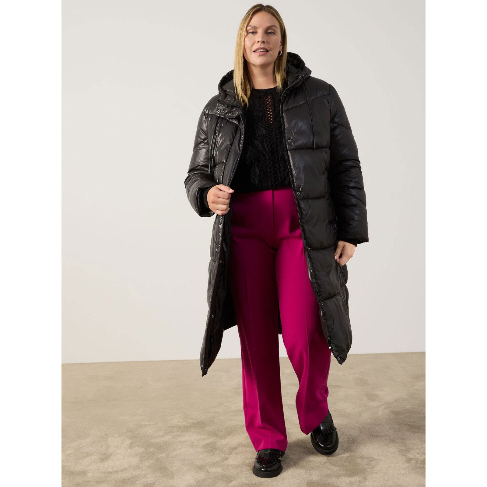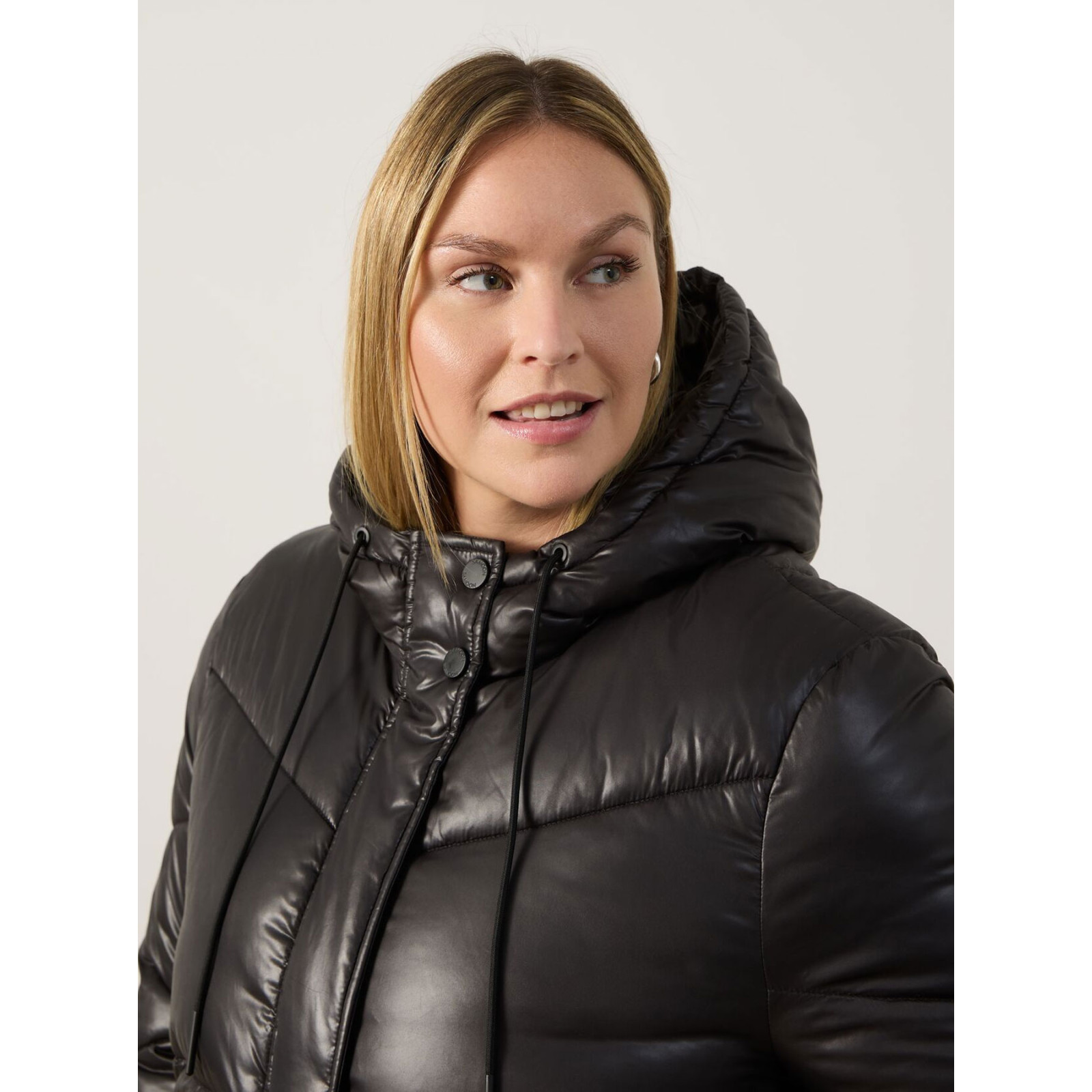Стьобана модель з капюшоном, застібка на блискавку та на планку з кнопками, довгий рукав з трикотажною манжетою, фігурні бокові розрізи. Склад - 100% поліестер