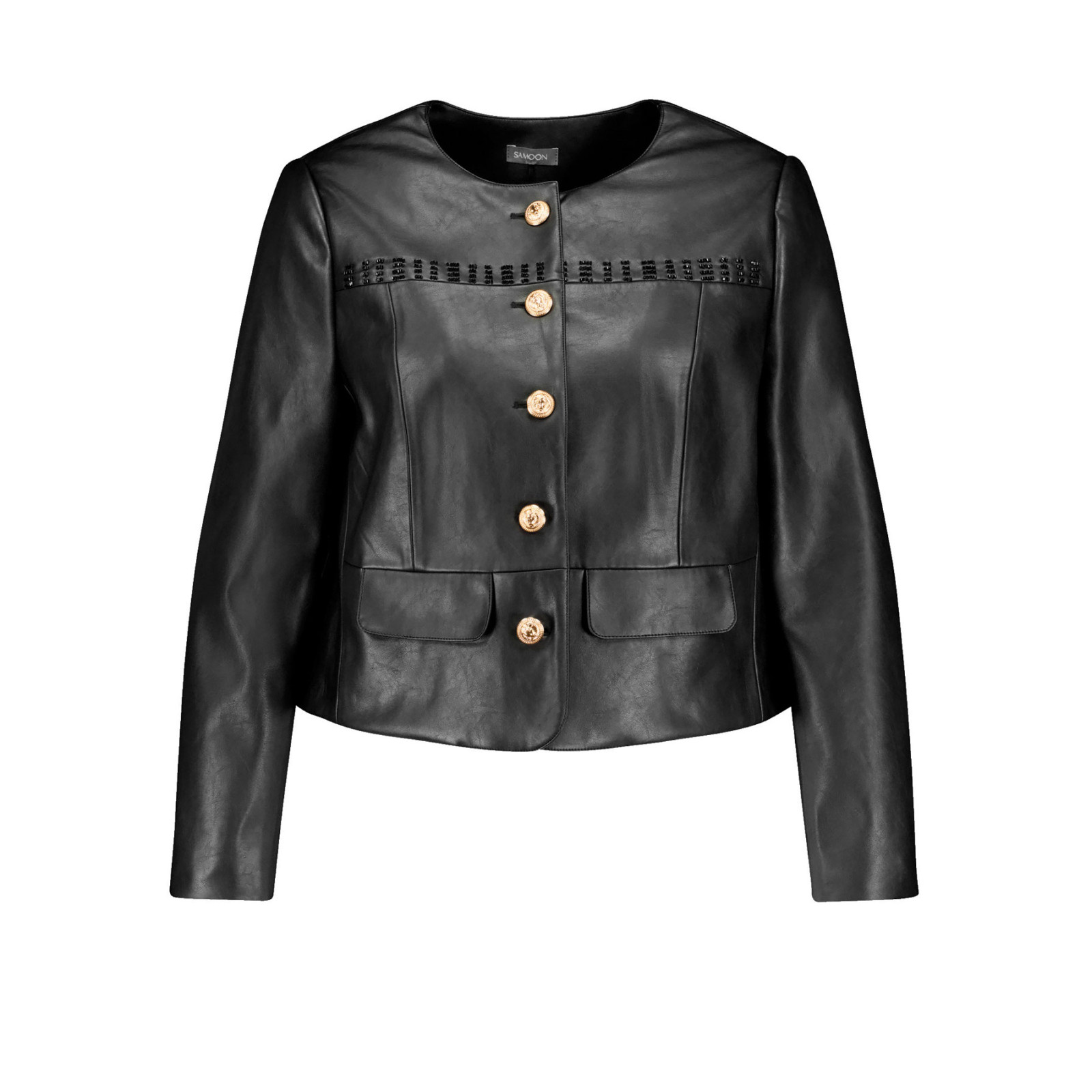 Укорочена модель з екошкіри, круглий виріз горловини, довгий рукав, застібка на ґудзиках, клапани, декорована вишивкою з намистин. Склад - 100% поліестер