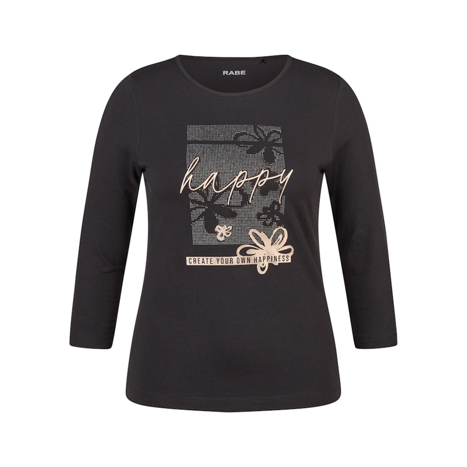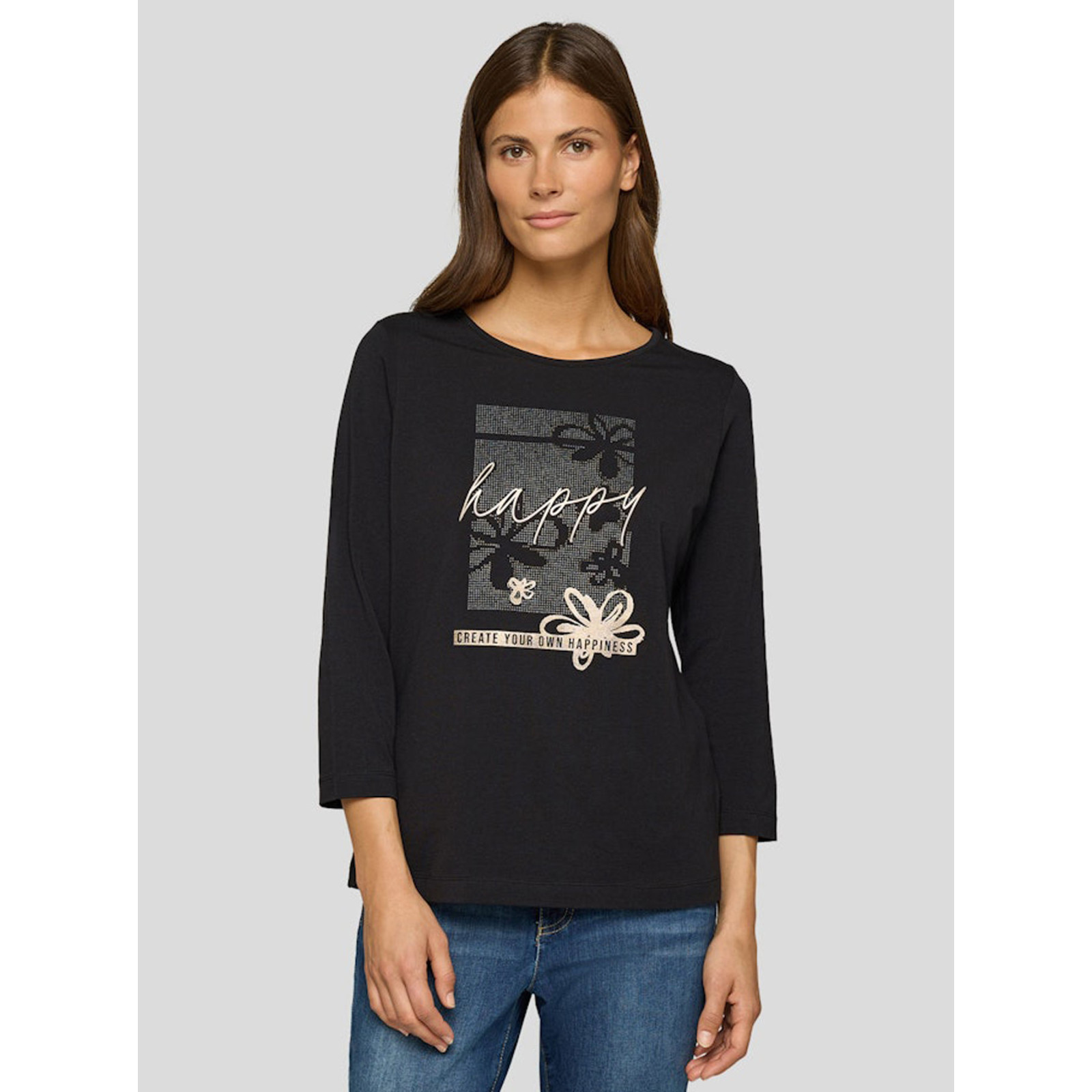 Модель из смесового хлопка с объемным принтом и надписями, круглый вырез горловины, рукава 3/4. Состав -94%хлопок, 6%эластан