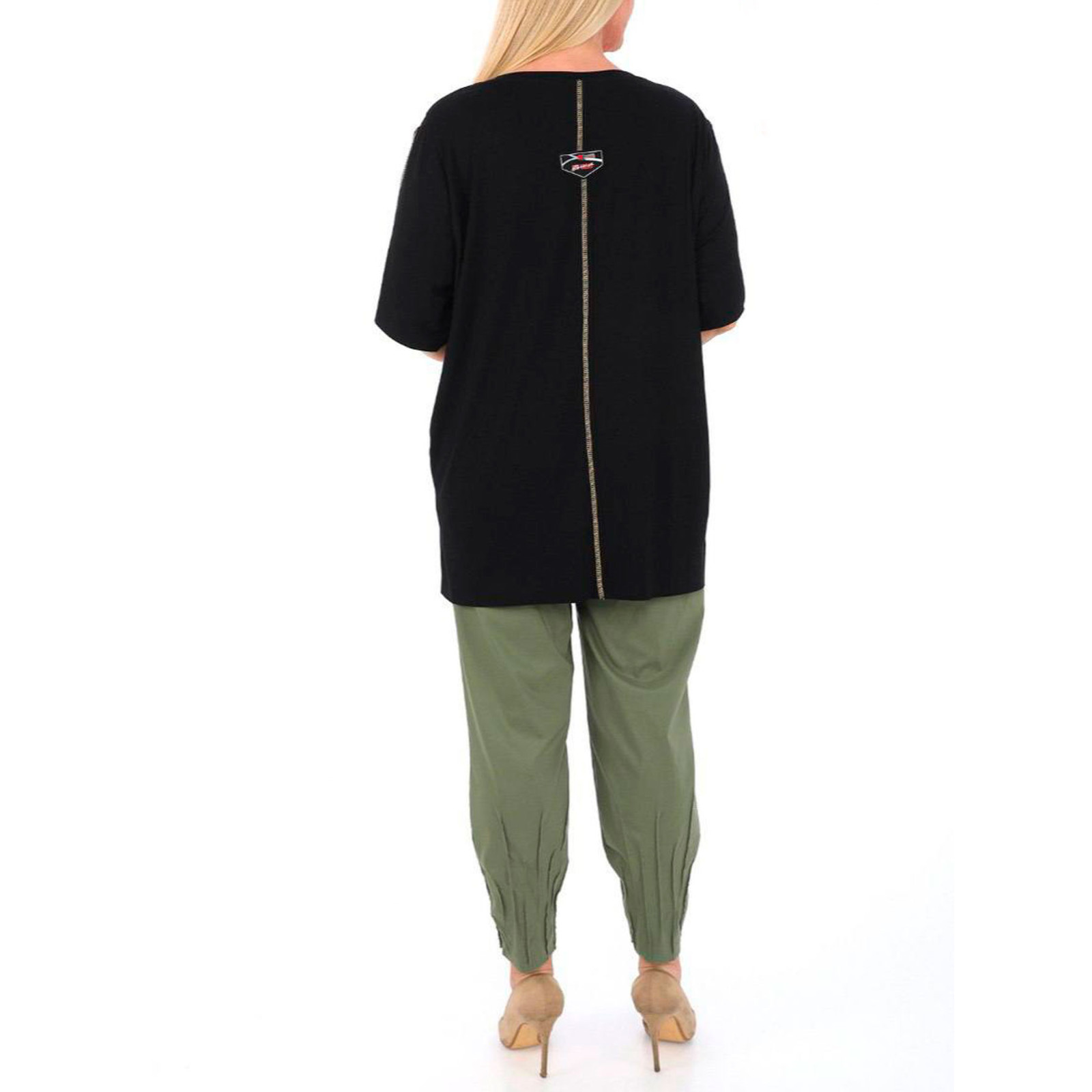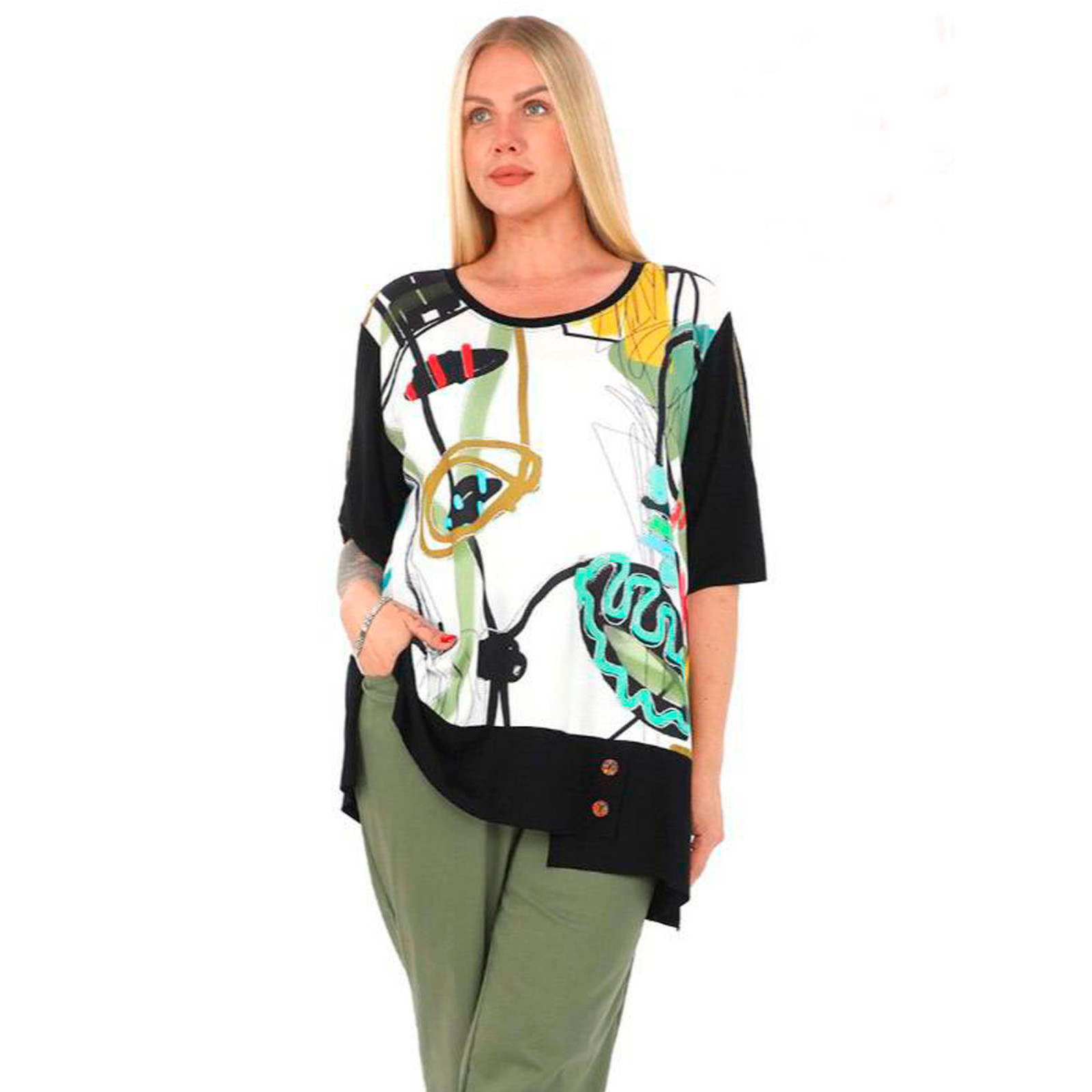 Комбінована модель з абстрактним принтом, круглий виріз горлвини, короткий рукав, асиметричний нижній край з гудзиками. Склад - 95% бавовна, 5% еластан