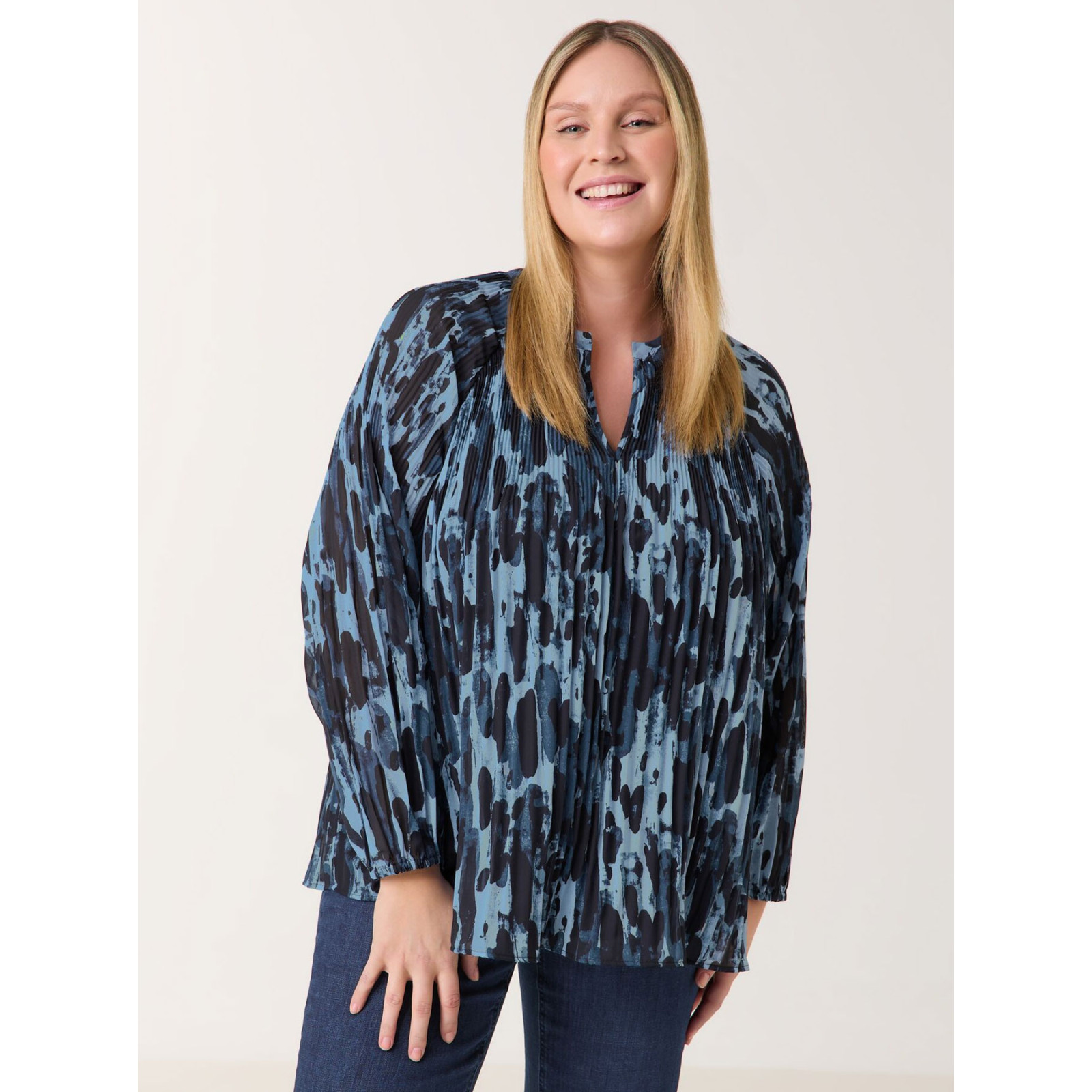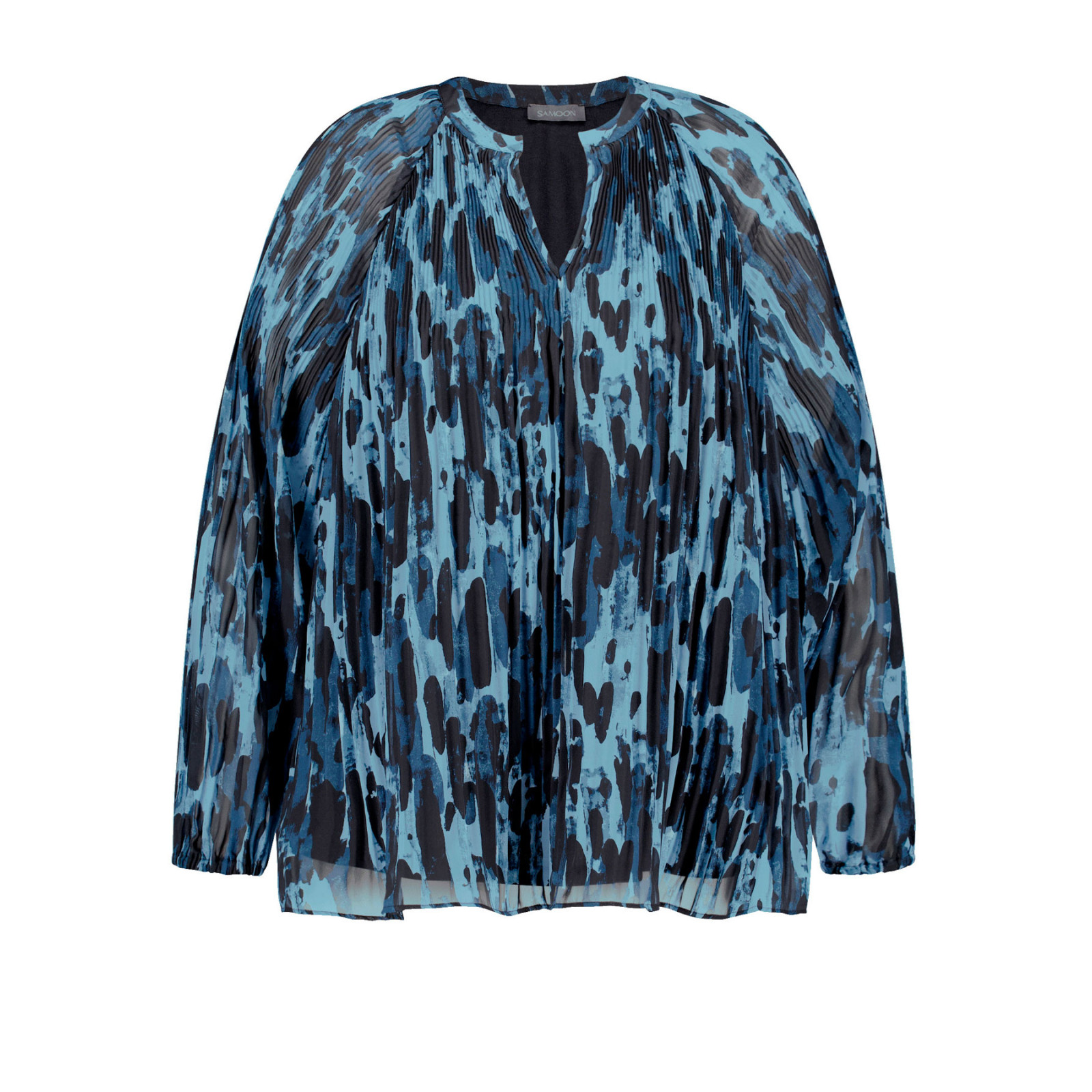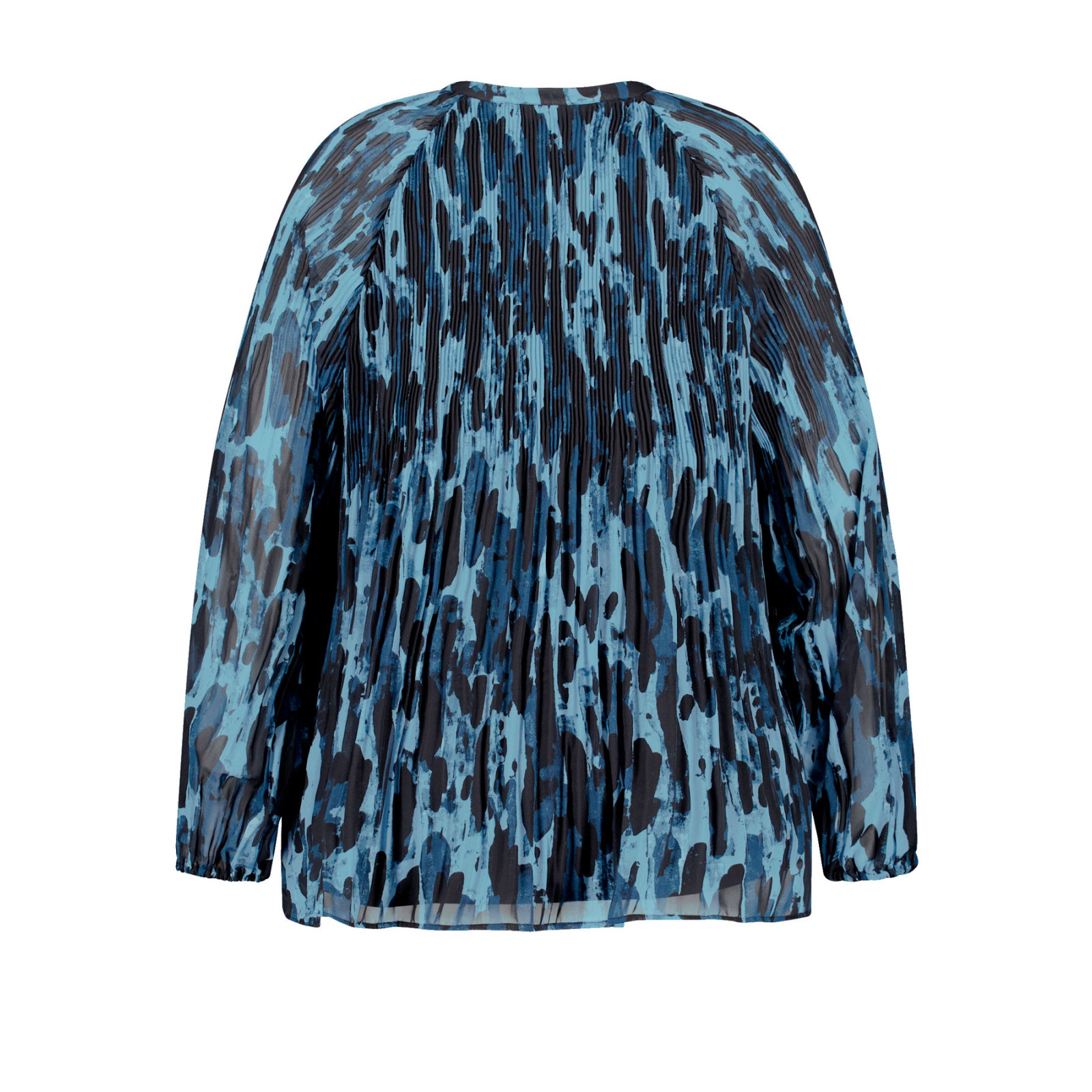 Модель из гофрированного полупрозрачного материала с абстрактным принтм, на подкладке, круграя горловина с разрезом, длинный рукав присобнан на резинку. Состав - 100%полиэстер