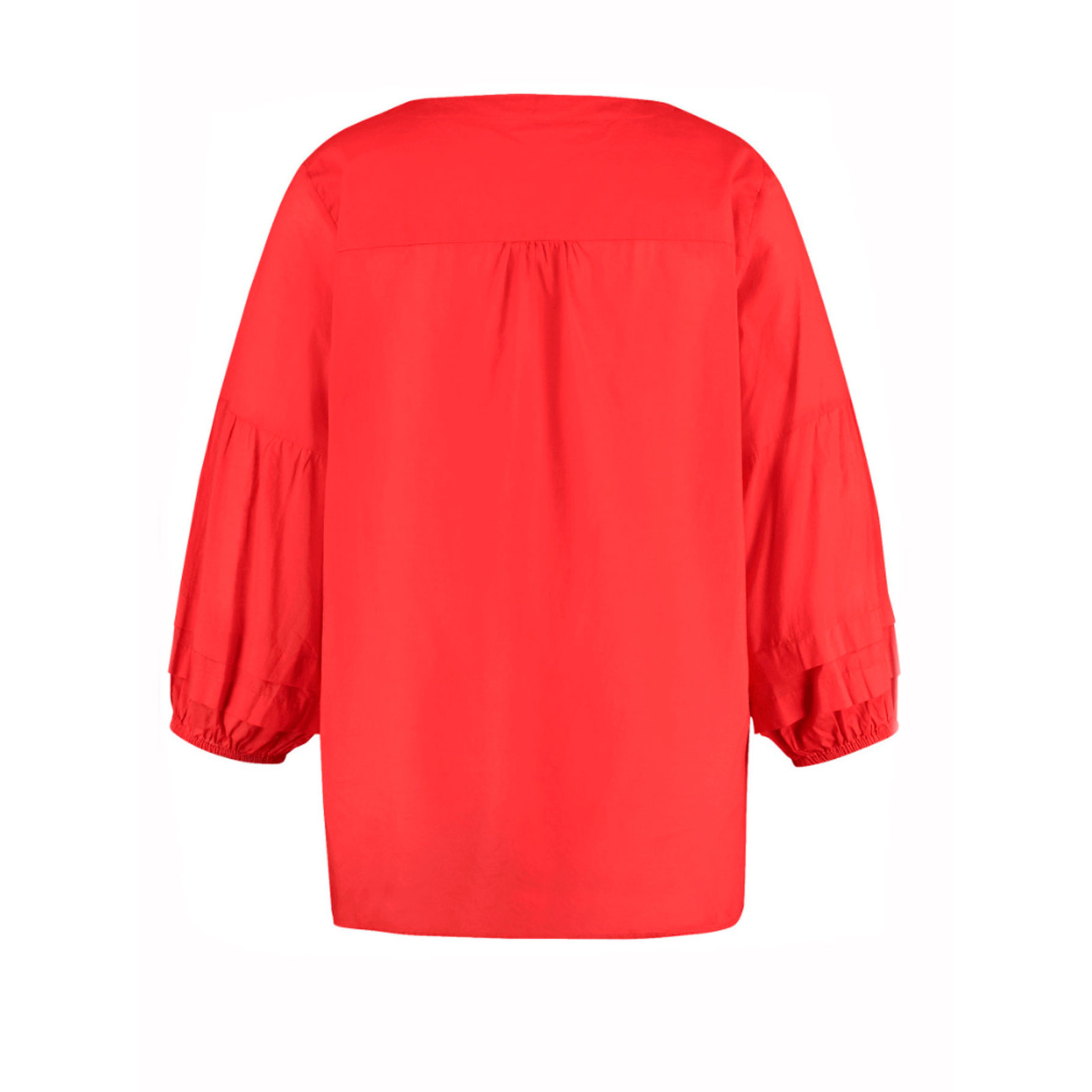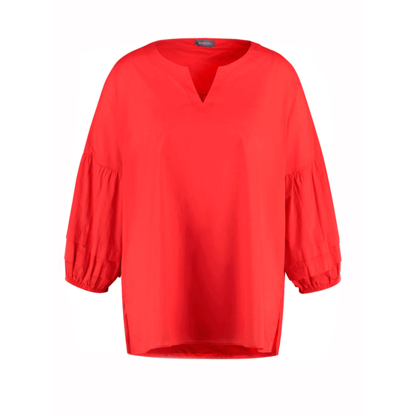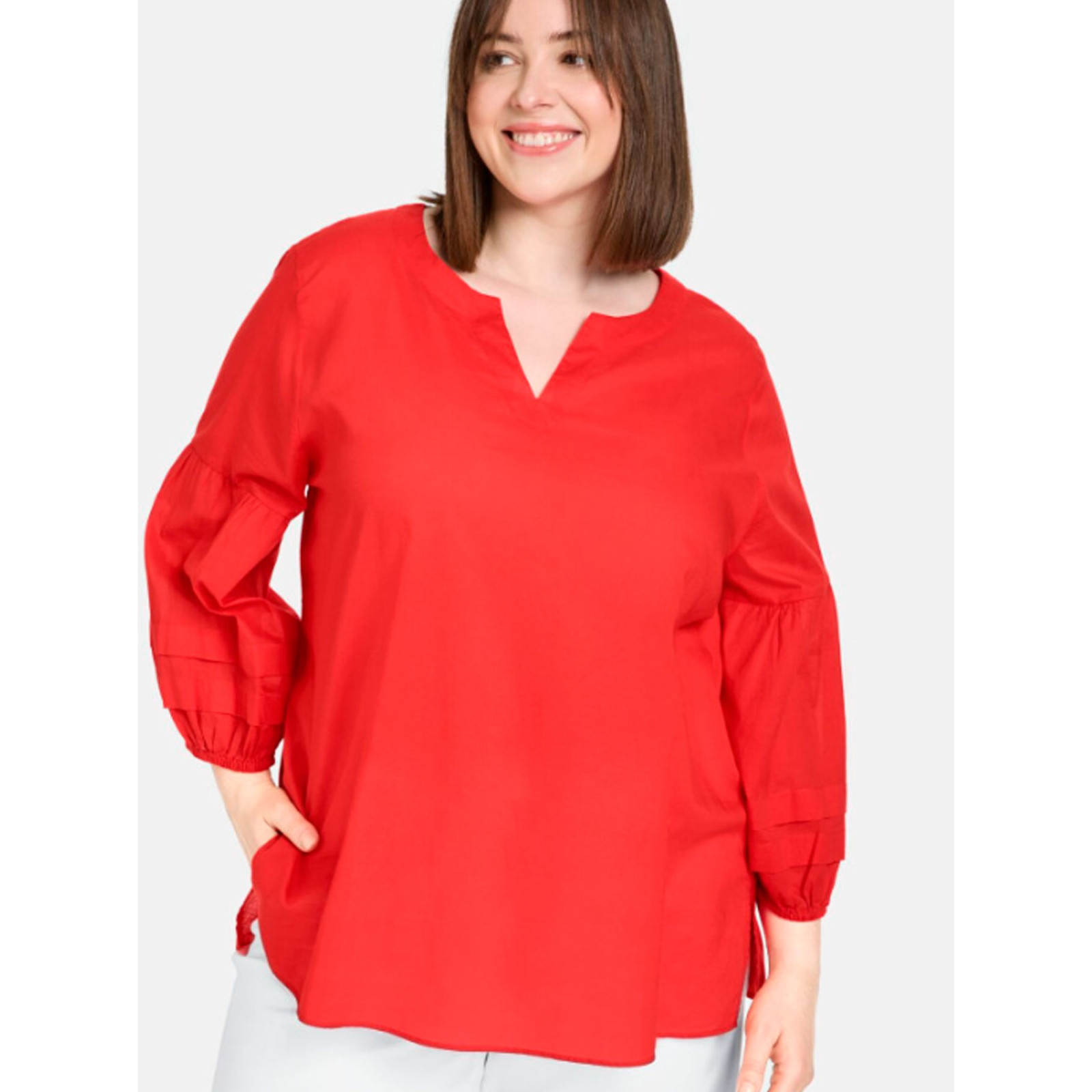 Модель свободного кроя из хлопка, круглая горловина с V-образным вырезом, широкий длинный рукав с защипами присобран на резинку, боковые разрезы. Состав - 100%хлопок