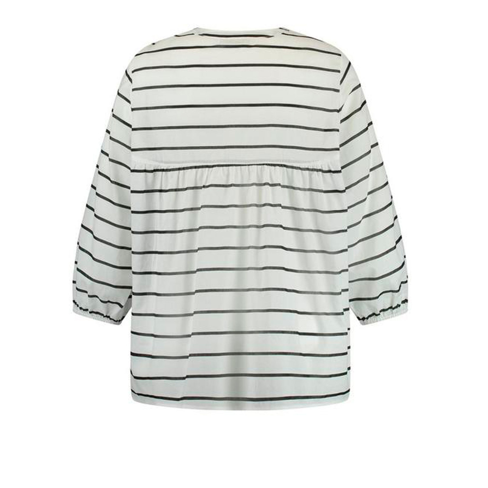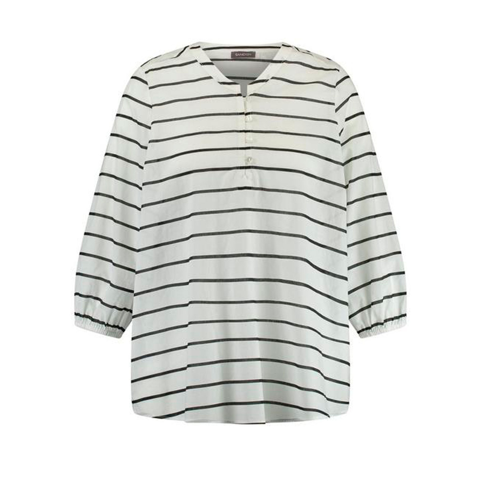 Модель свободного кроя из хлопка в полоску, вырез горловины с разрезом на пуговицах, рукав присобран на резинку. Состав - 100%хлопок