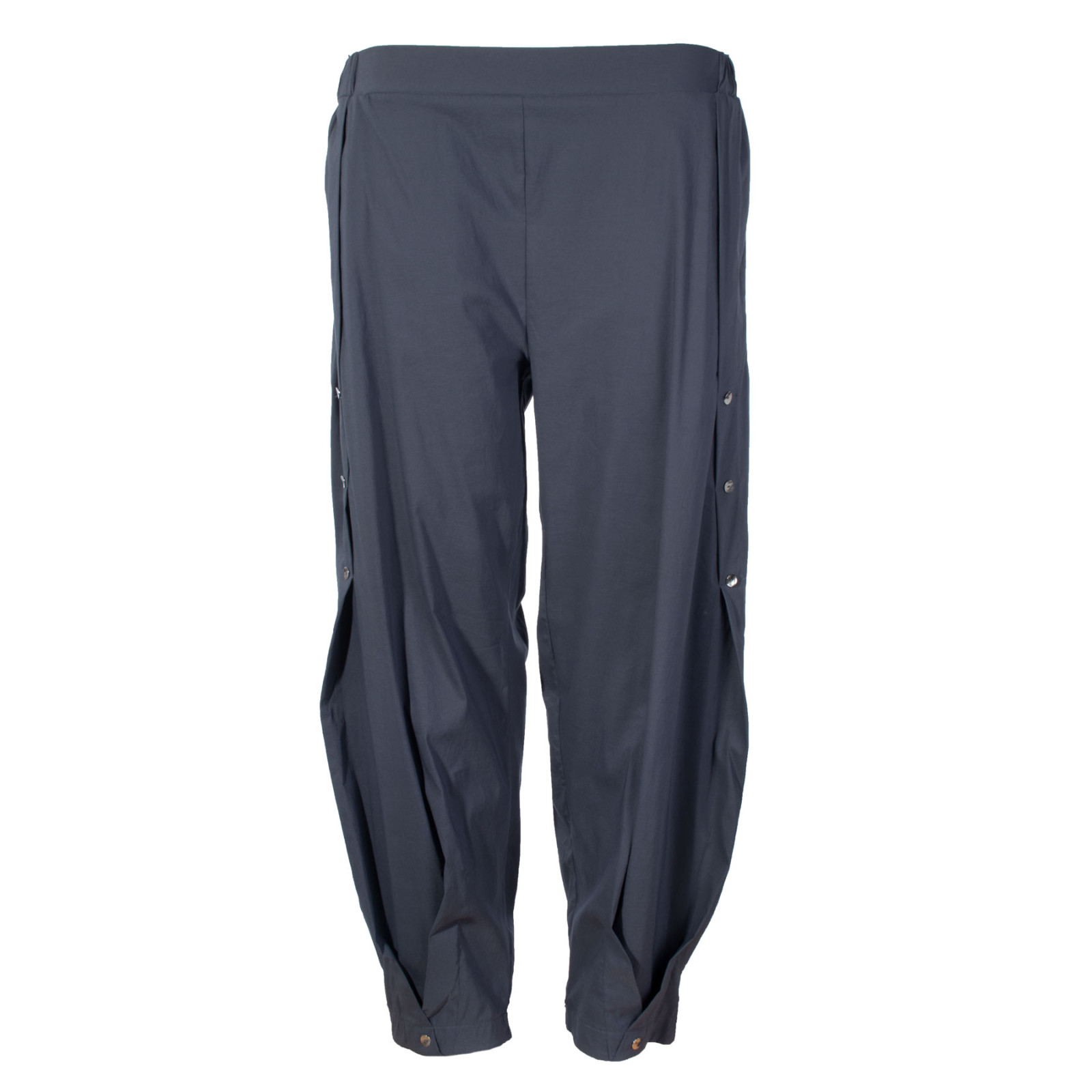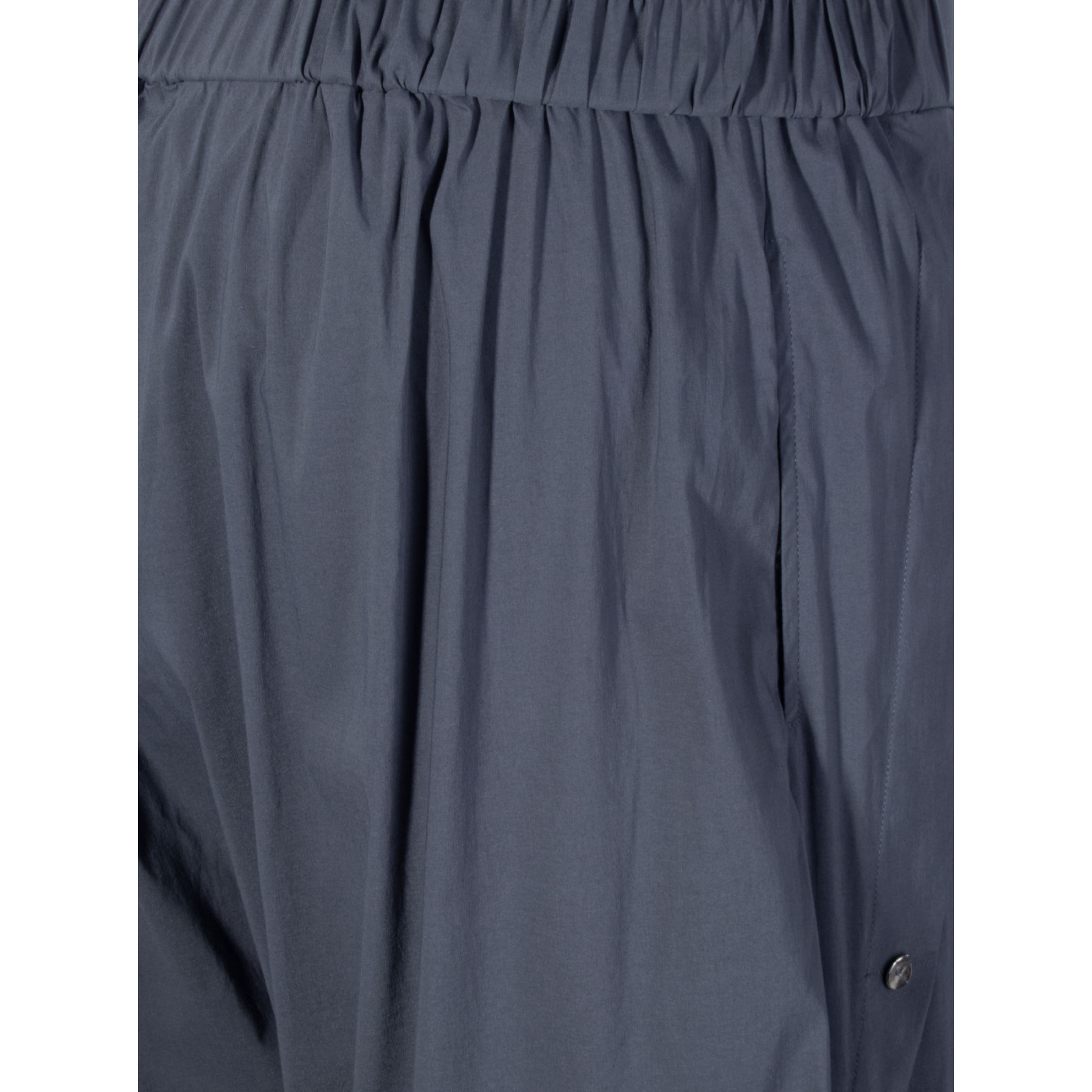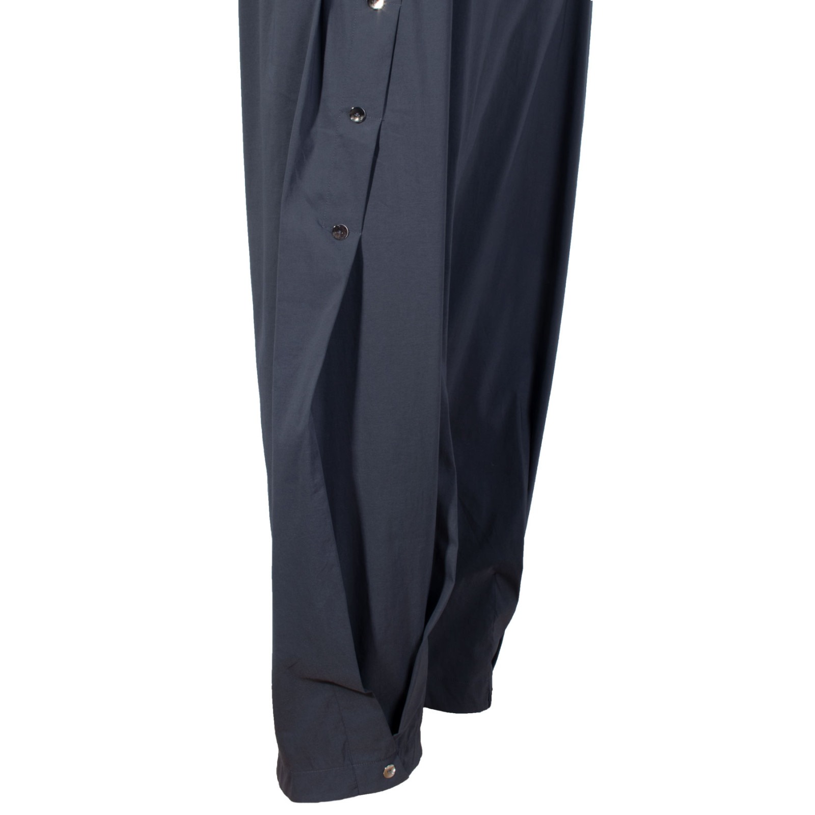 Модель широкого кроя из смесового хлопка, пояс на резинке, защипы с пуговицами по бокам и по нижнему краю, карманы. Состав - 74% хлопок, 23% полиамид, 3% эластан