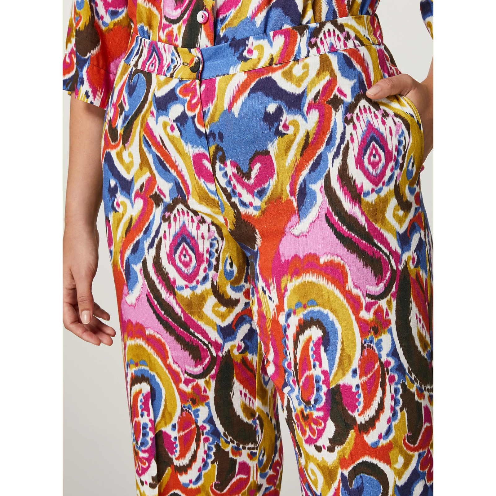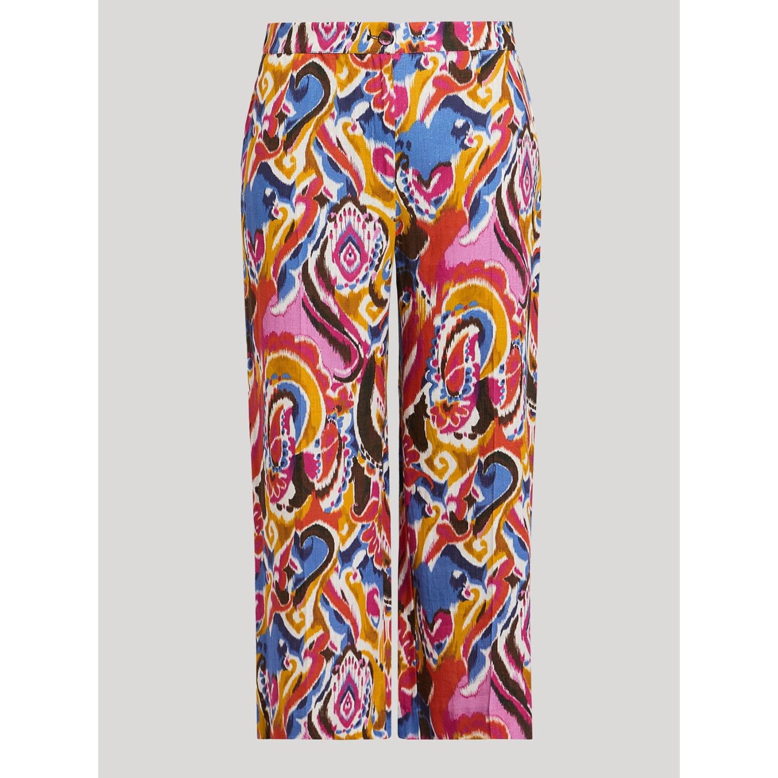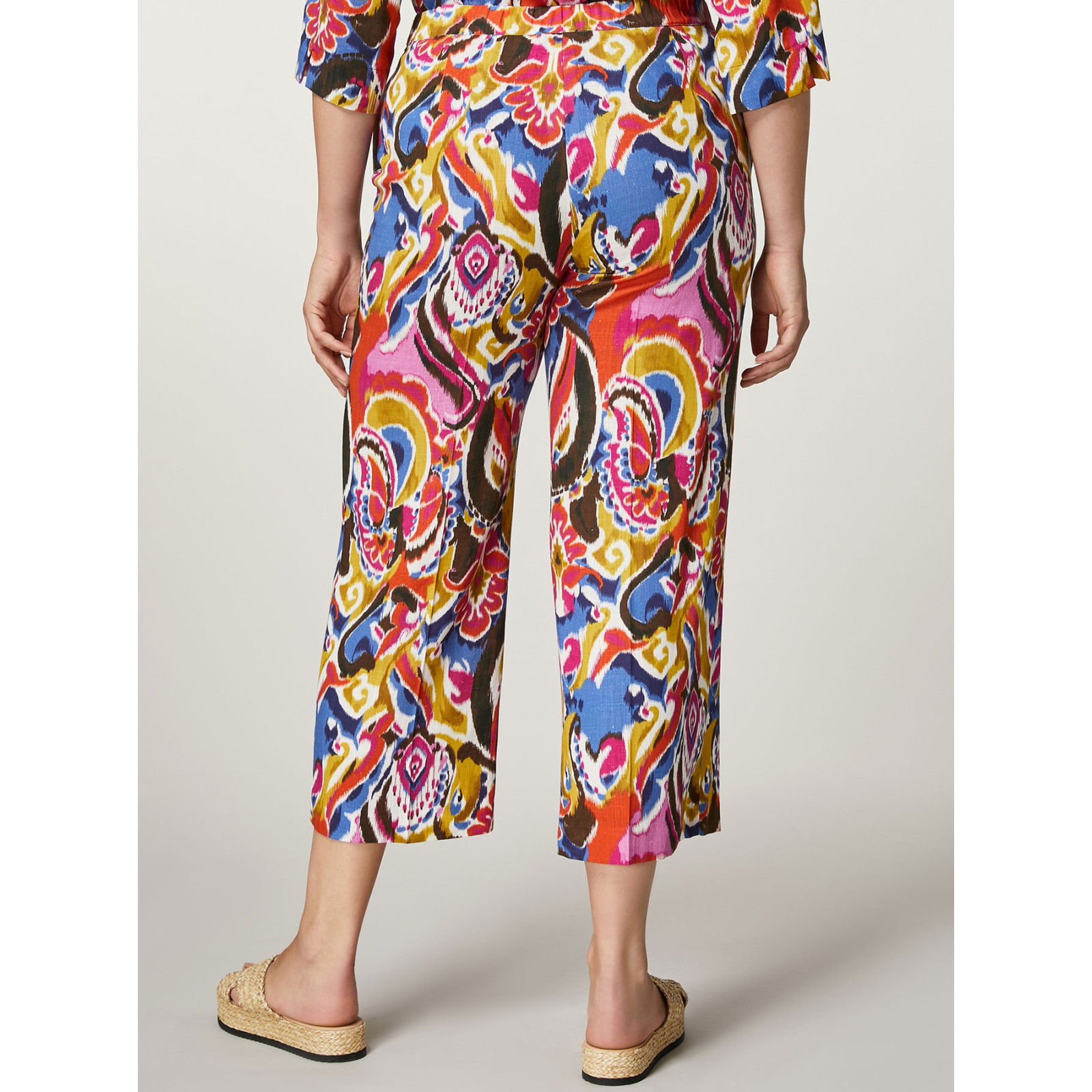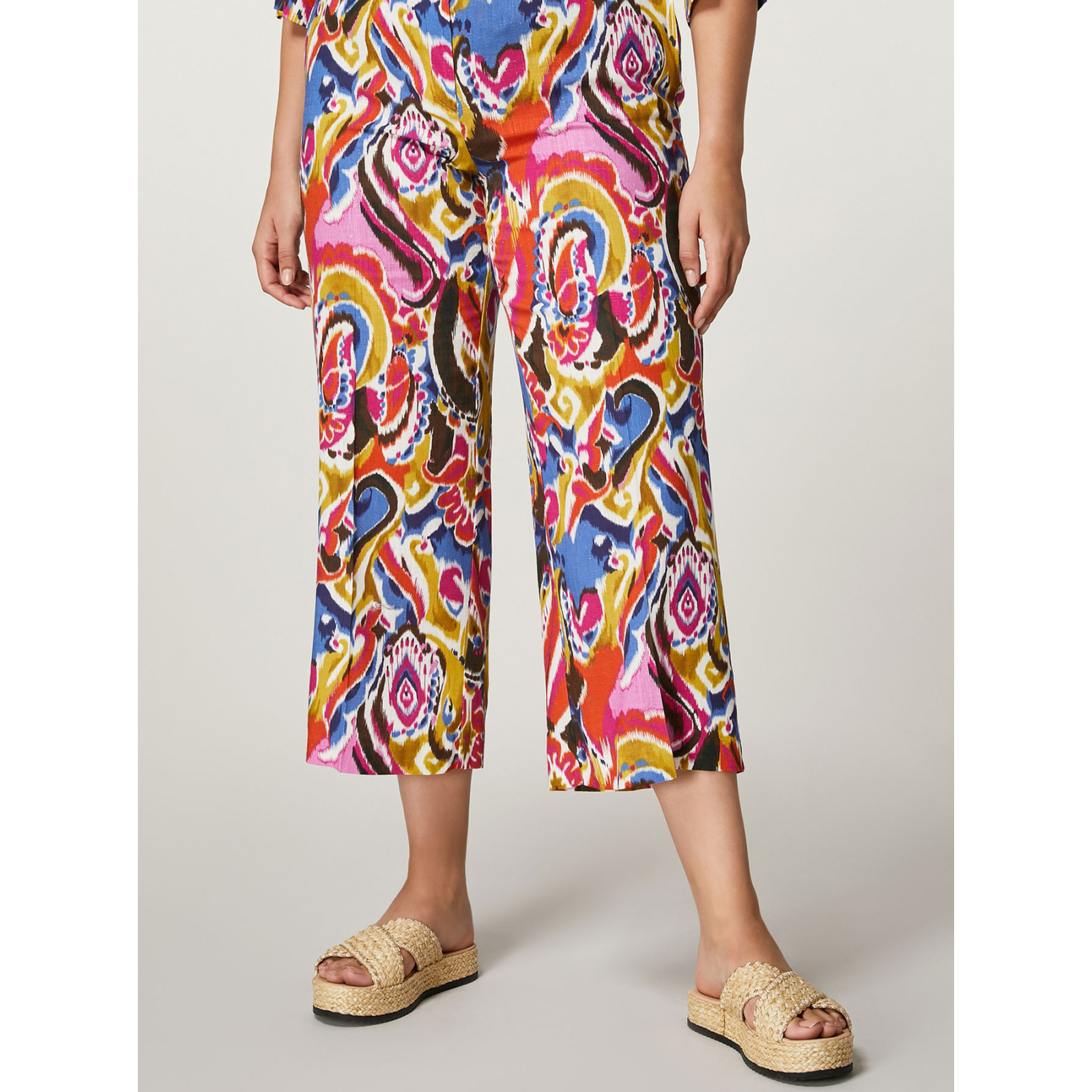 Укороченная модель из смесовой вискозы с восточным принтом, широкий крой, пояс сзади на резинке, застежка на молнии, боковые карманы. Состав - 81%вискоза, 19%эластан