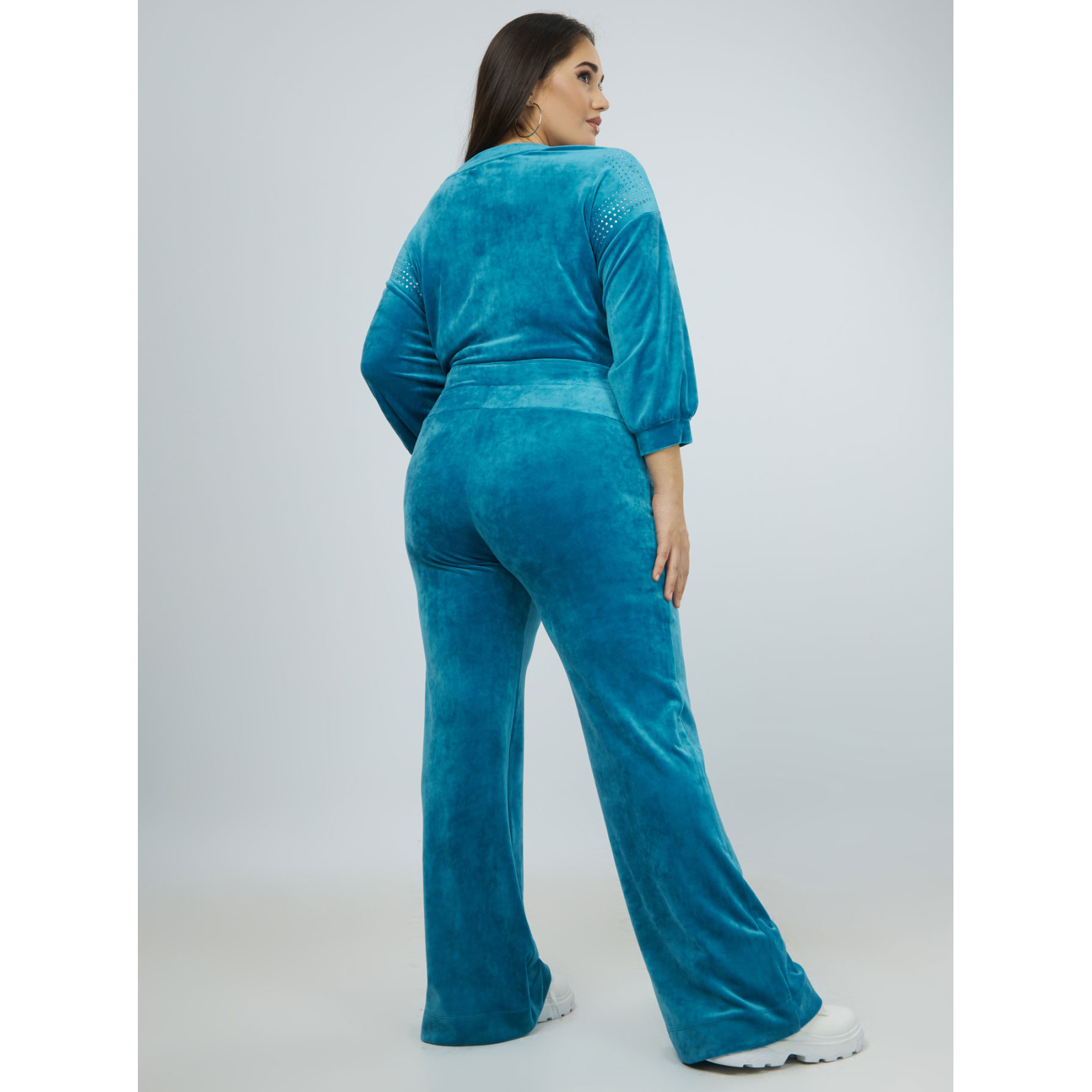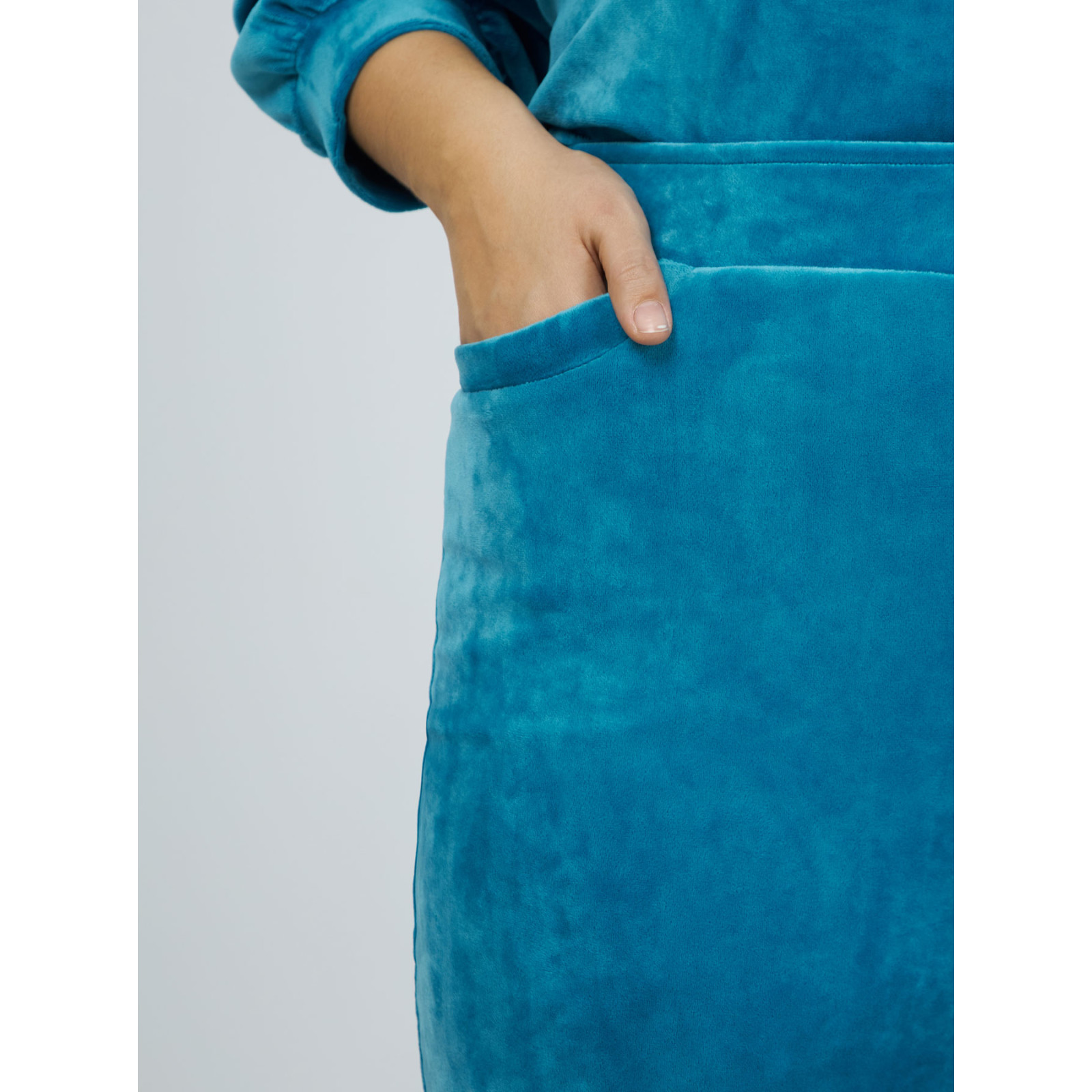 Модель широкогог кроя из велюрового материала, пояс на эластичной резинке, без застежек, боковые карманы. Состав - 92%полиэстер, 8%эластан